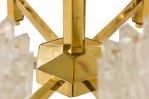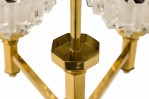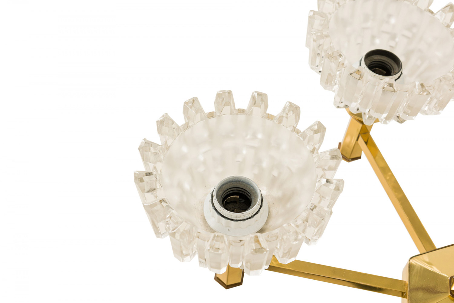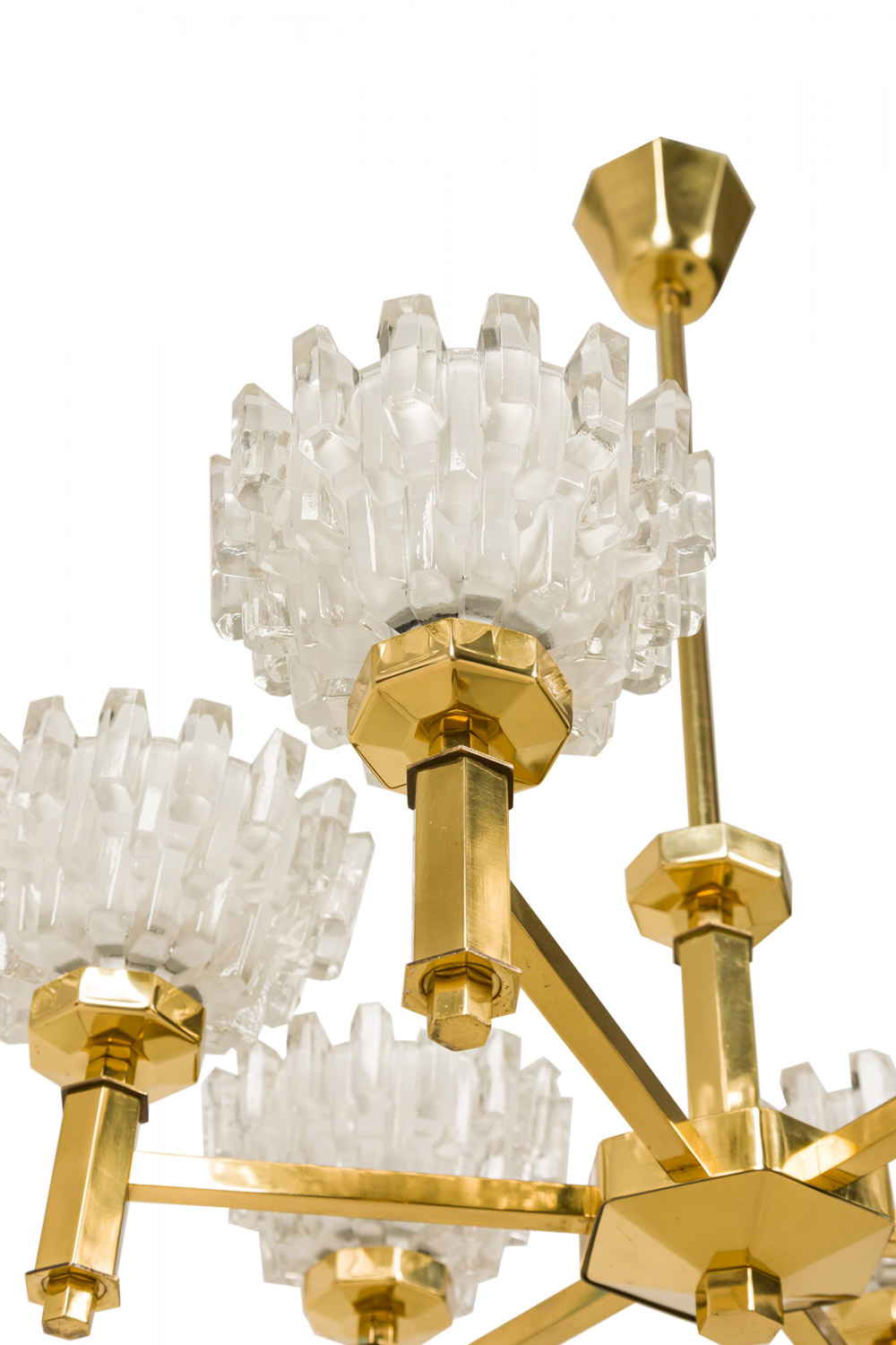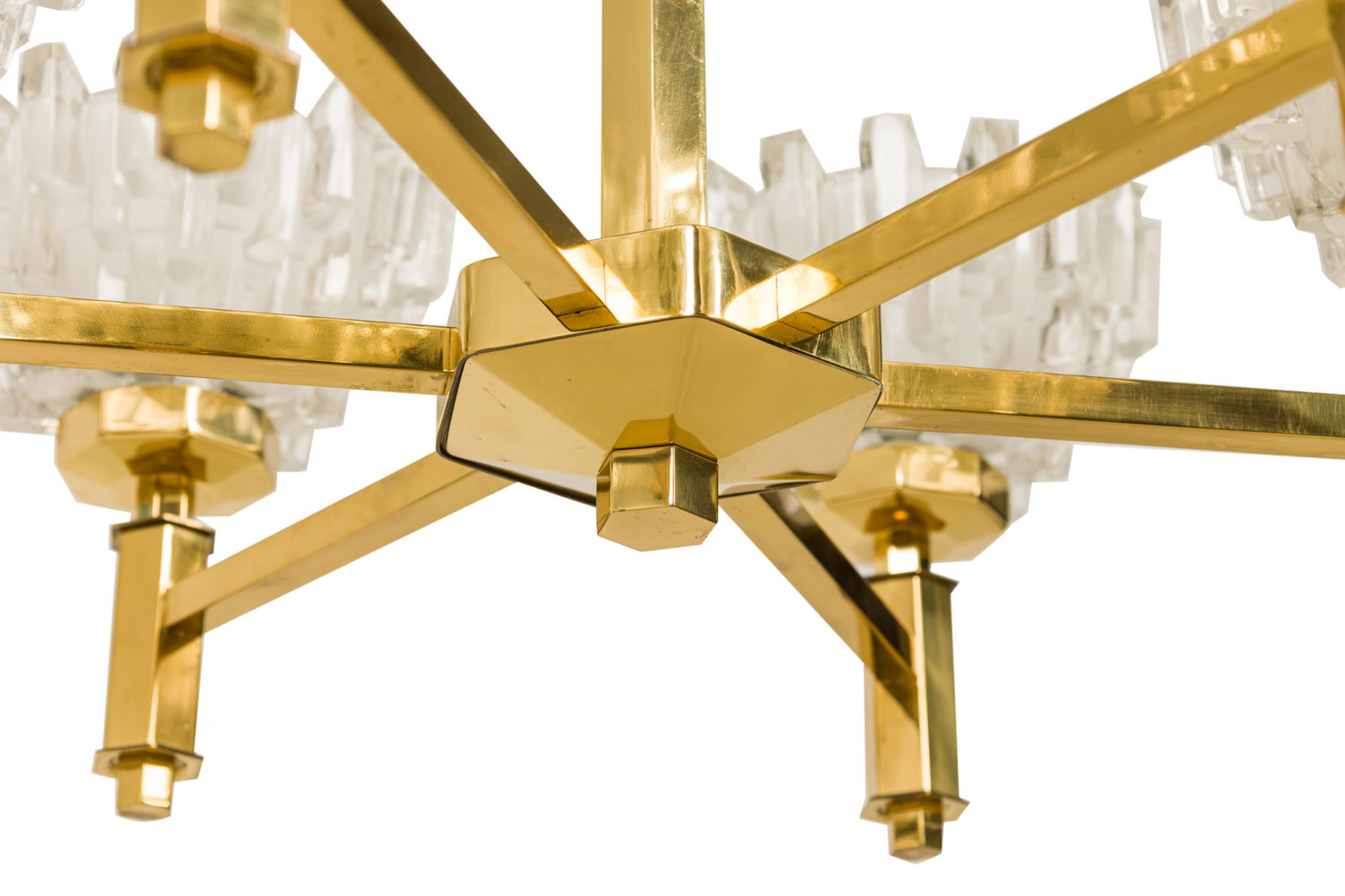 2 Swedish Mid-Century brass chandeliers with six arms topped with chunky thick geometric cut frosted glass shades. (HANS-AGNE JAKOBSSON)(PRICED EACH)