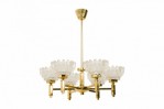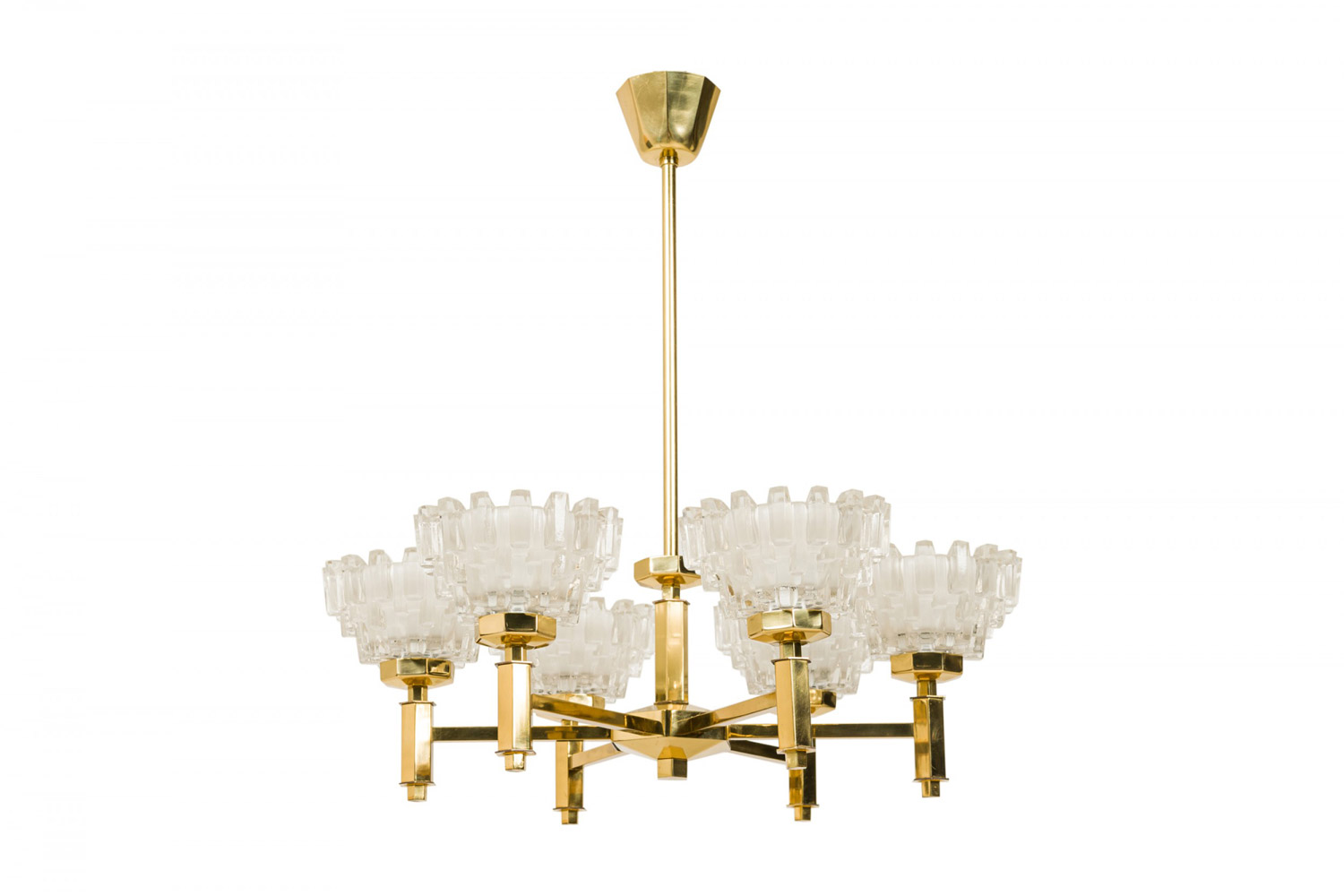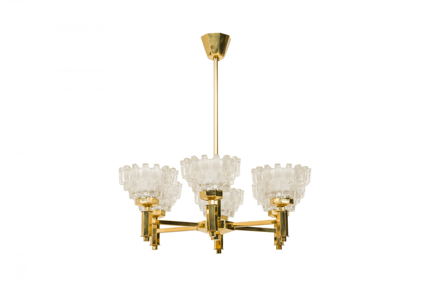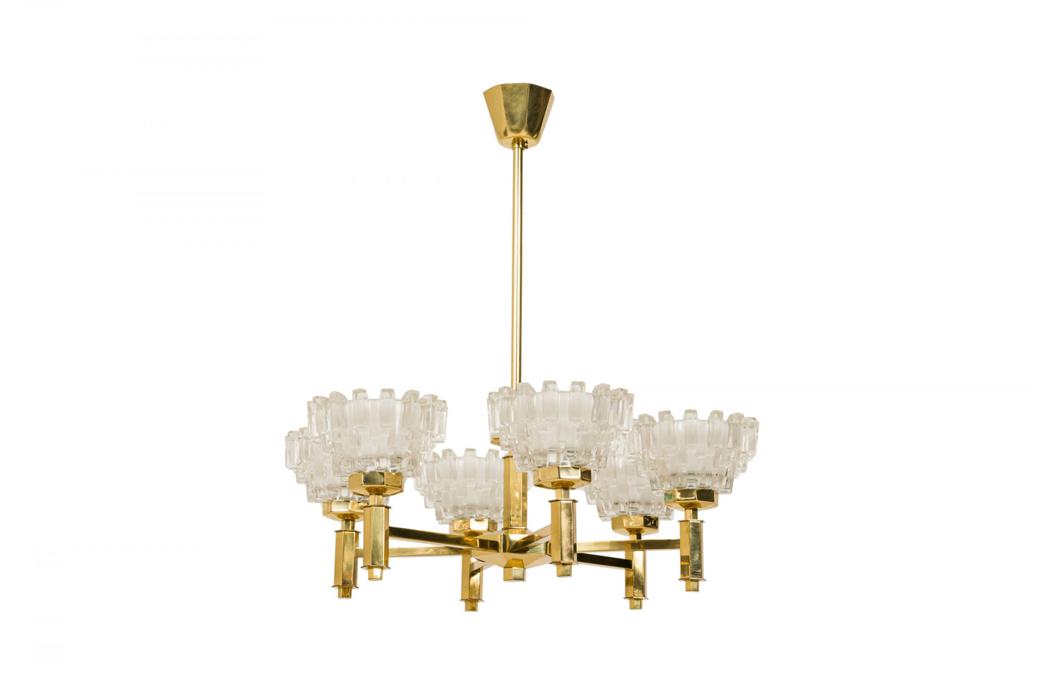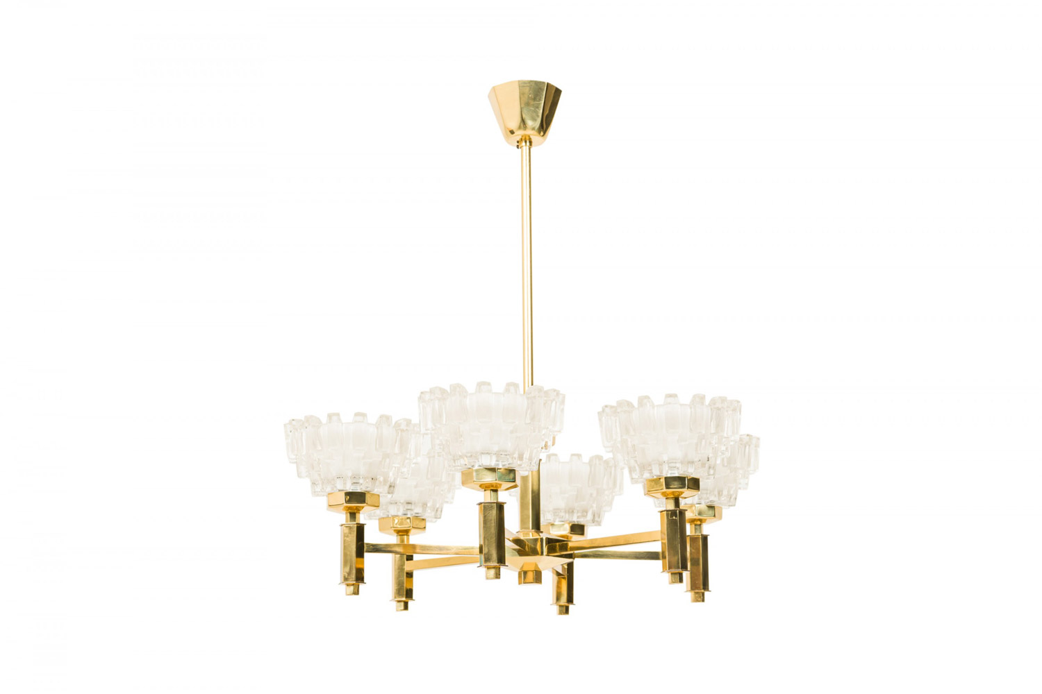 2 Swedish Mid-Century brass chandeliers with six arms topped with chunky thick geometric cut frosted glass shades. (HANS-AGNE JAKOBSSON)(PRICED EACH).
