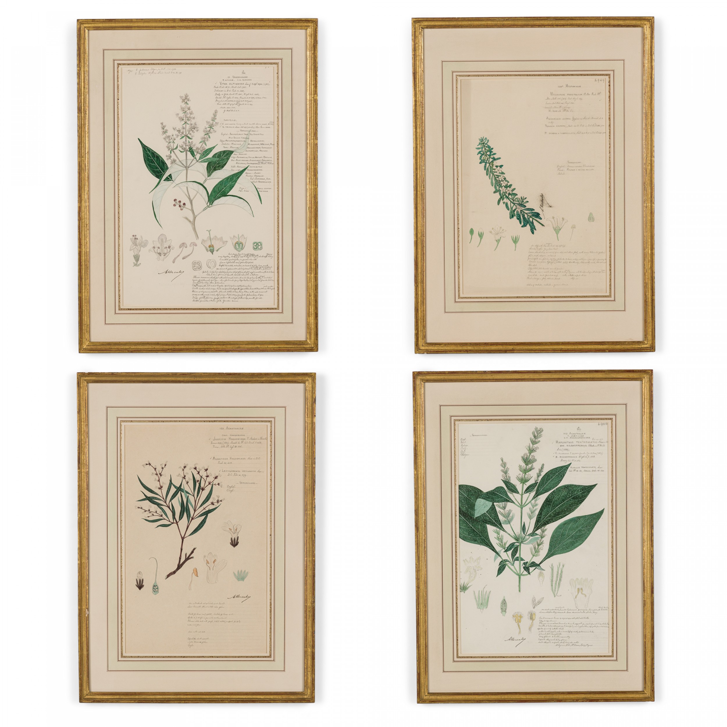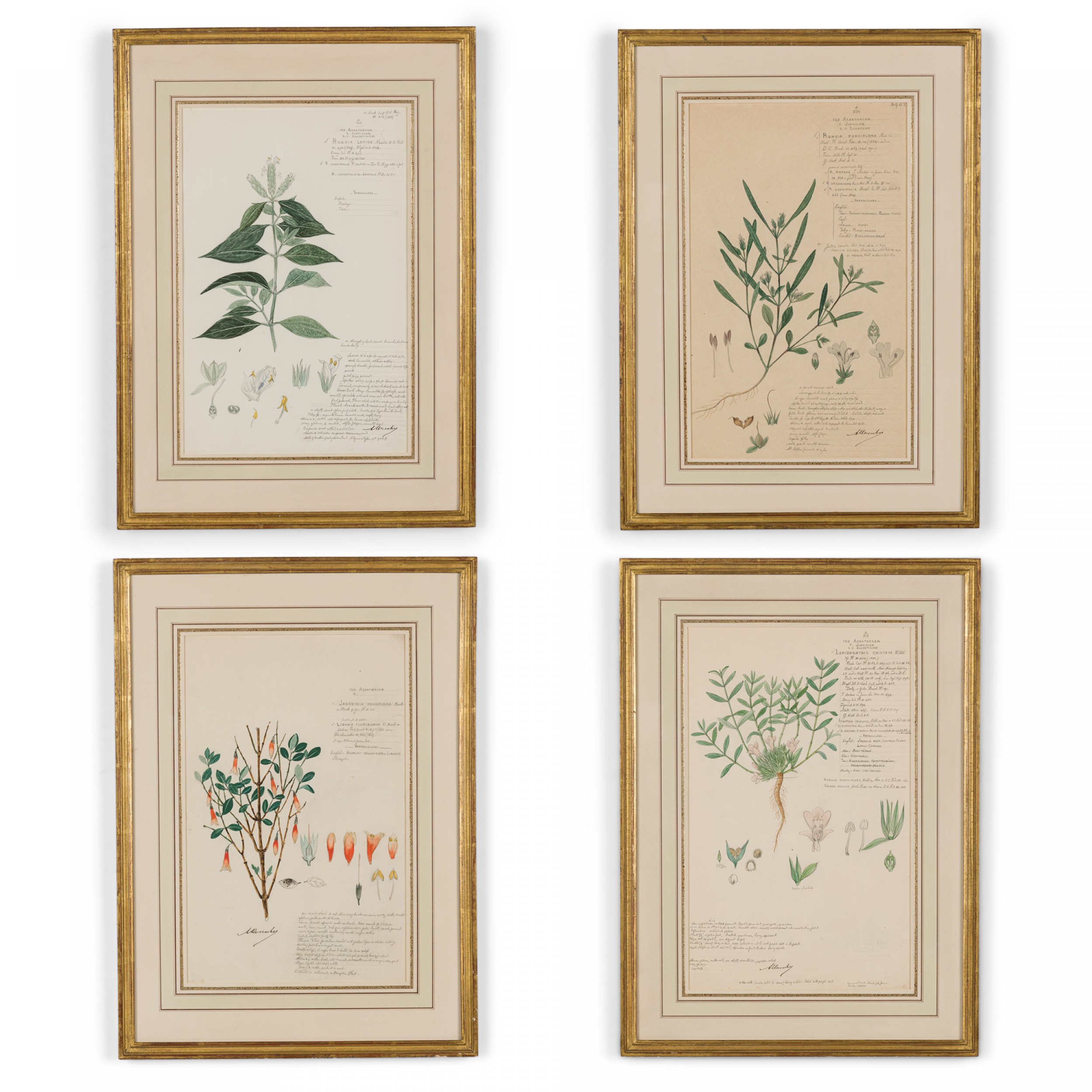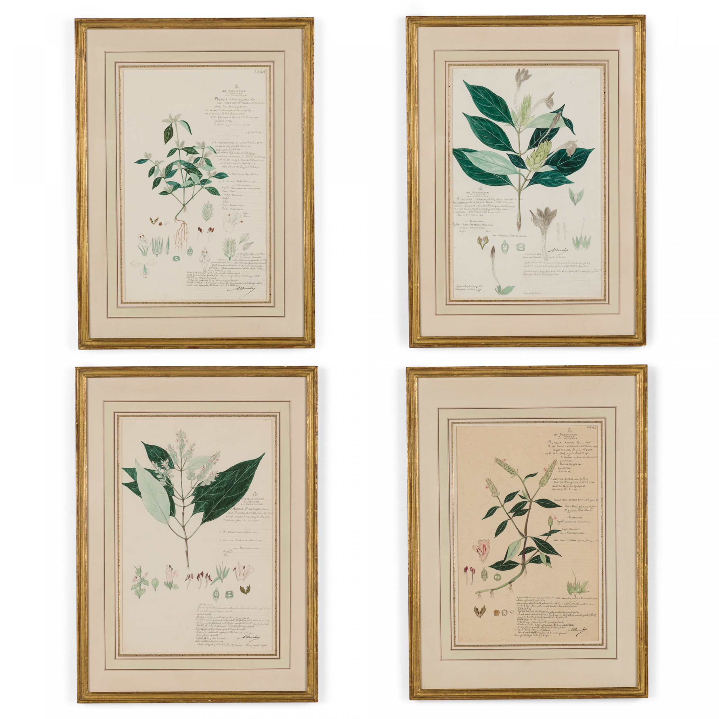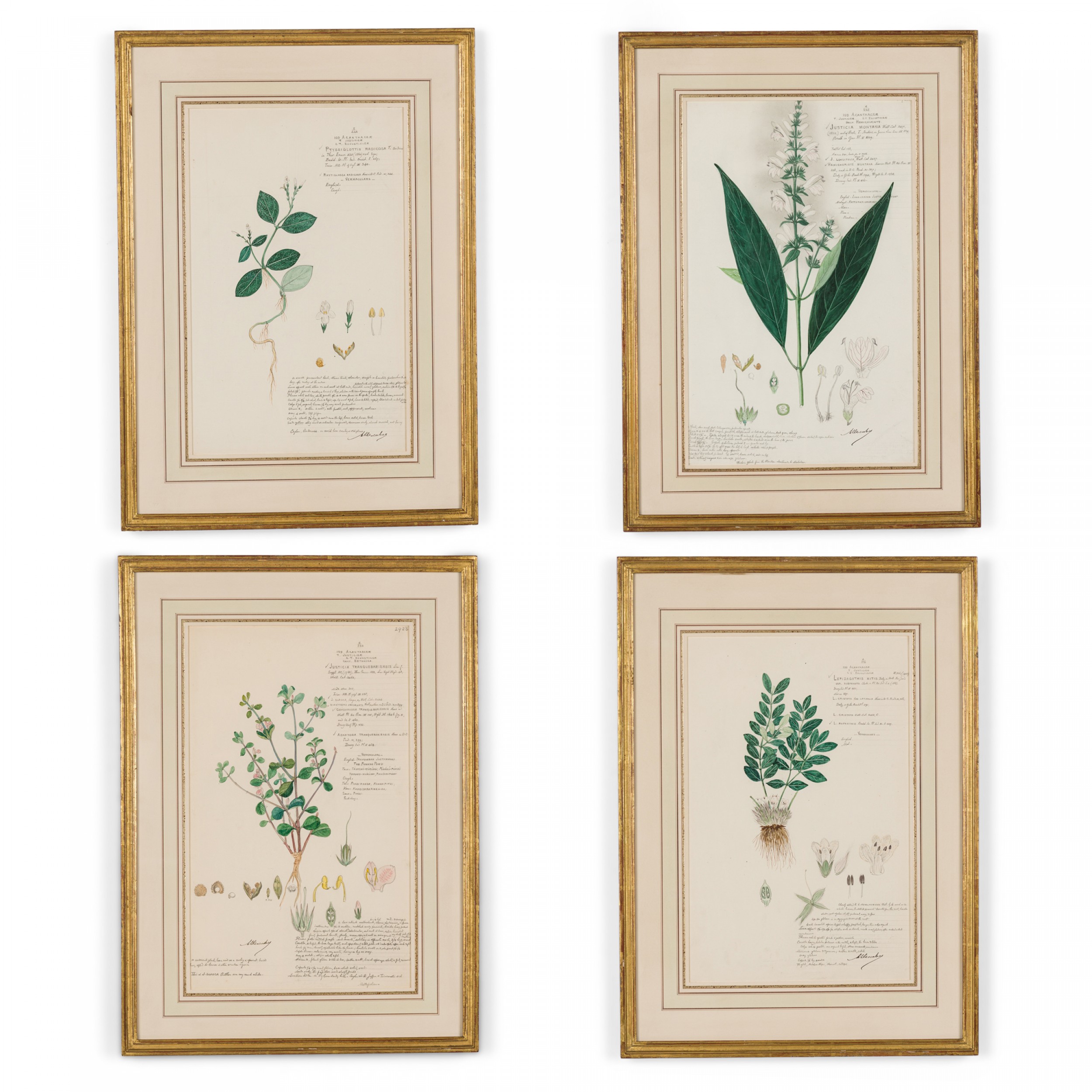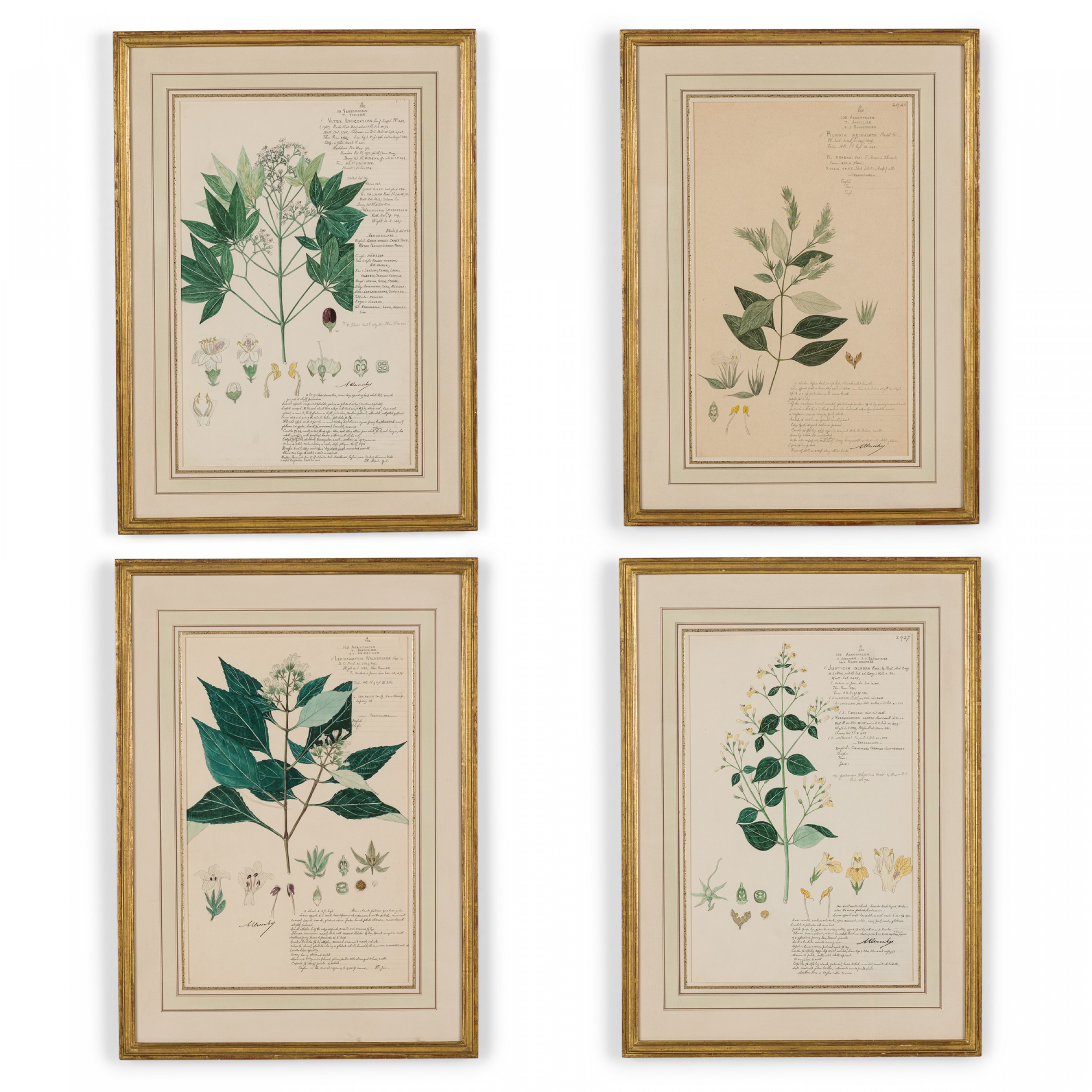 49 American Victorian (19th Century) watercolor, ink, and pencil botanical drawings depicting various plants and flowers in green tones against a beige background, with pencil notes, matted in beveled parcel gilt painted wooden frames. (PRICED EACH)(For individual listings, please see items: 063654-063700)