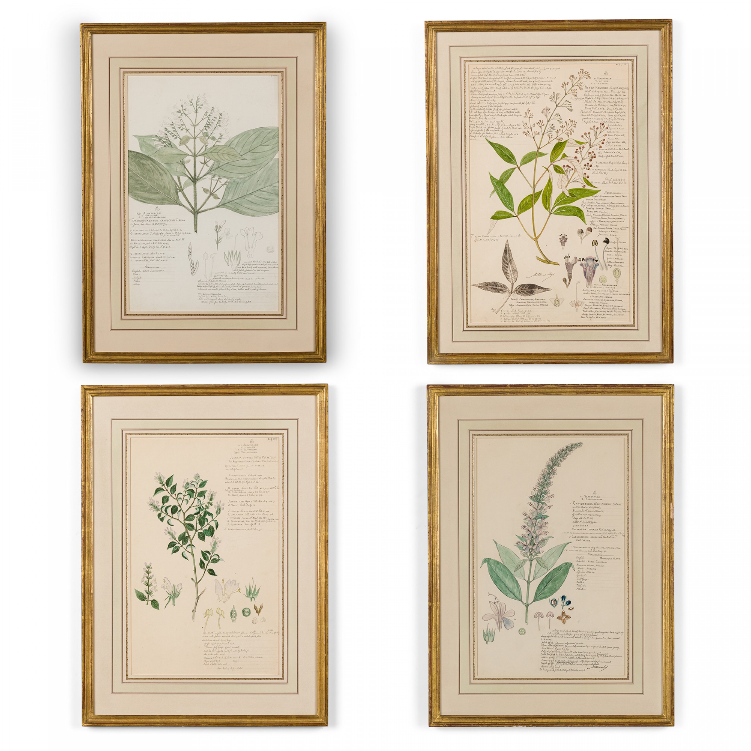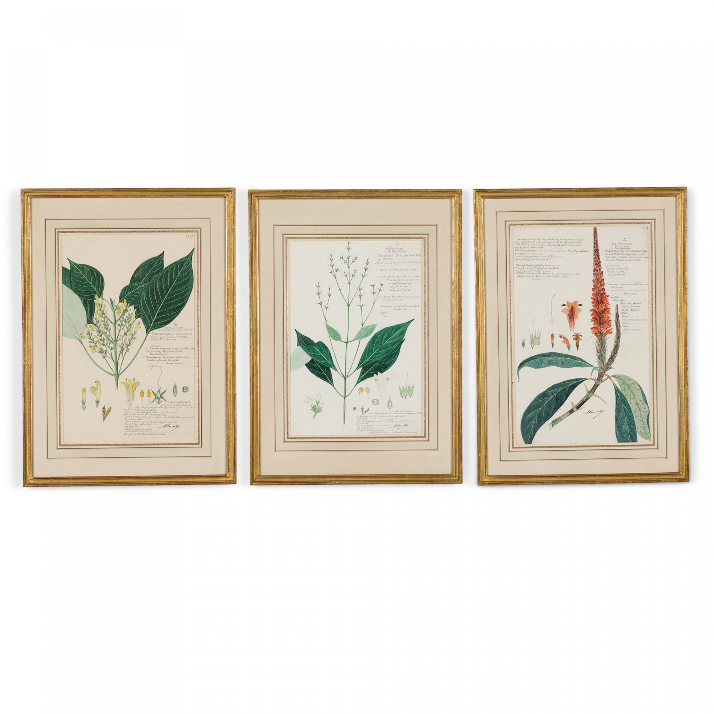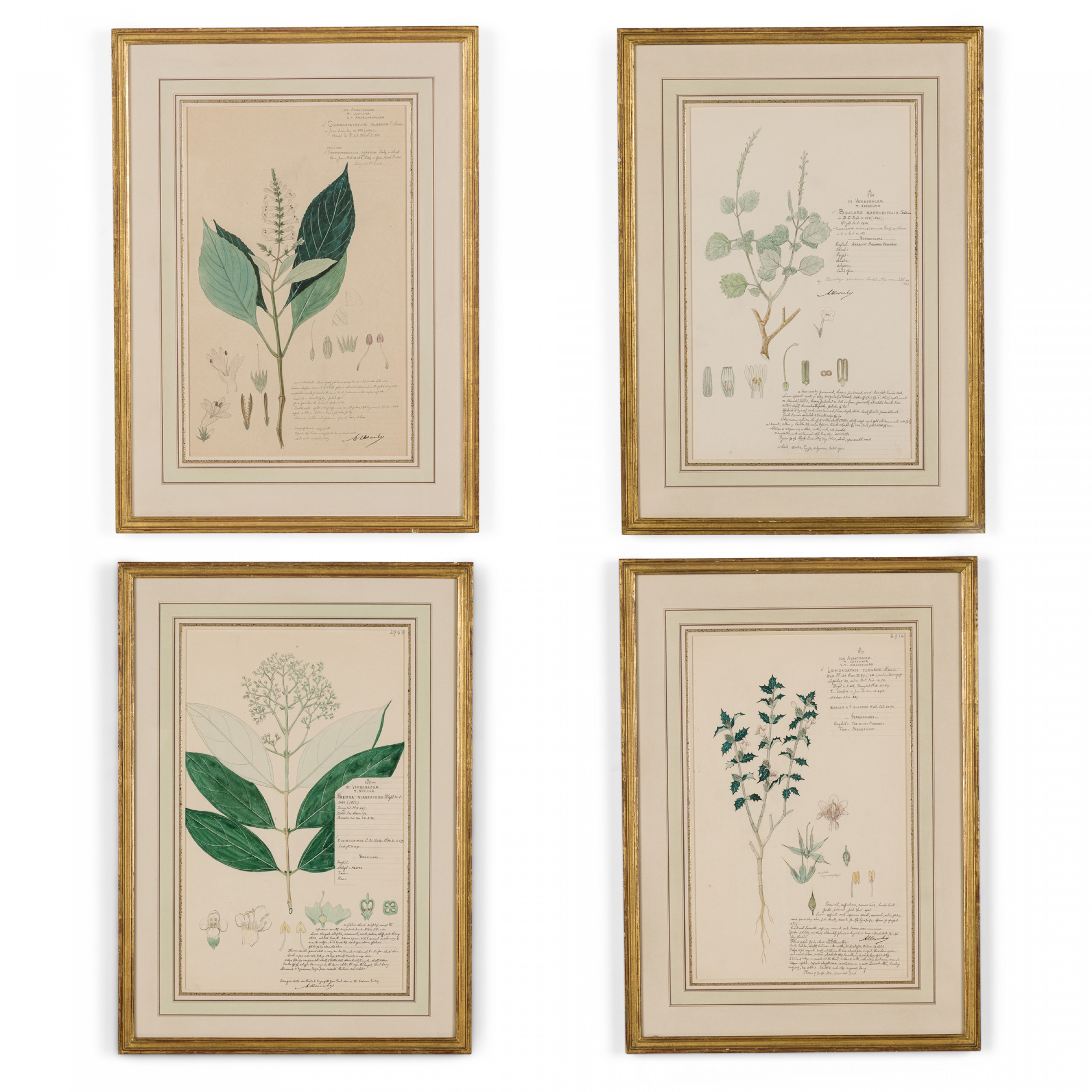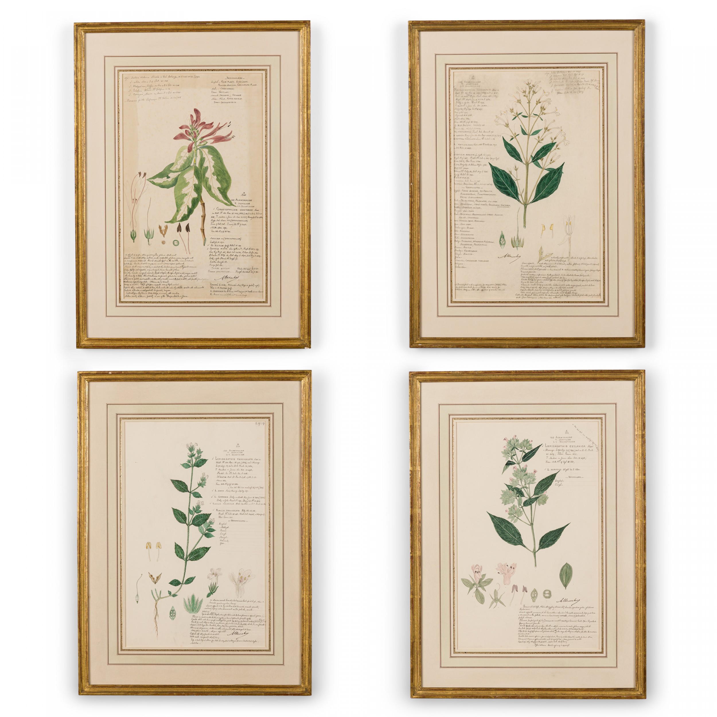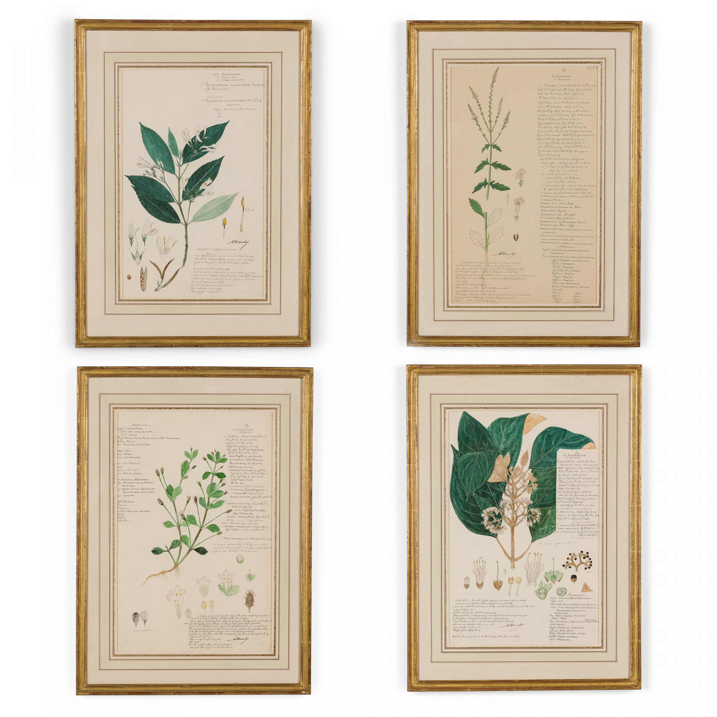 49 American Victorian (19th Century) watercolor, ink, and pencil botanical drawings depicting various plants and flowers in green tones against a beige background, with pencil notes, matted in beveled parcel gilt painted wooden frames. (PRICED EACH)(For individual listings, please see items: 063654-063700)