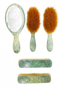 5-Piece Art Deco green shagreen brush set (4 brushes, 1 hand mirror) (PRICED AS SET)