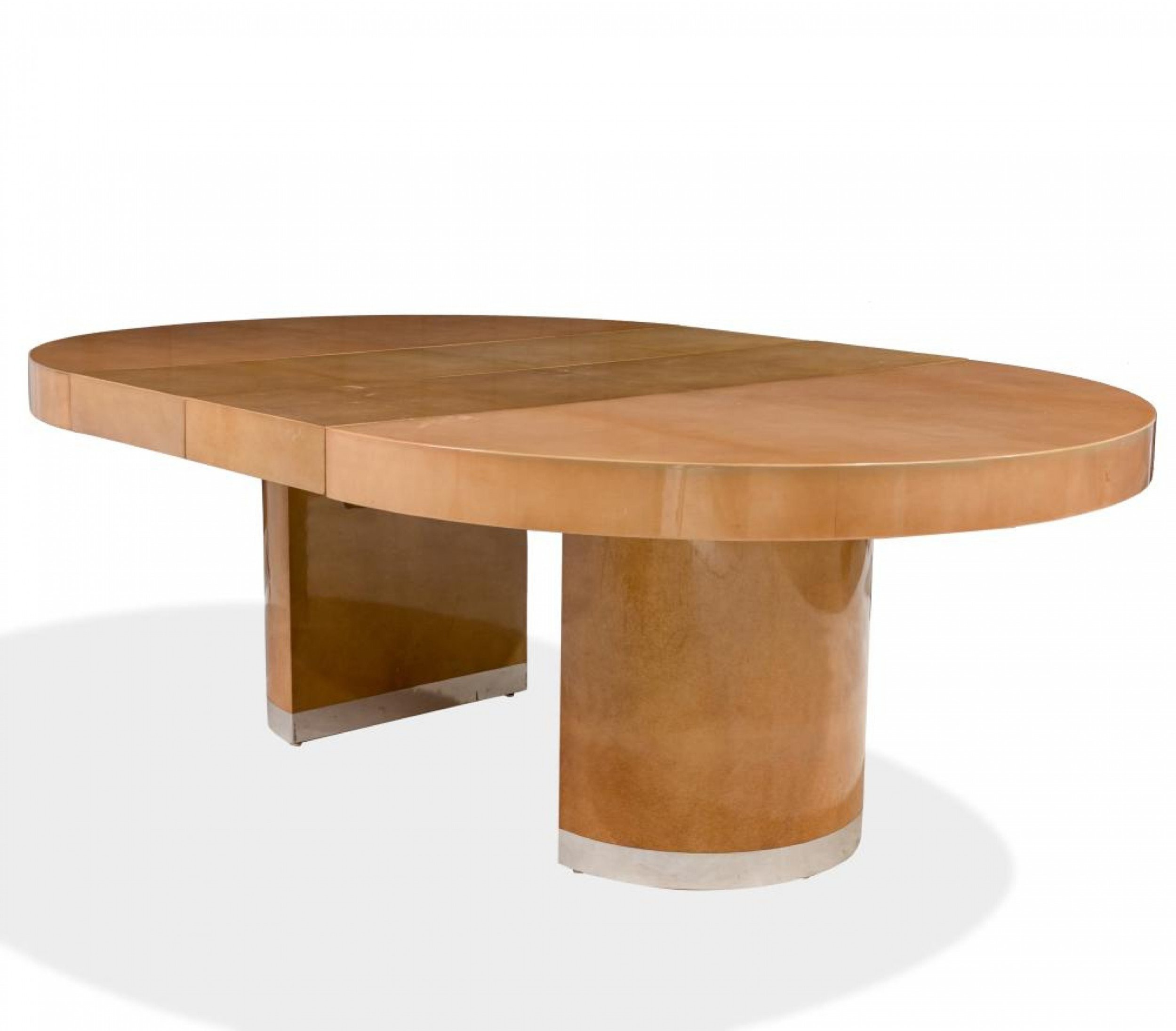 Italian Mid-Century circular goatskin center table with circular pedestal base with silver metal veneer and an expandable table top with two leaves. (leaves: 16" each) (ALDO TURA).