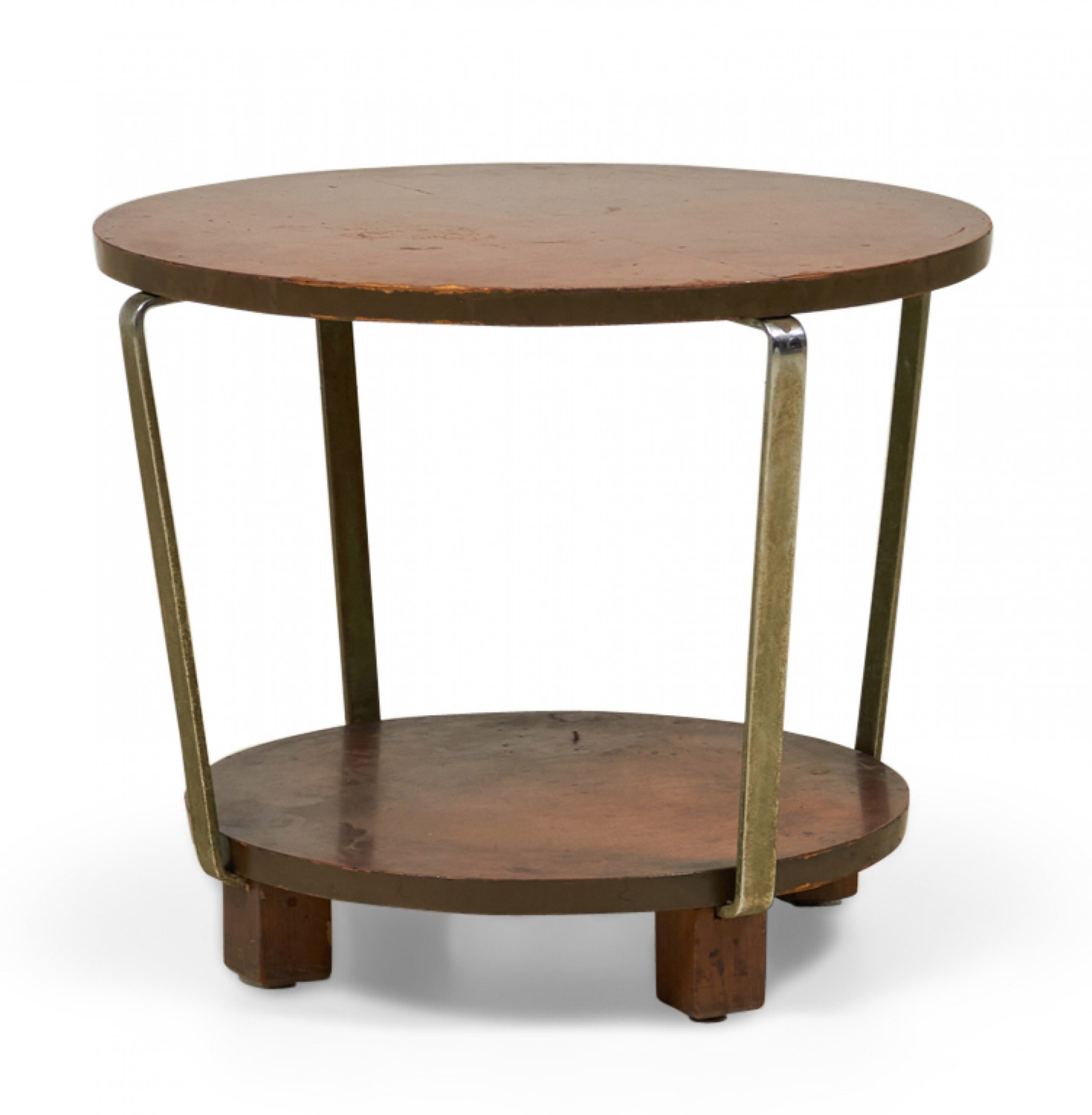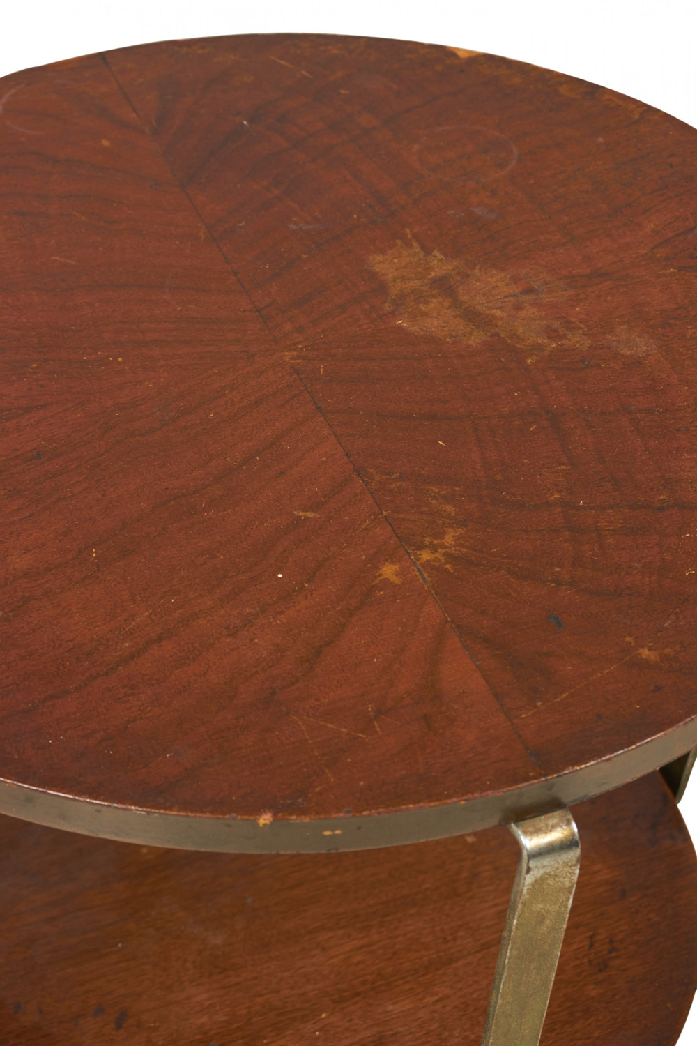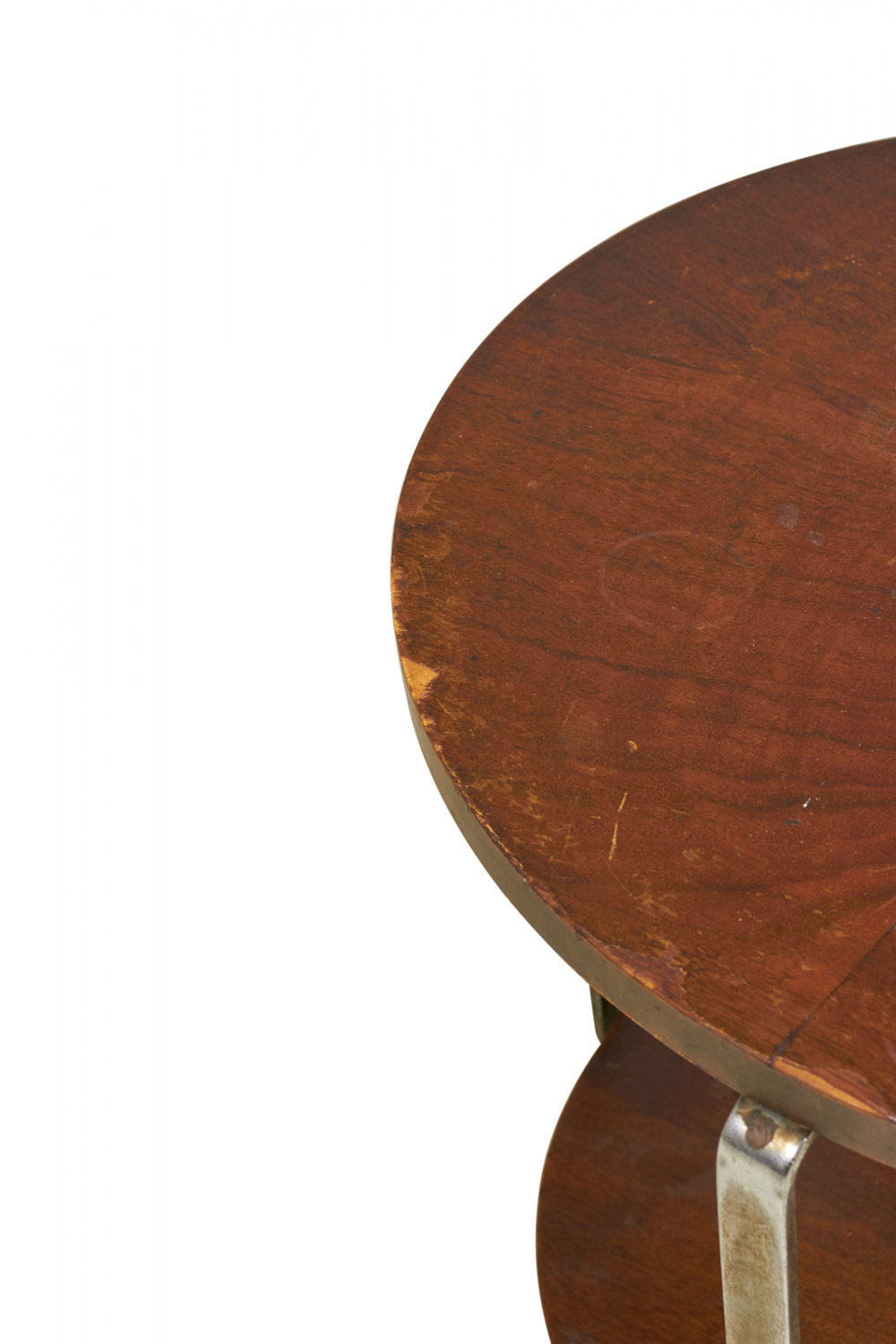 American Art Deco circular walnut table with four nickel-plated steel supports that angle inward to connect to a smaller bottom shelf resting on four square walnut feet..