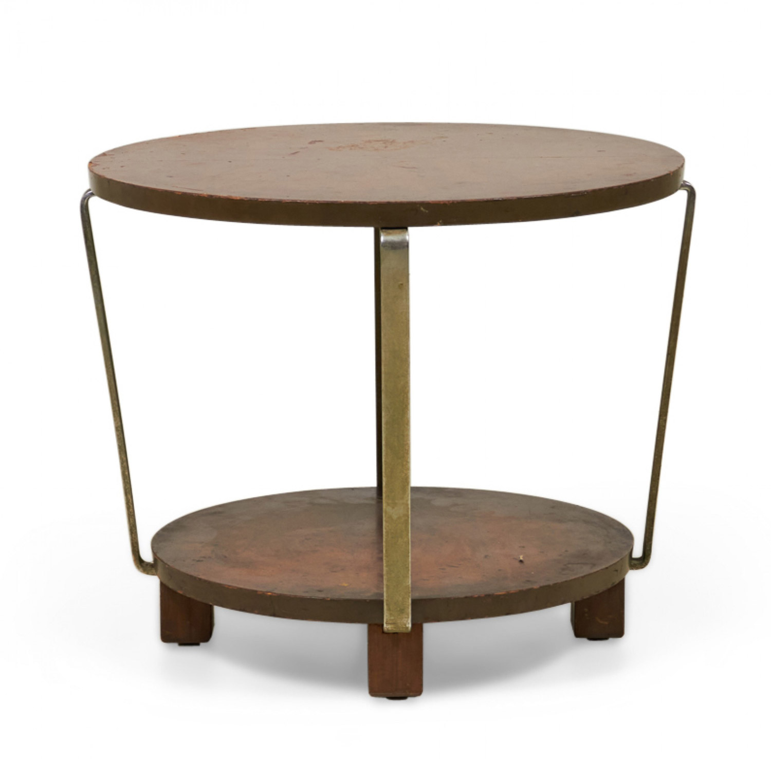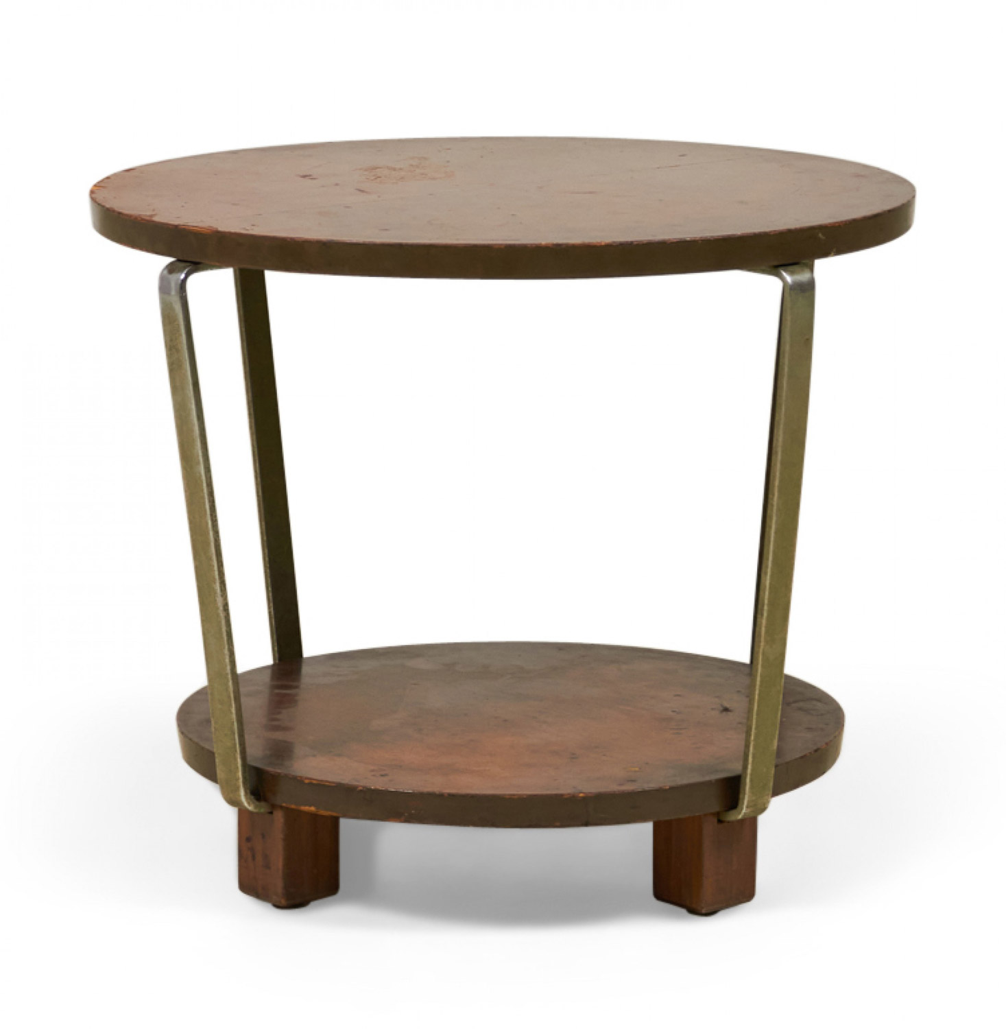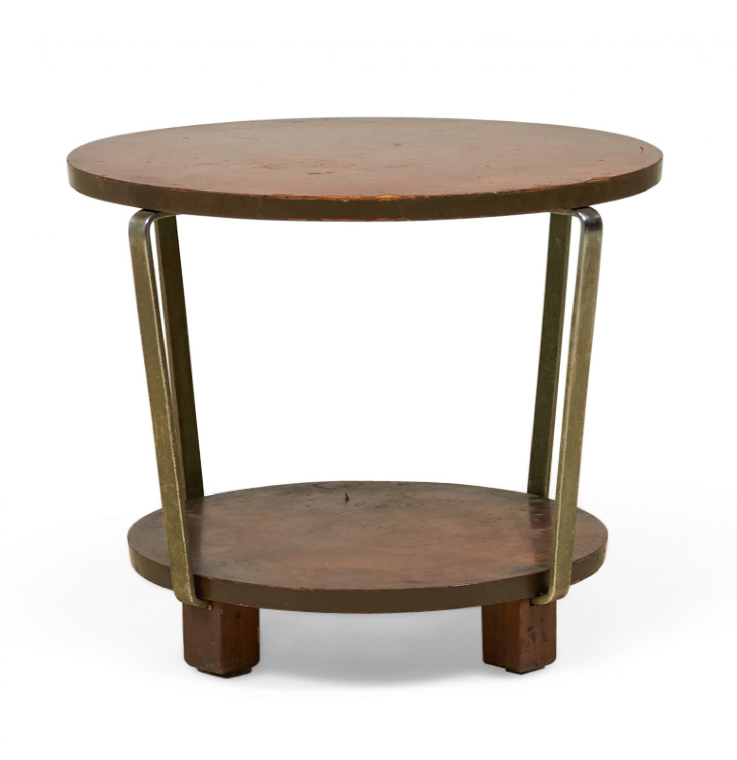American Art Deco circular walnut table with four nickel-plated steel supports that angle inward to connect to a smaller bottom shelf resting on four square walnut feet..