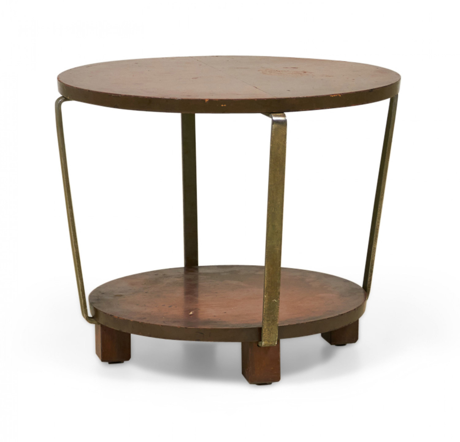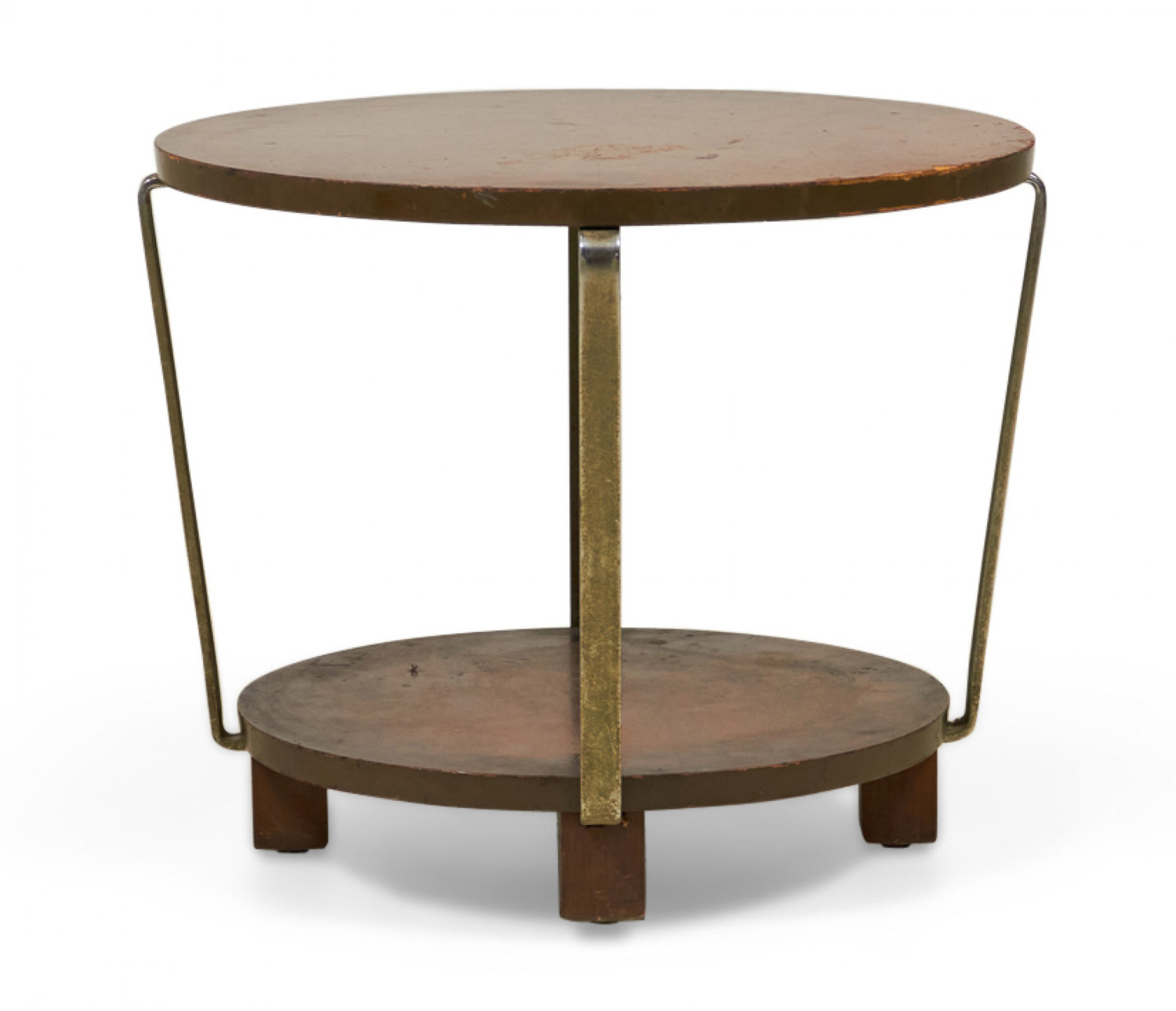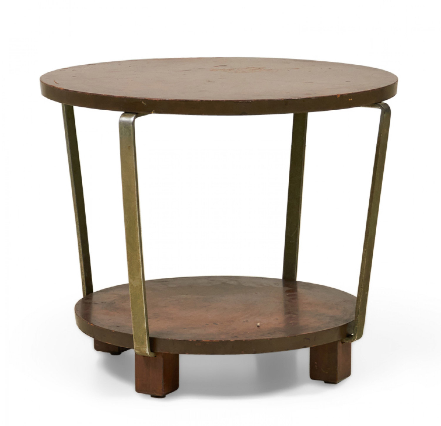 Style: Art Deco Materials & Techniques: Brass, metal, nickel, steel, walnut, wood Category: Tables Condition: Finish is damaged.