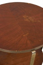 American Art Deco circular walnut table with four nickel-plated steel supports that angle inward to connect to a smaller bottom shelf resting on four square walnut feet.