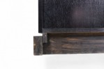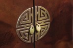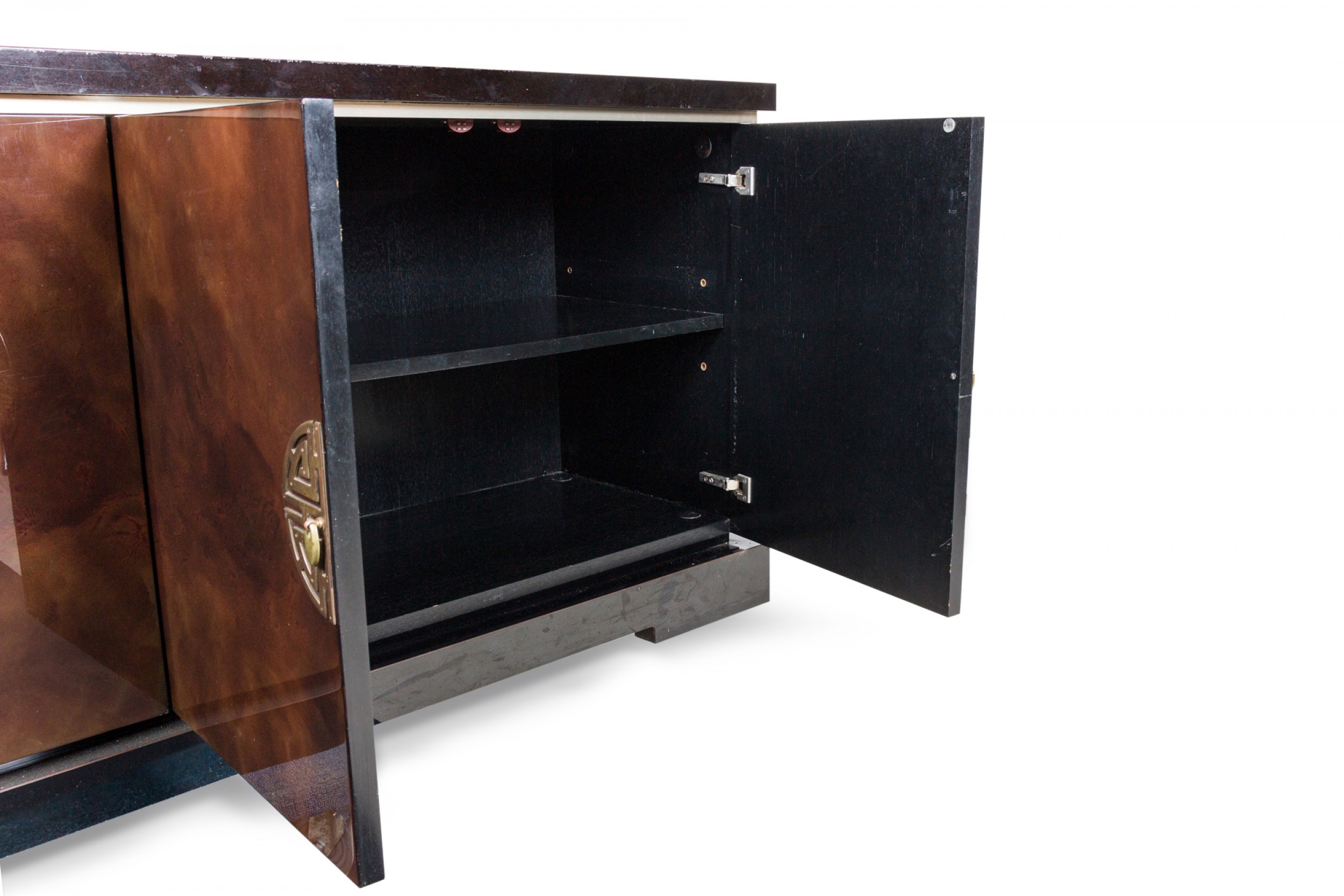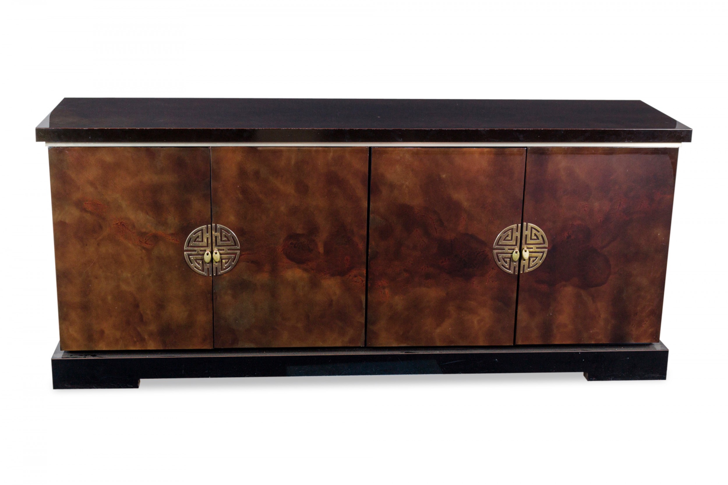 American Mid-Century Modern (circa 1960) sideboard with a mottled brown lacquered case with brass trim resting on a solid wood bracket-shaped base with four cabinet doors with two brass medallion decorations and four dangling brass tab door pulls. (manner of JAMES MONT)
