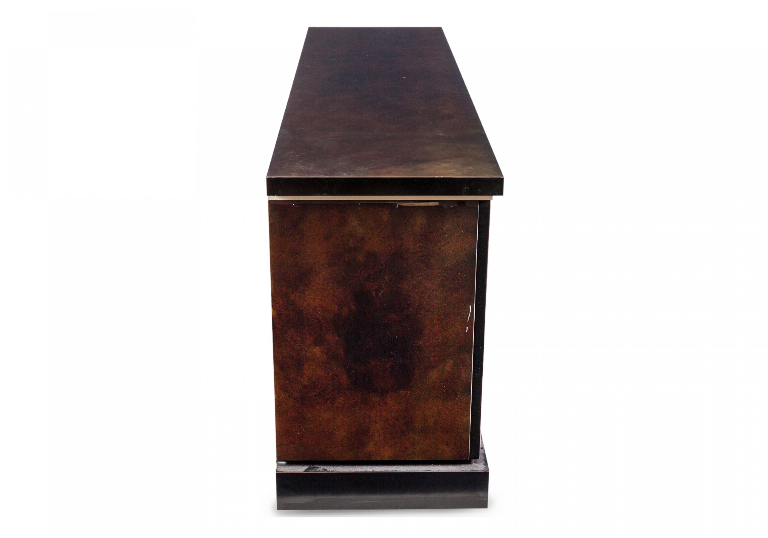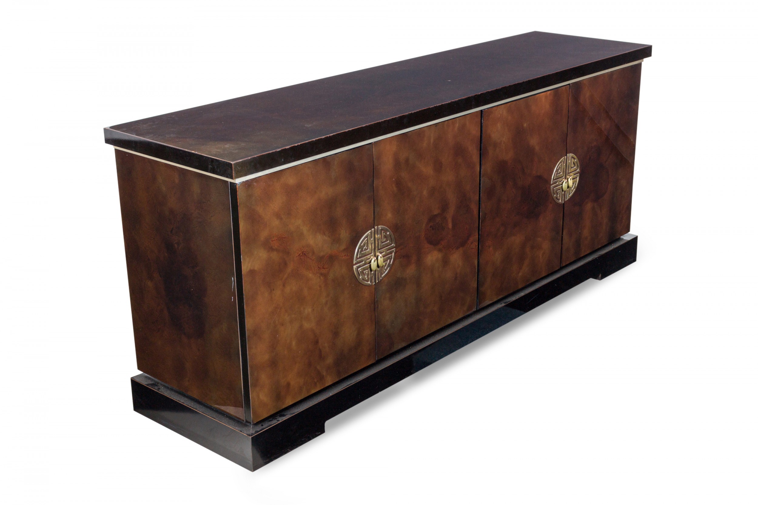 American Mid-Century Modern (circa 1960) sideboard with a mottled brown lacquered case with brass trim resting on a solid wood bracket-shaped base with four cabinet doors with two brass medallion decorations and four dangling brass tab door pulls. (manner of JAMES MONT).