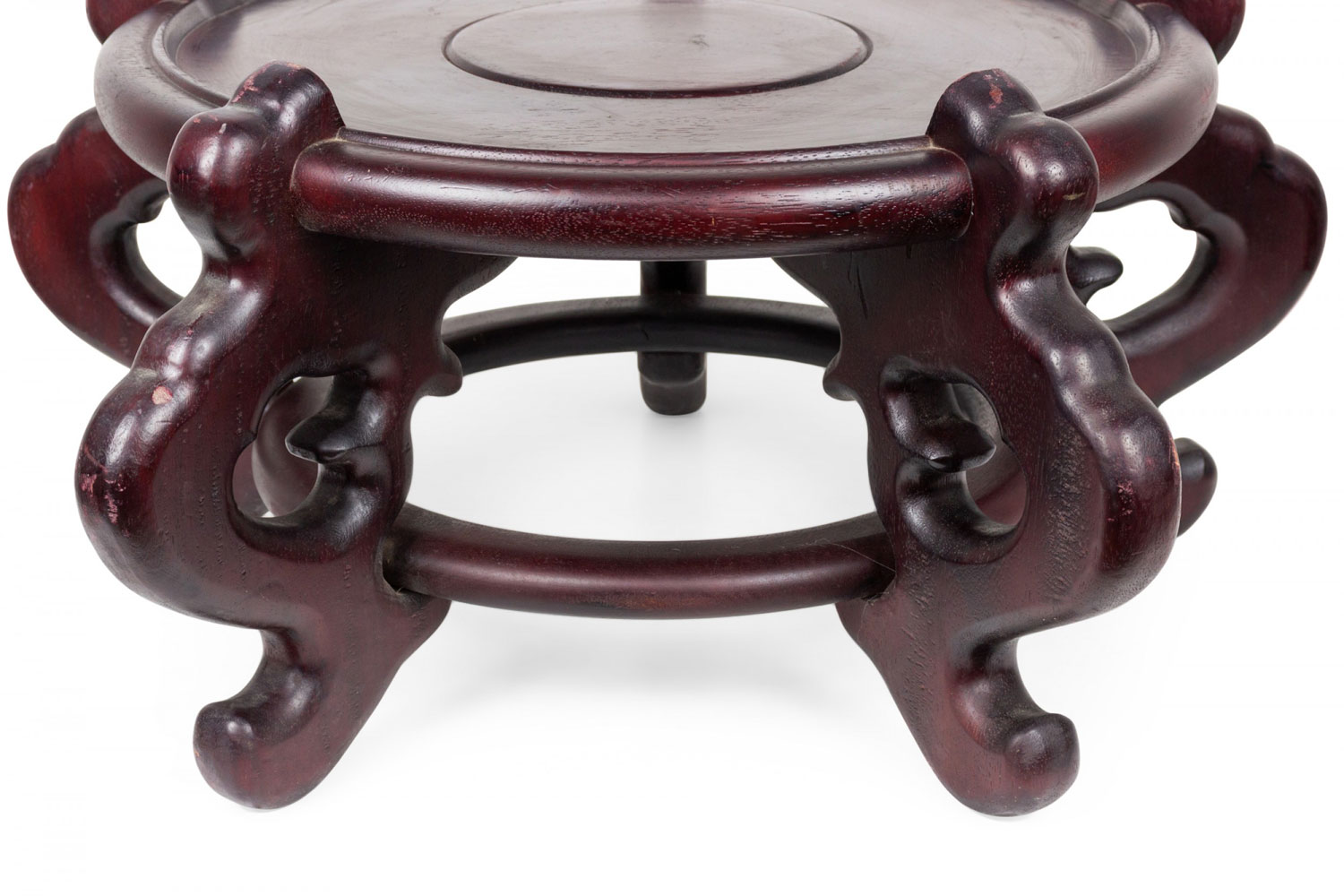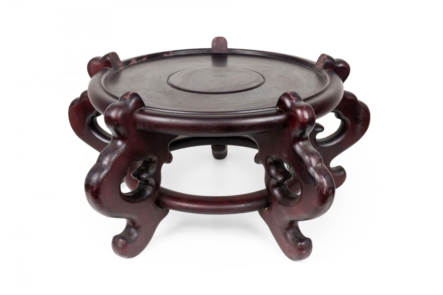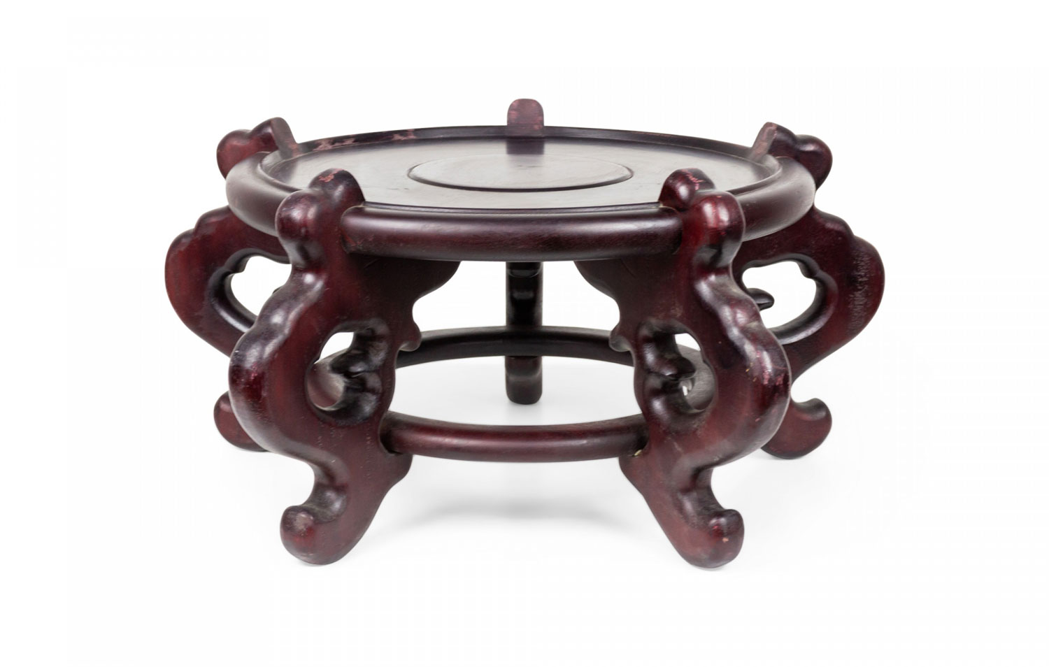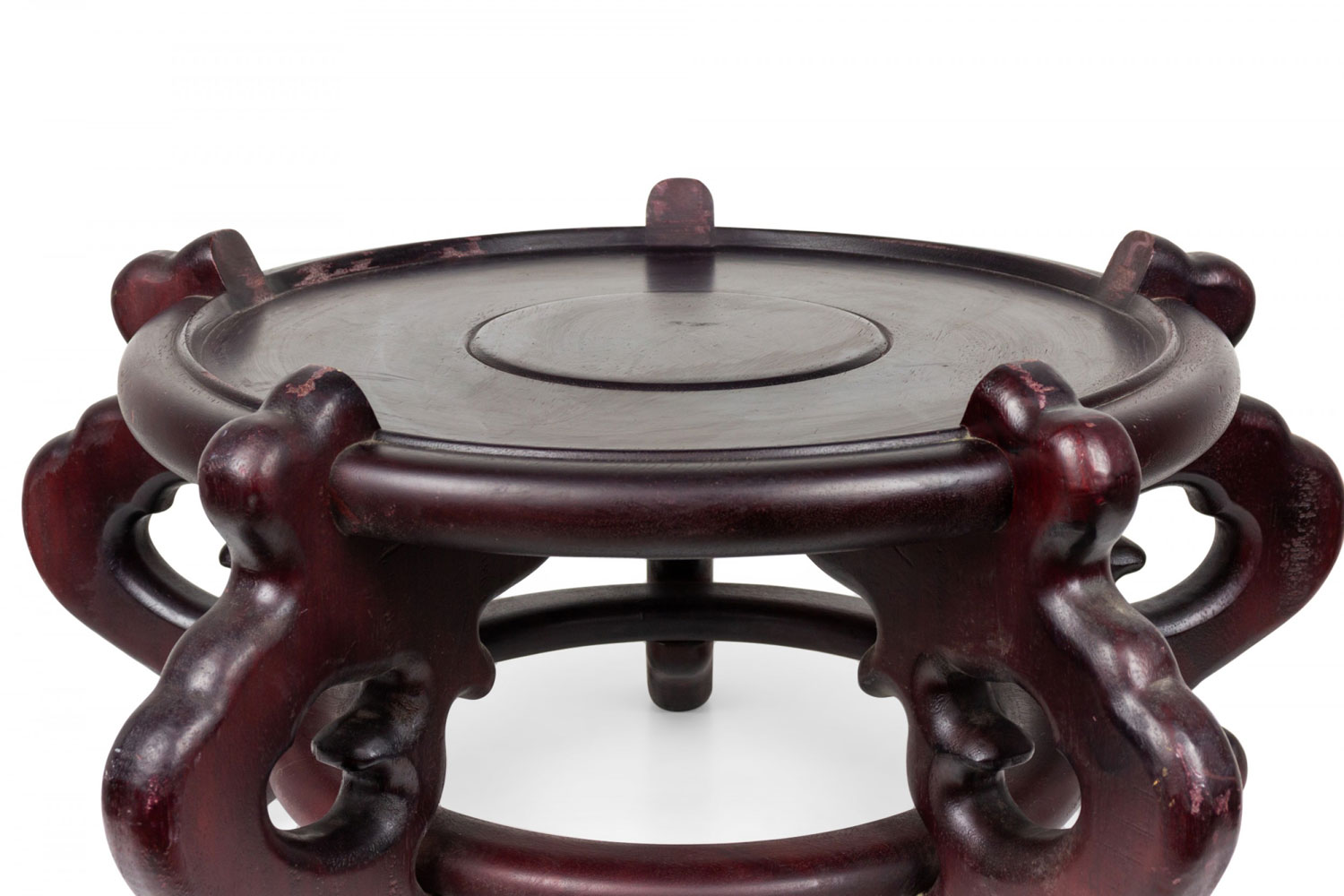 Antique Chinese carved mahogany flower pot base / stand with a circular surface to hold a pot or vase, resting on four bowed and carved feet with a circular stretcher..