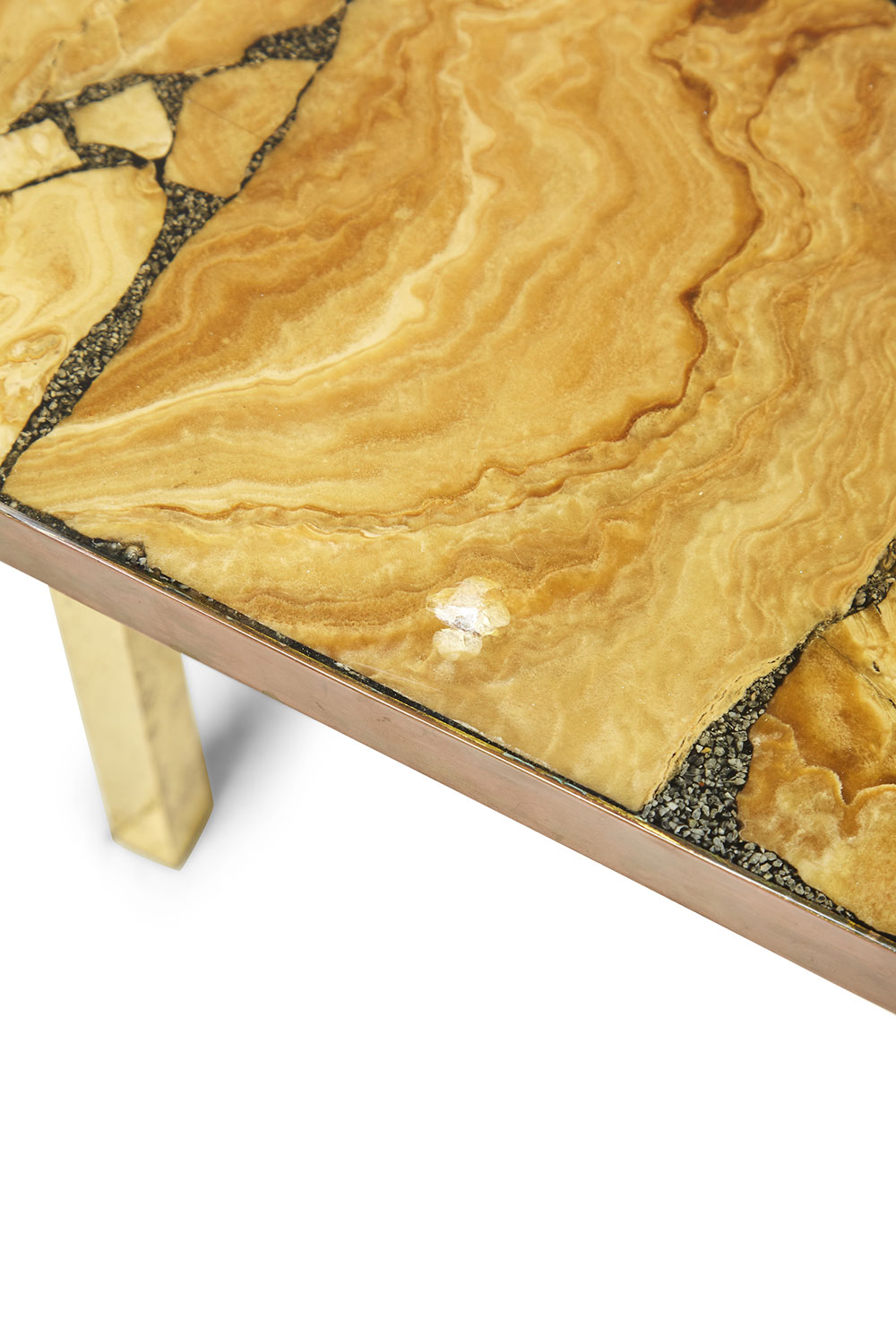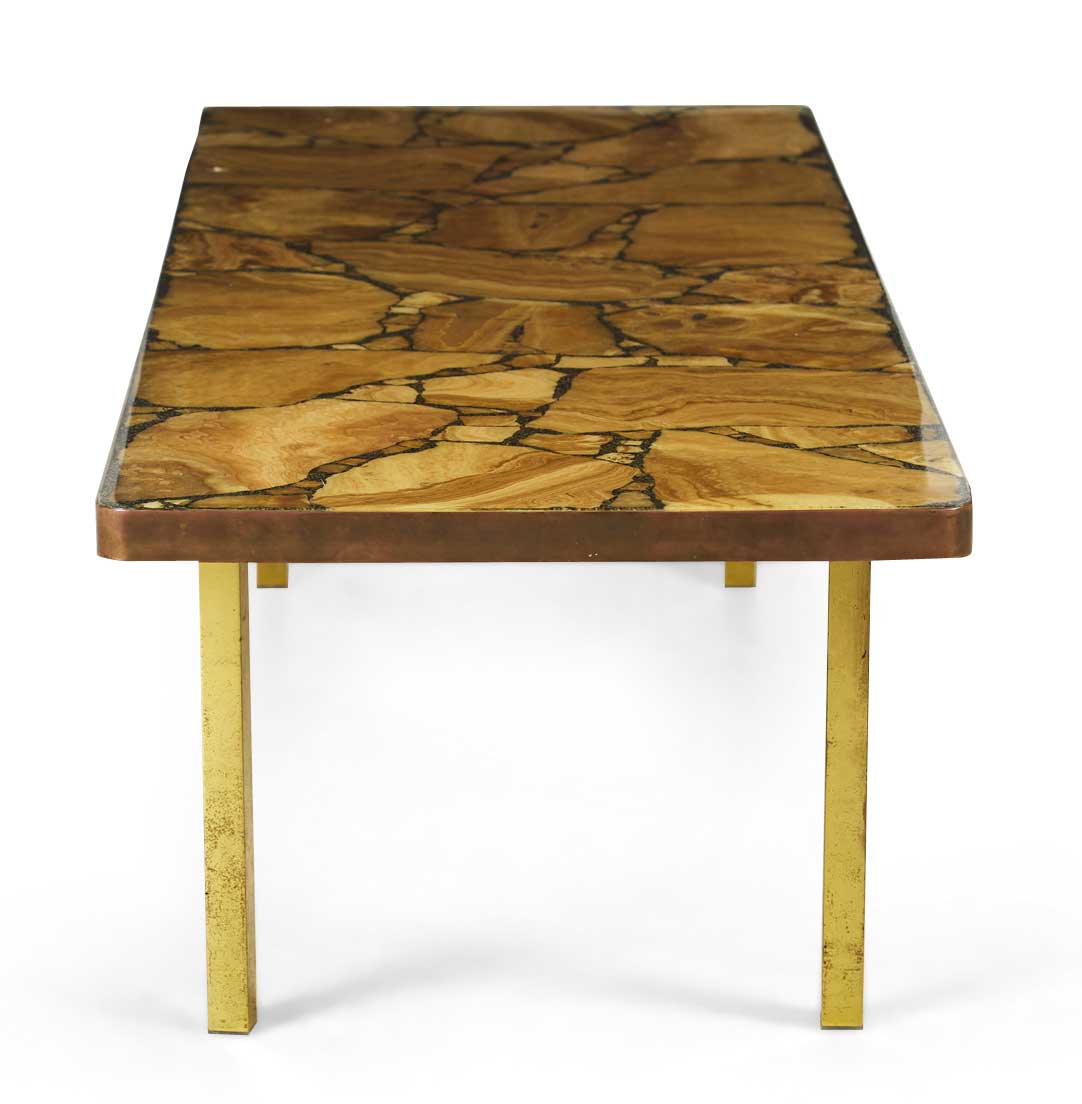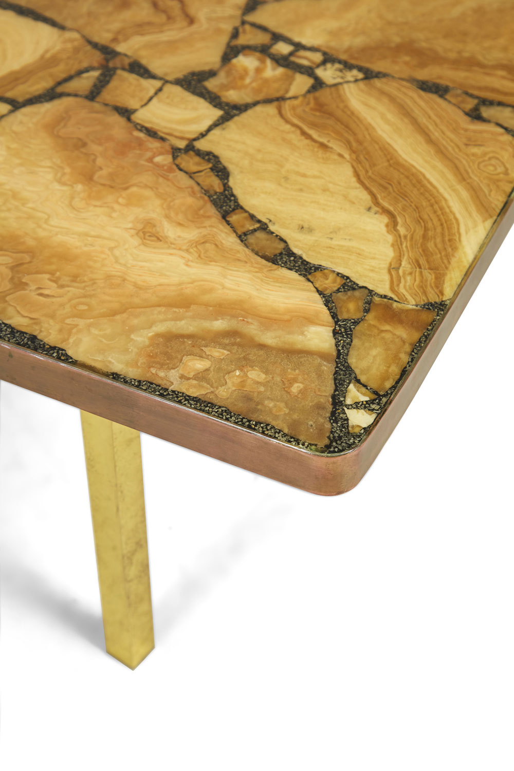 Mexican Mid-Century Modern (circa 1950) rectangular coffee table with an onyx stone and resin top resting on four square brass legs. (ARTURO PANI FOR MULLER OF MEXICO)