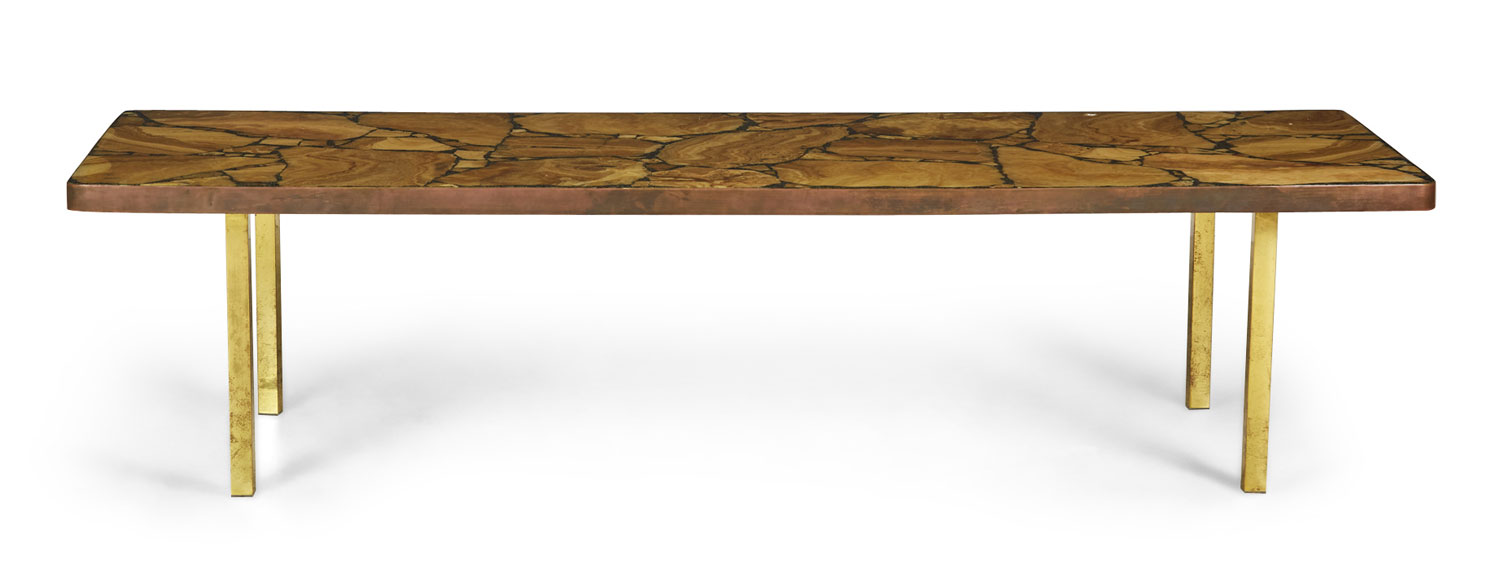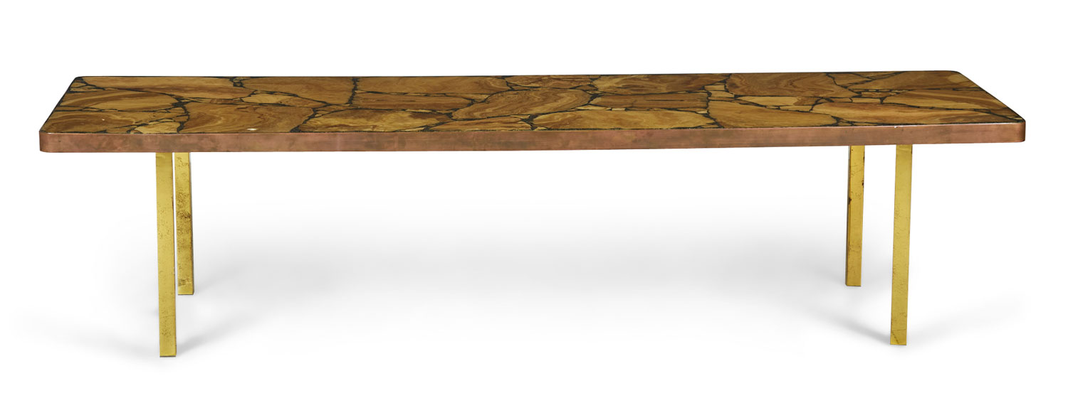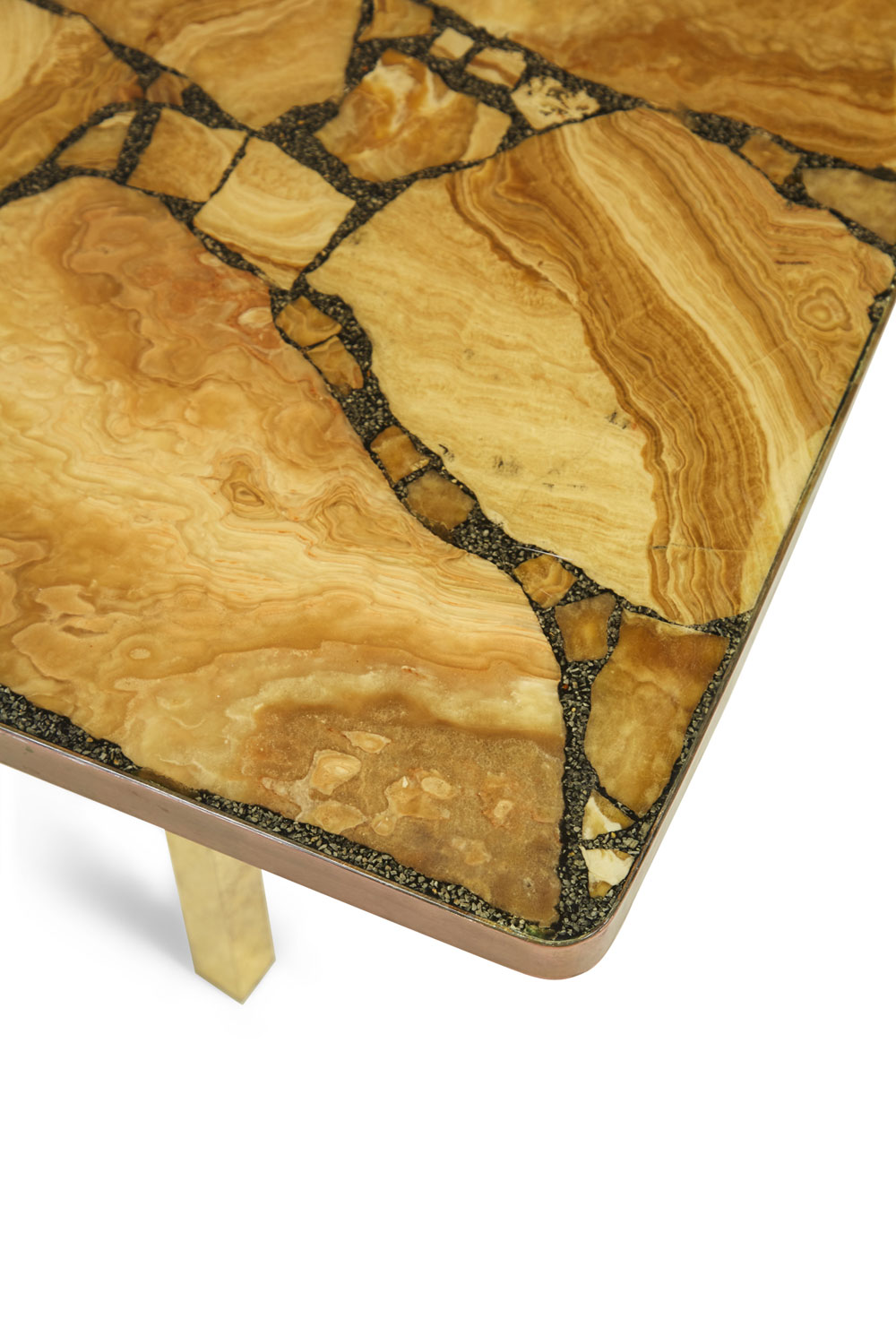 Mexican Mid-Century Modern (circa 1950) rectangular coffee table with an onyx stone and resin top resting on four square brass legs. (ARTURO PANI FOR MULLER OF MEXICO)