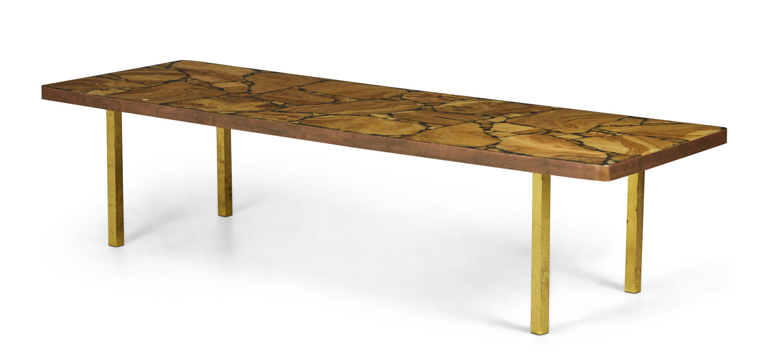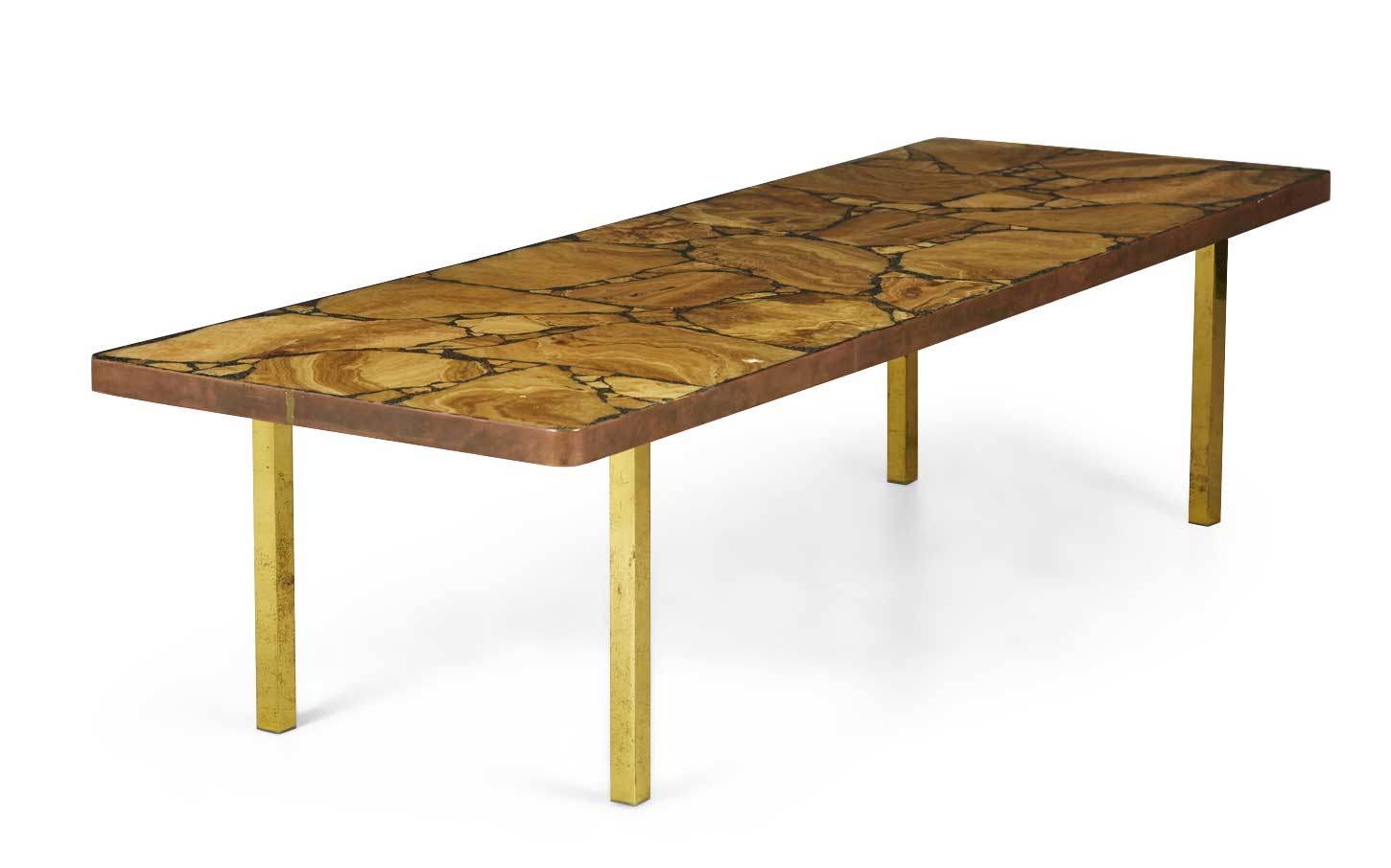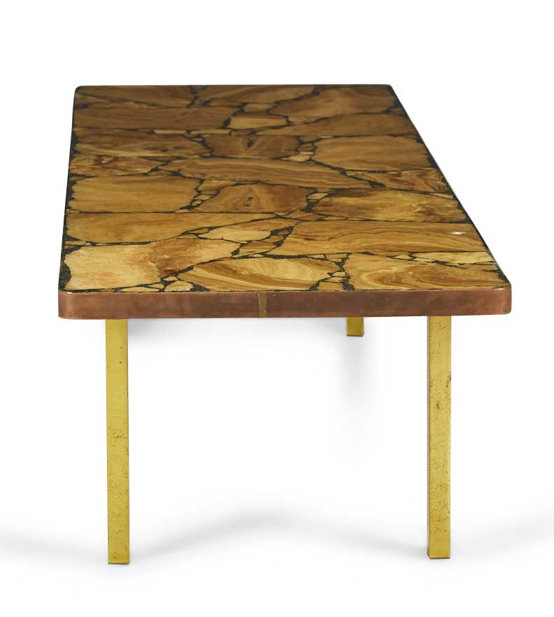 Style: Mid-Century Materials & Techniques: Brass, metal, resin, stone Category: Tables Condition: Large divot in resin table top. Good; Wear consistent with age and use