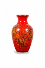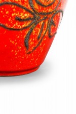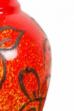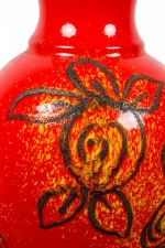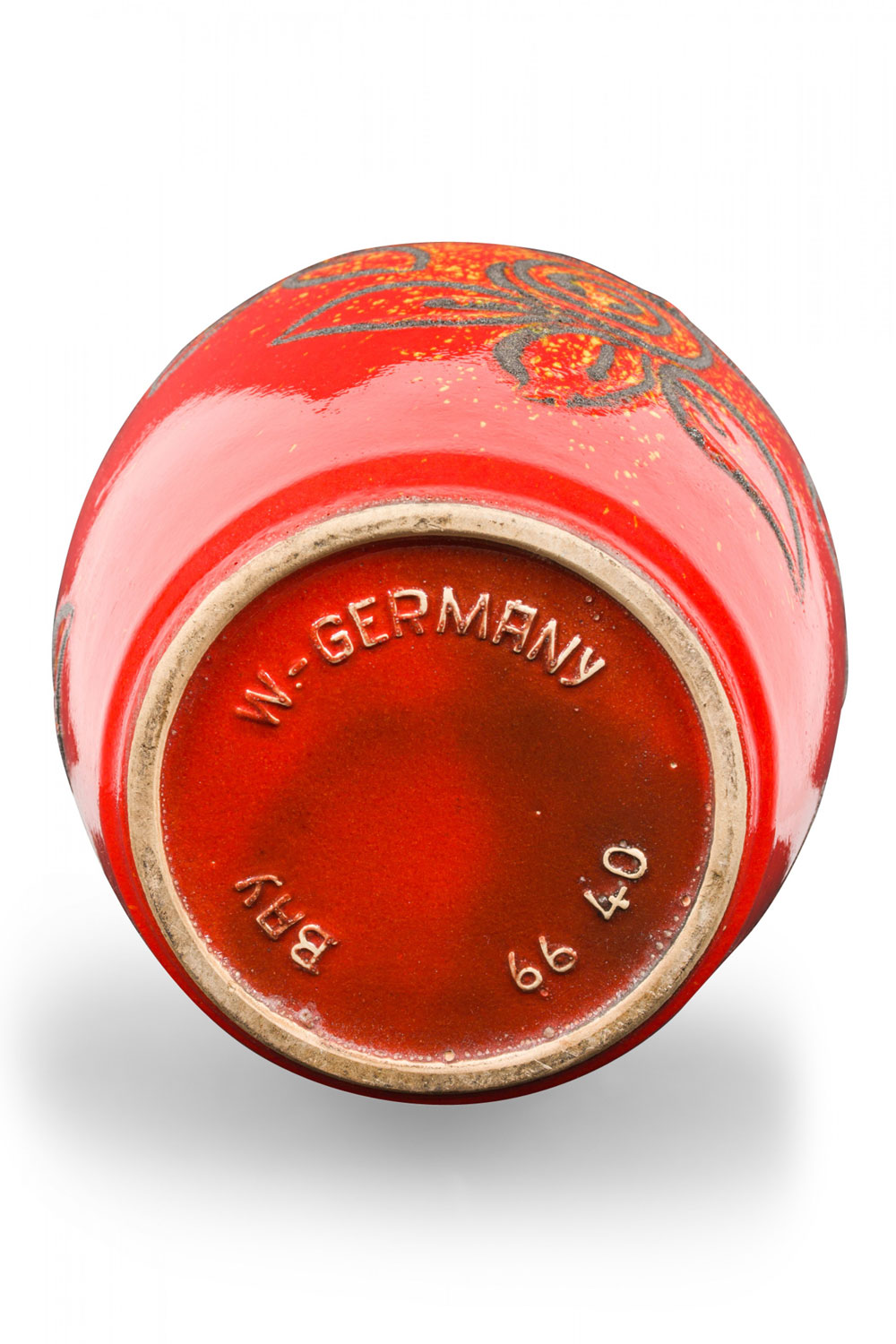 West German Mid-Century ceramic vase with a hand painted black floral pattern against a bright red glazed ground. (mark on bottom, BAY W. GERMANY 66-40)