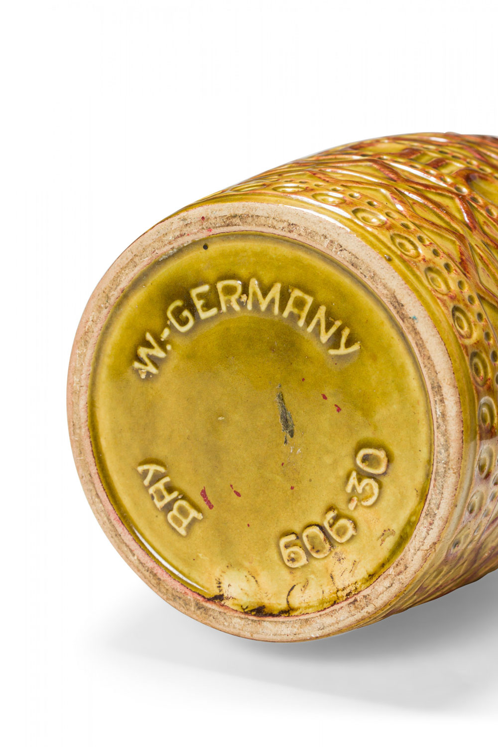 West German Mid-Century ceramic vase with a raised banded geometric design around the body and neck with a multi-tonal brown glaze. (mark on bottom, BAY W. GERMANY 606-30).