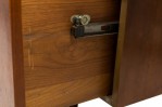 American Mid-Century walnut writing desk with an angular top and two left-hand drawers, supported by five tapered dowel legs connected by stretchers. (BERTHA SCHAEFER FOR SINGER & SONS).