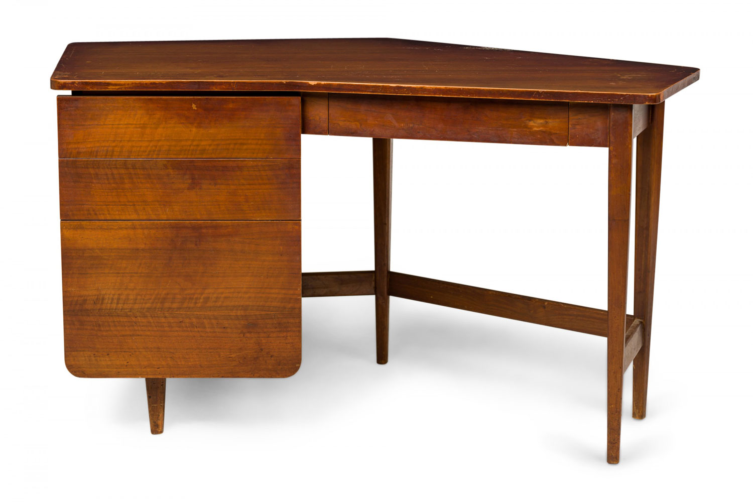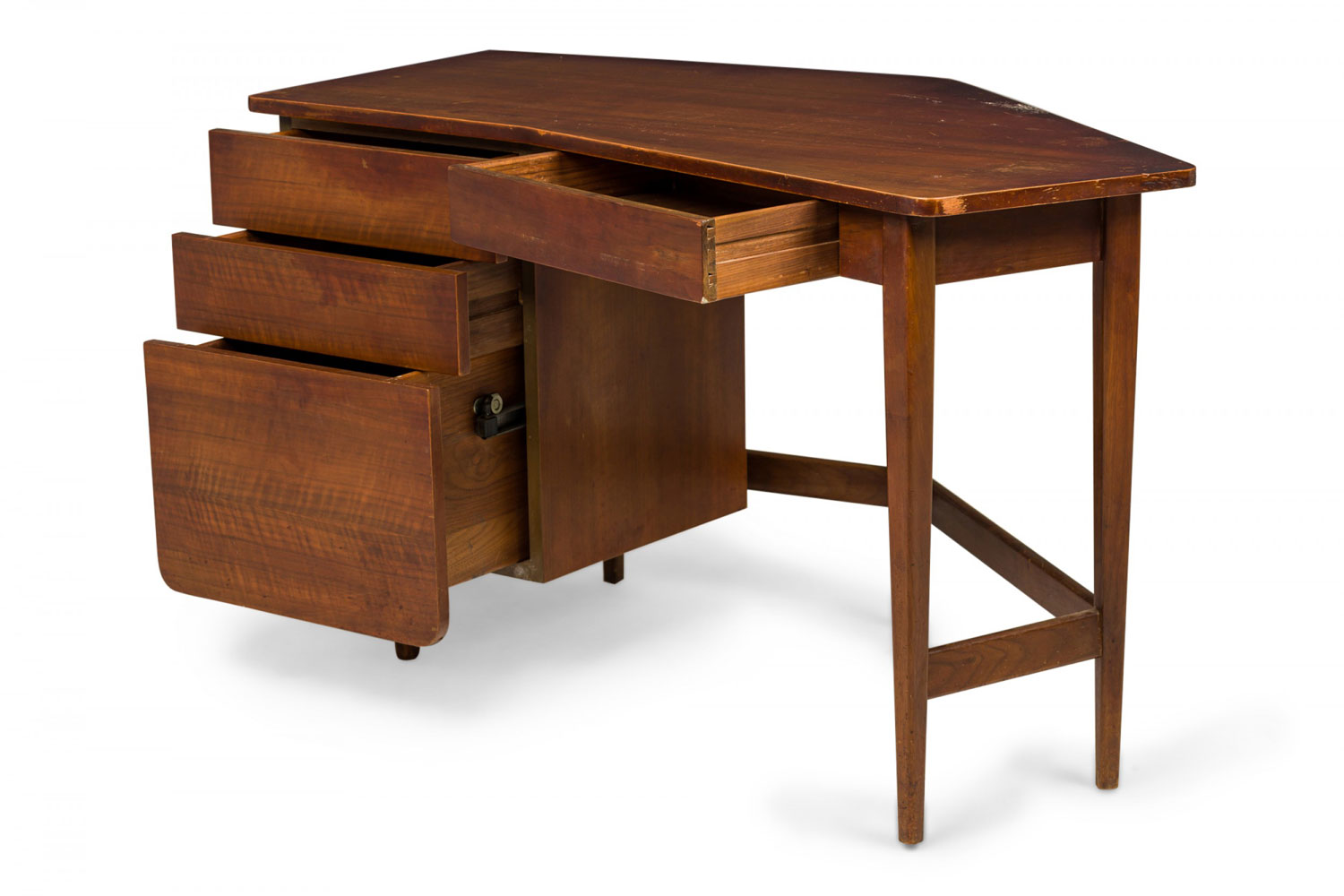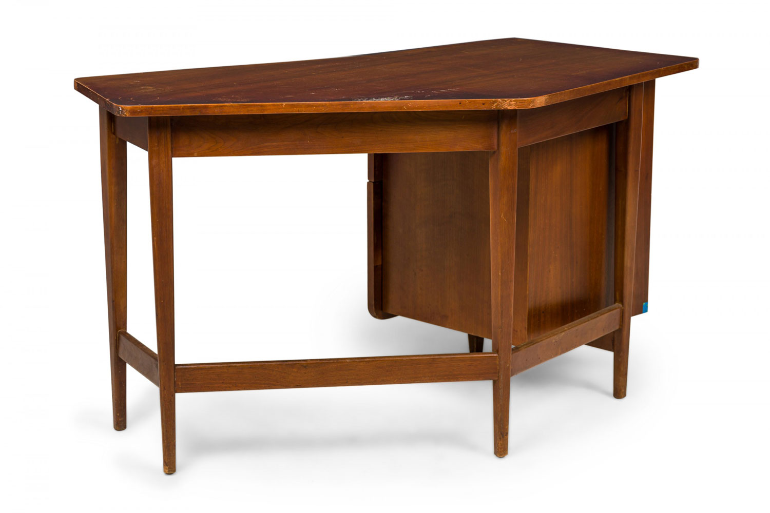 American Mid-Century walnut writing desk with an angular top and two left-hand drawers, supported by five tapered dowel legs connected by stretchers. (BERTHA SCHAEFER FOR SINGER & SONS)