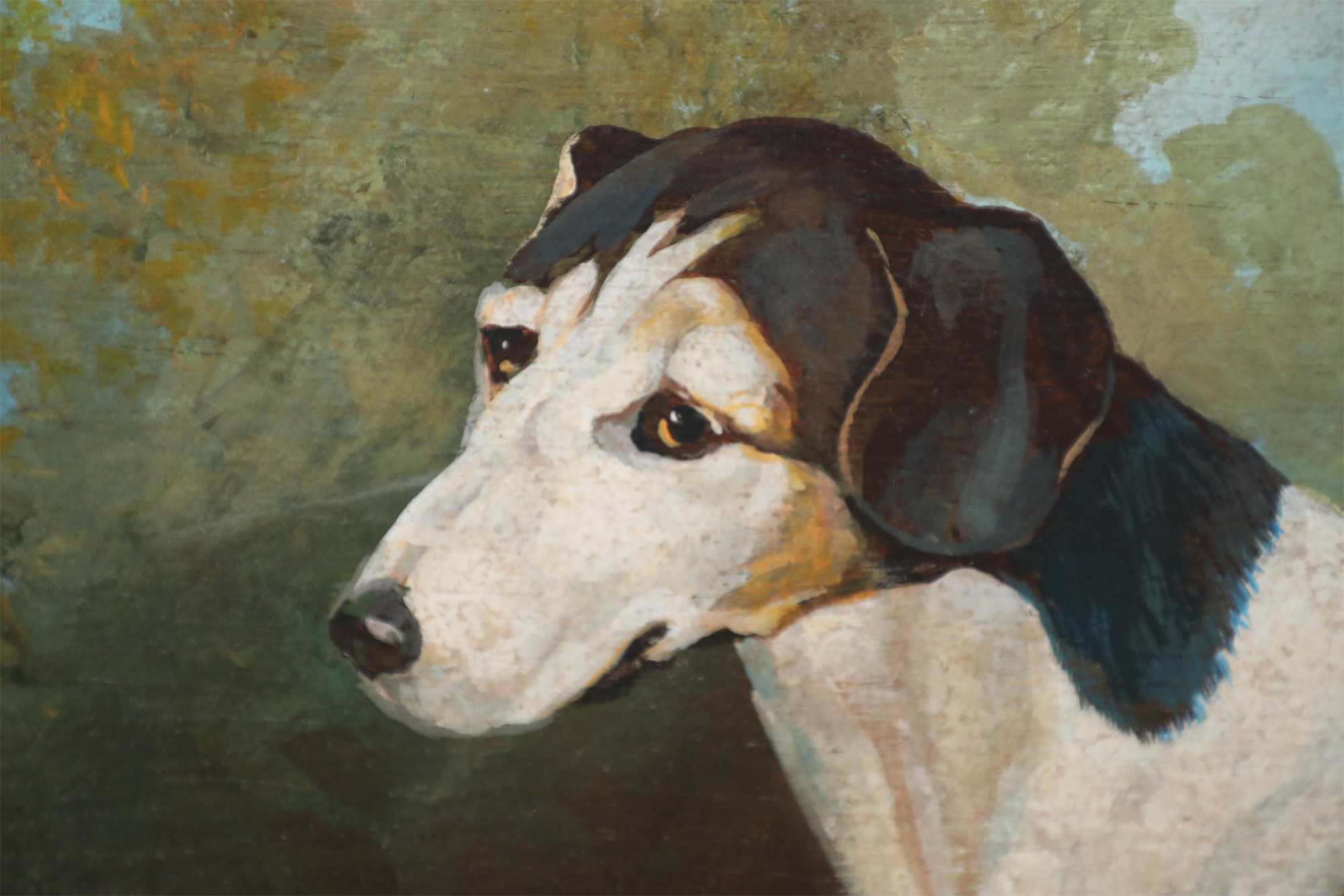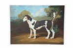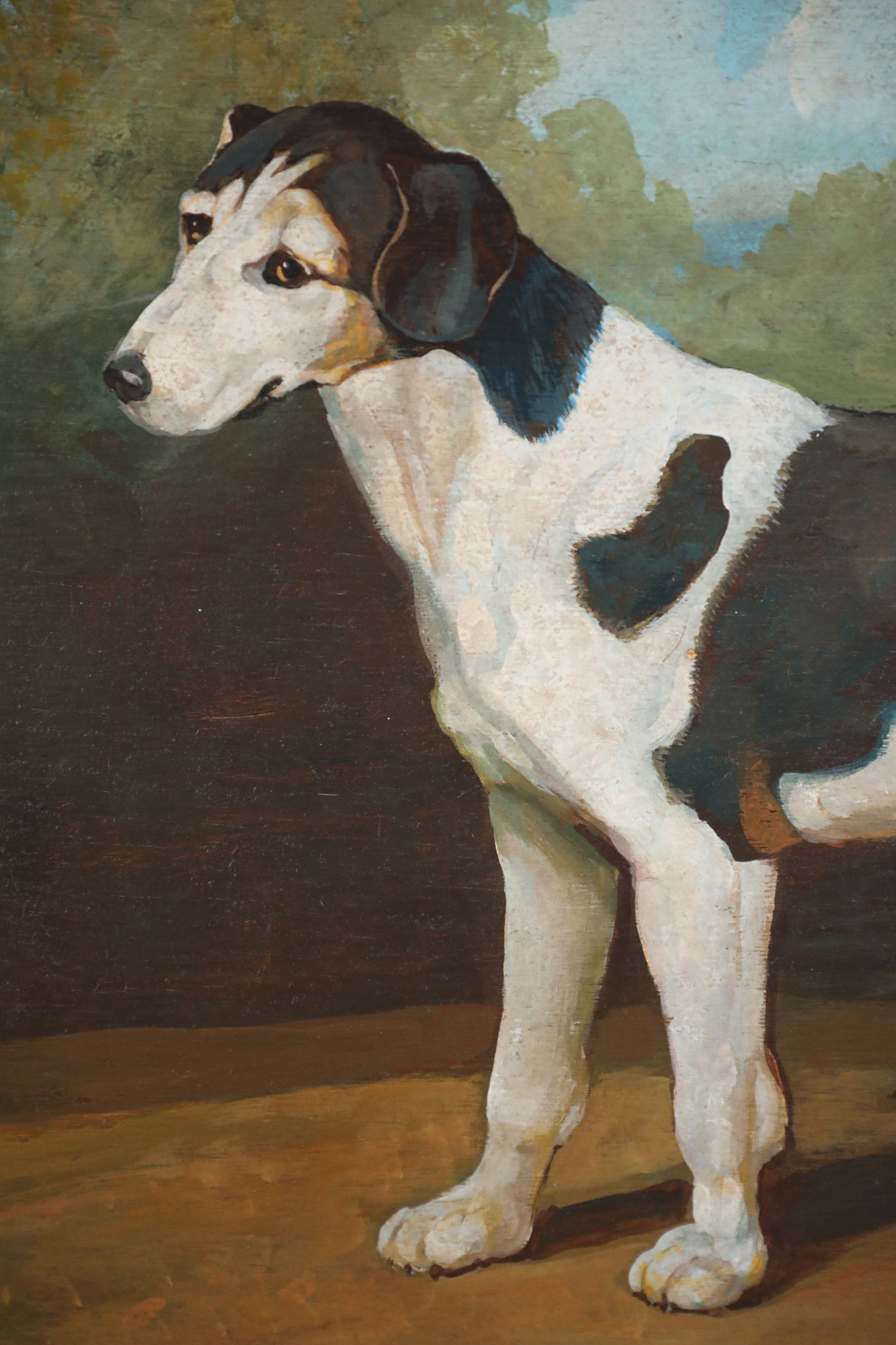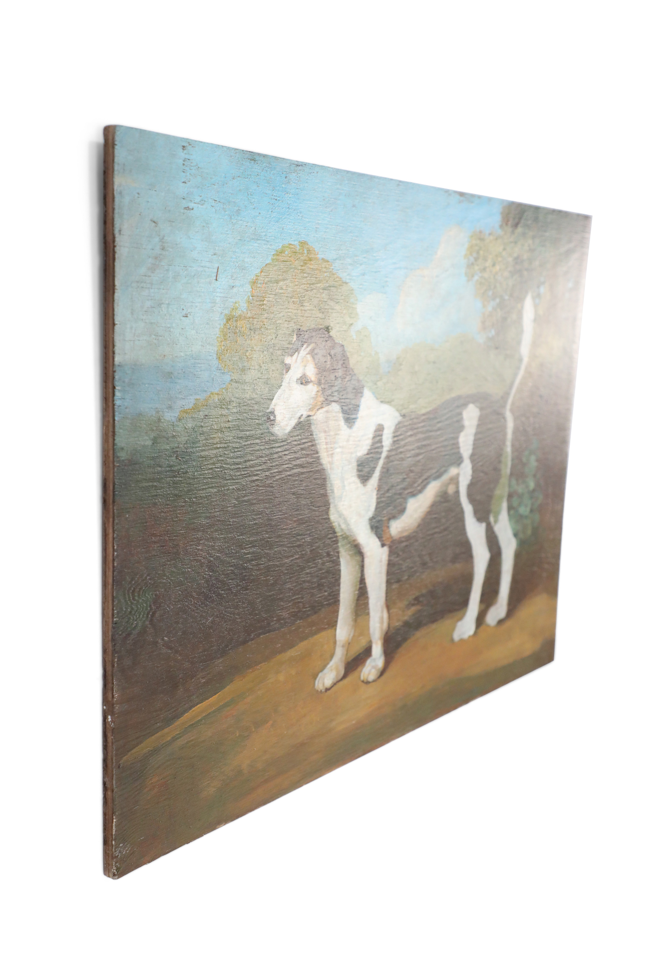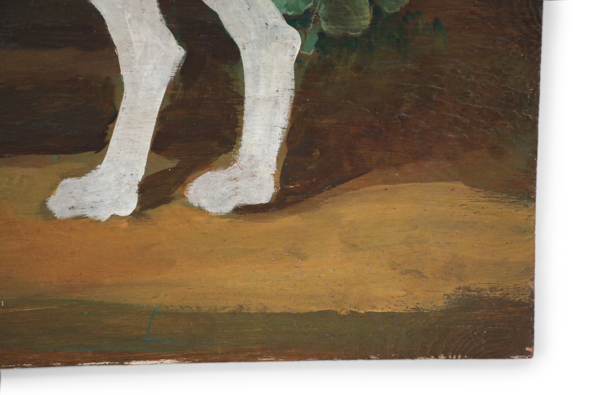 English Victorian style (20th Century) painting of a black and white dog captured on a swath of earth, against a background of landscape scenery, on rectangular, unframed plywood.