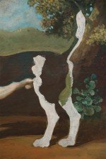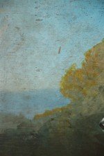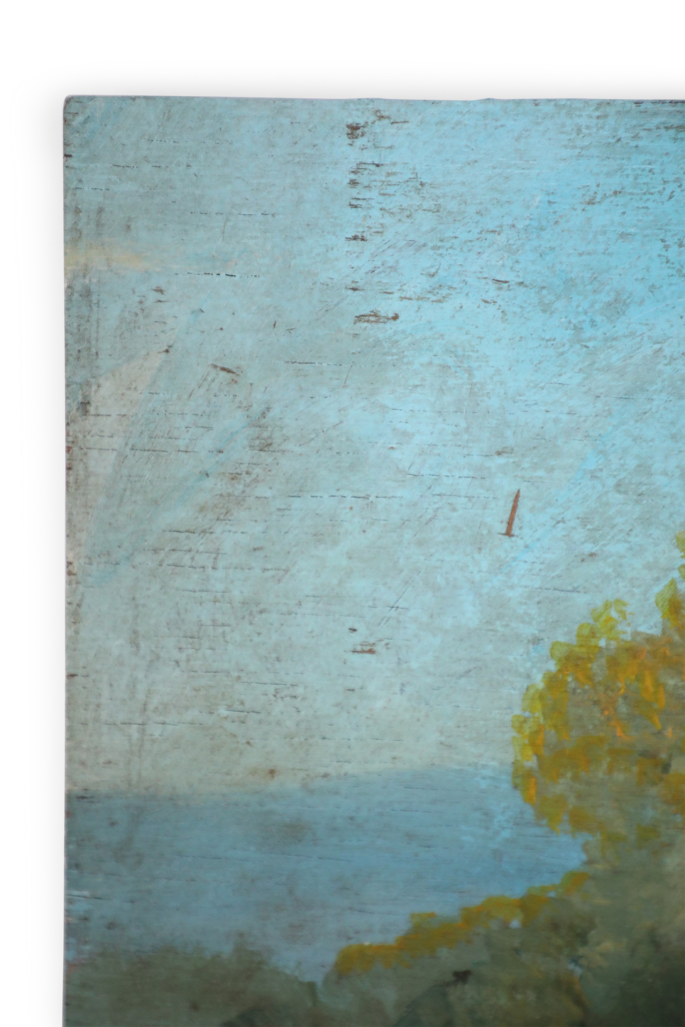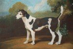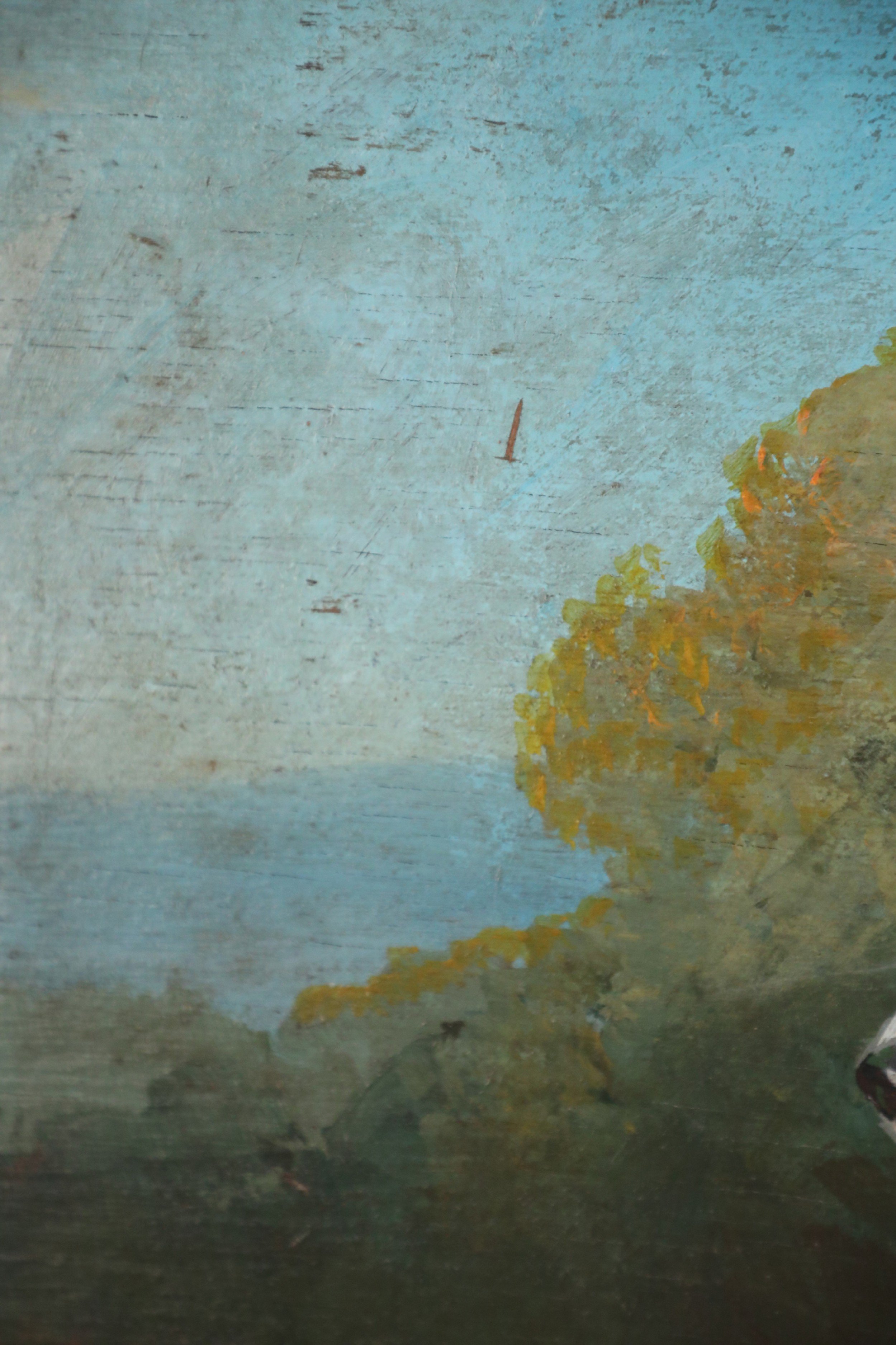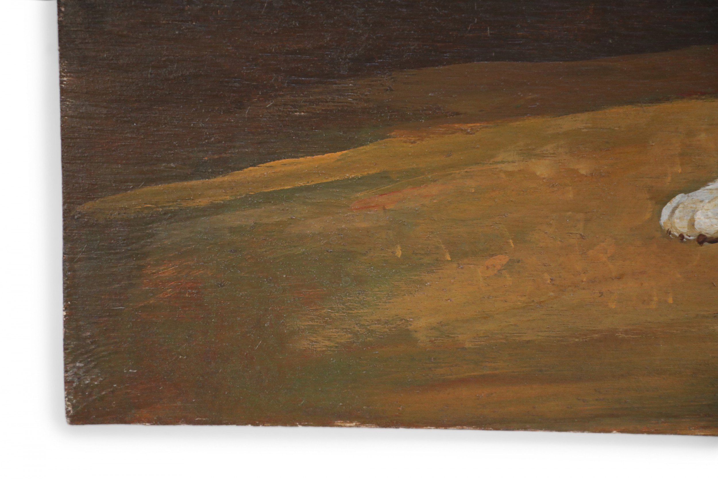 English Victorian style (20th Century) painting of a black and white dog captured on a swath of earth, against a background of landscape scenery, on rectangular, unframed plywood.