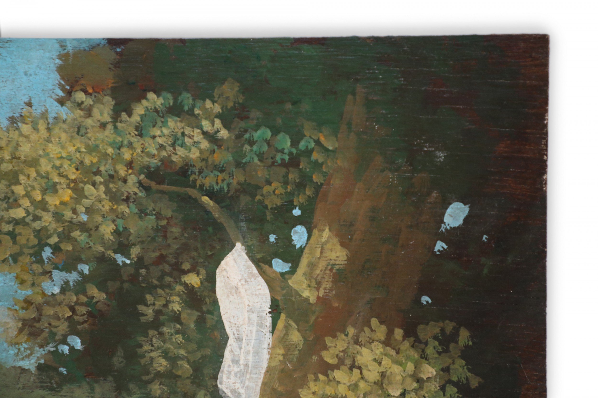 English Victorian style (20th Century) painting of a black and white dog captured on a swath of earth, against a background of landscape scenery, on rectangular, unframed plywood..