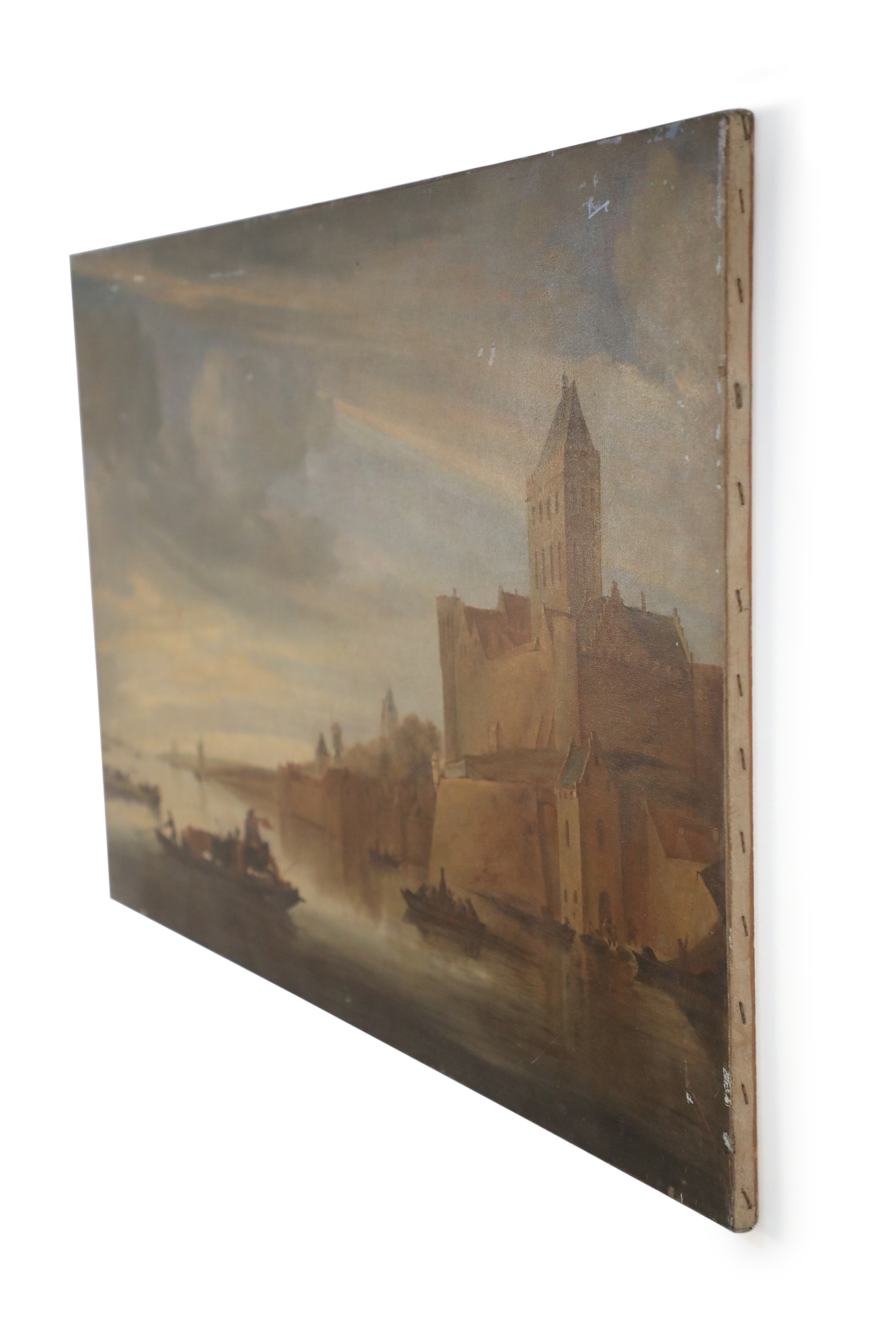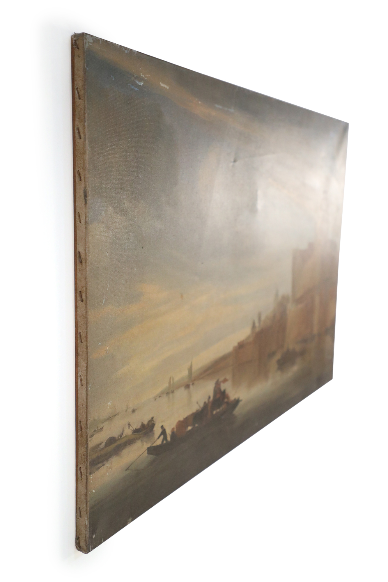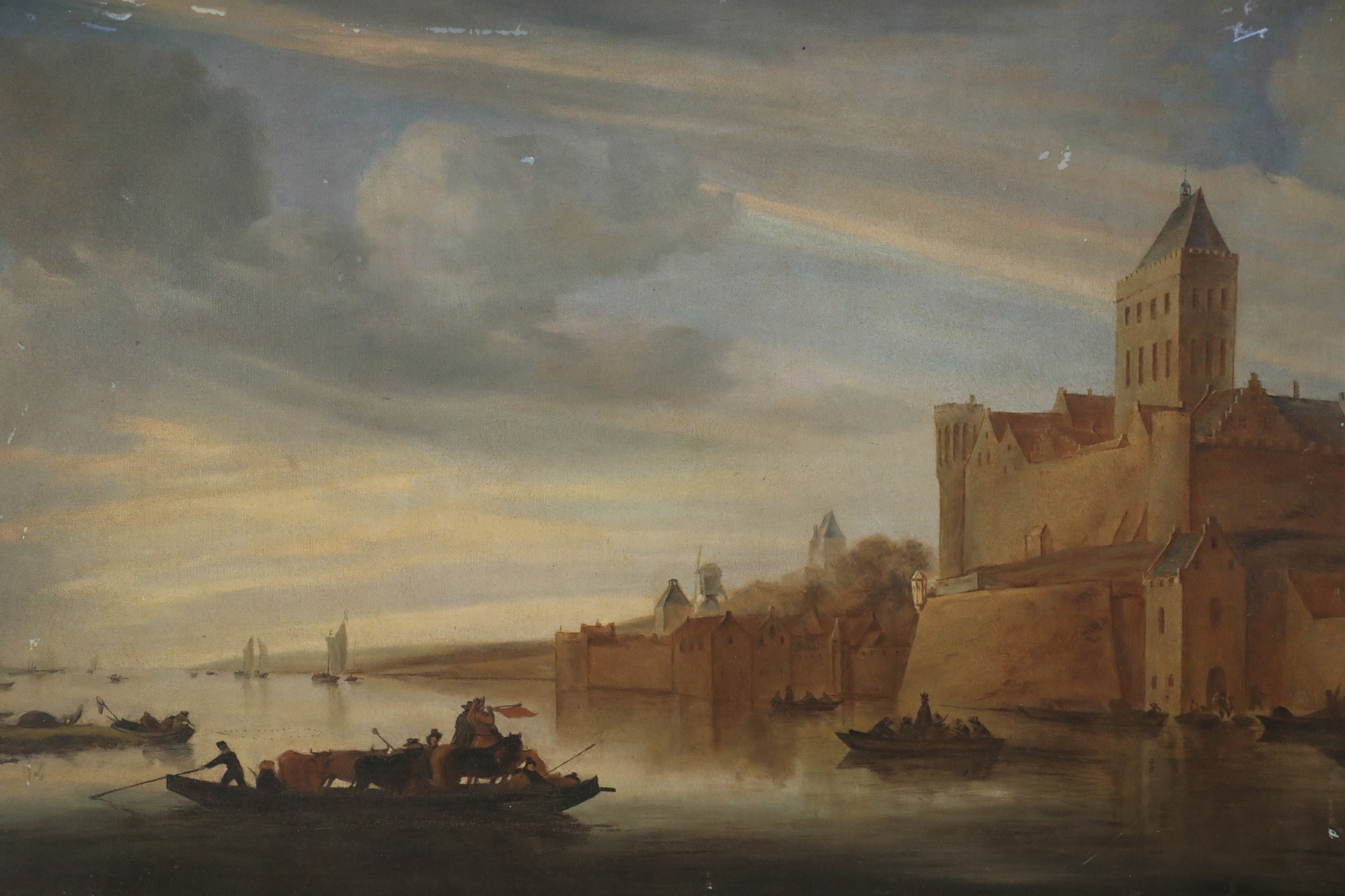Vintage (20th Century) oil painting of a castle overlooking a harbor with several boats amid its calm waters, and a cloudy sky at sunset, on rectangular, unframed canvas..