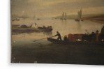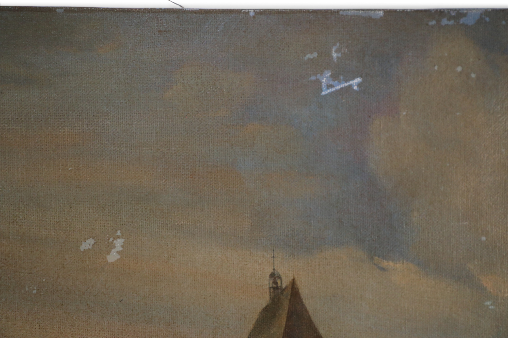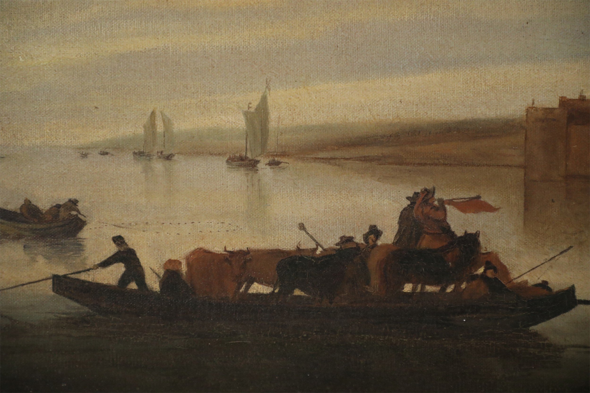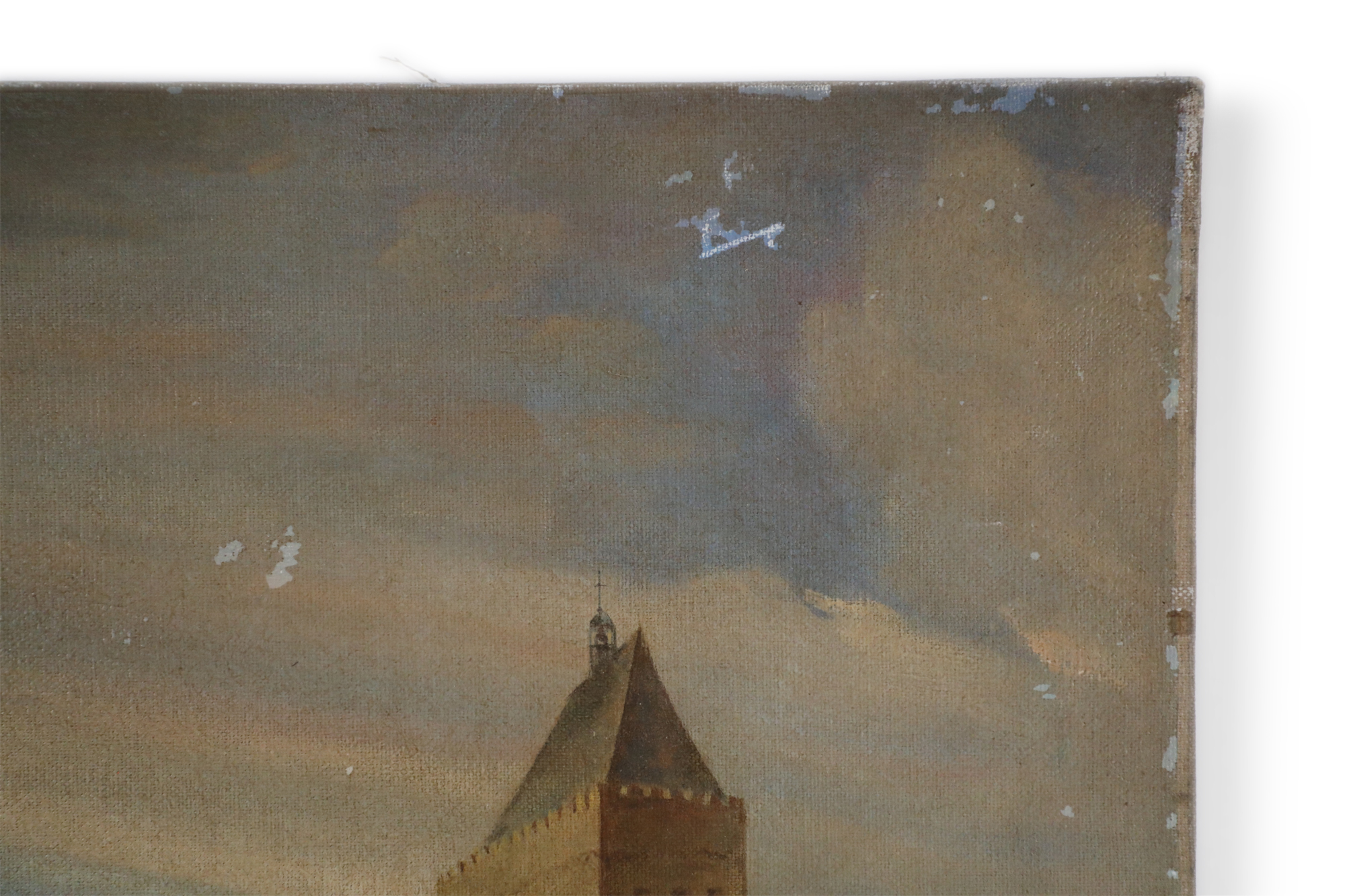 Vintage (20th Century) oil painting of a castle overlooking a harbor with several boats amid its calm waters, and a cloudy sky at sunset, on rectangular, unframed canvas..