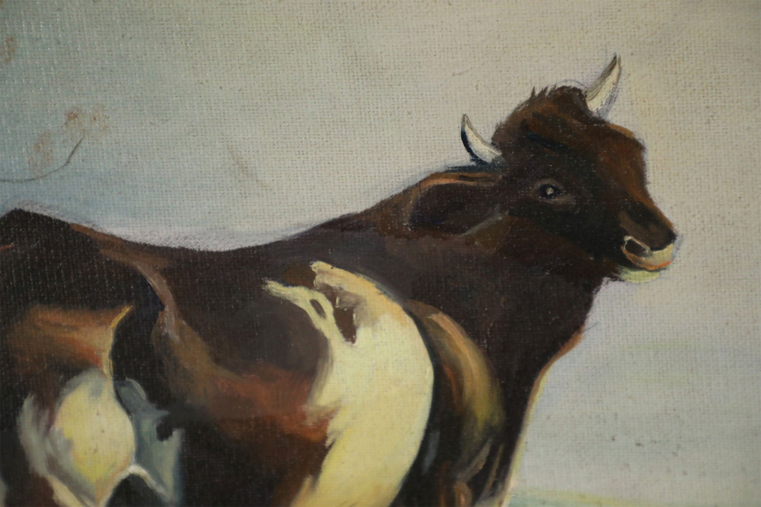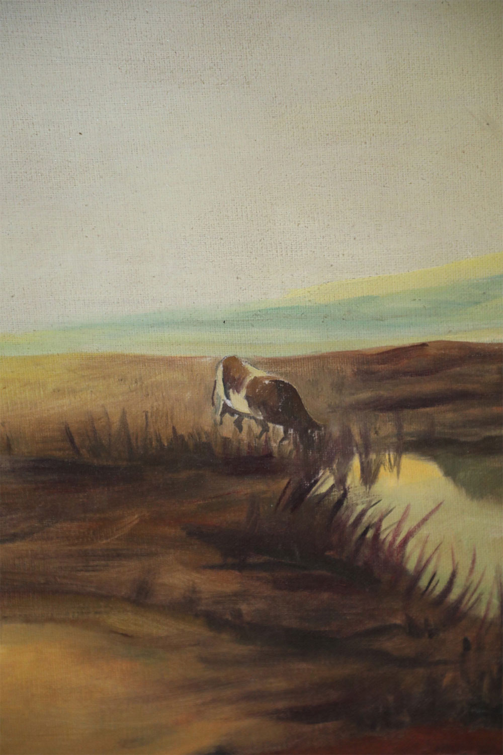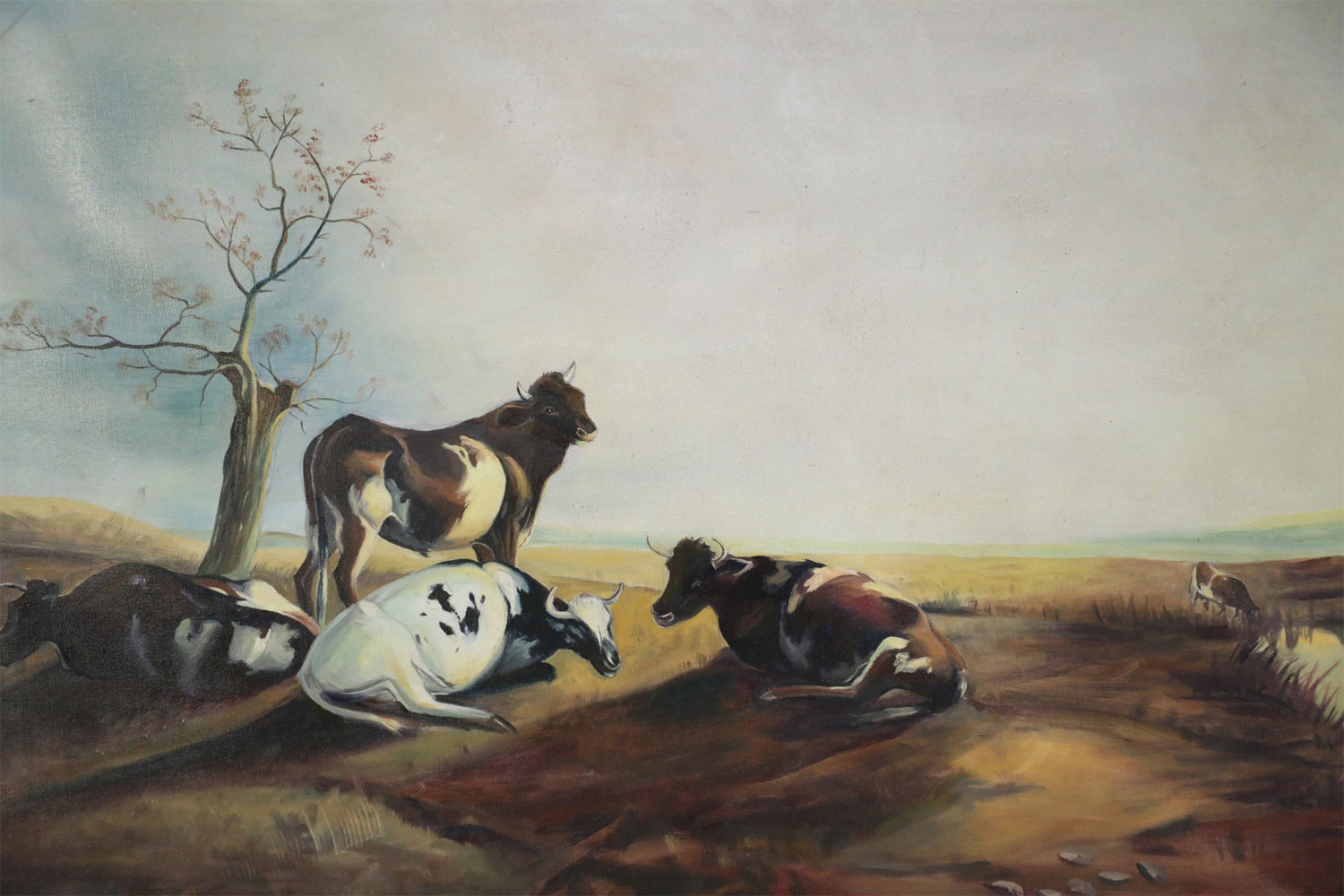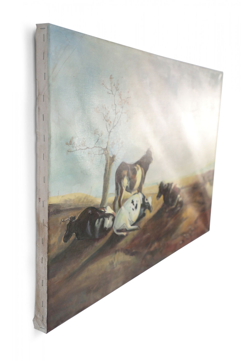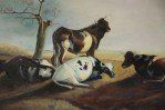 English Victorian style (20th Century) oil painting depicting a group of dairy cows relaxing in a field with a background of sweeping flat planes interrupted only by a single tree, on rectangular unframed canvas (Similar copy with minor variants: NWL2257A)..