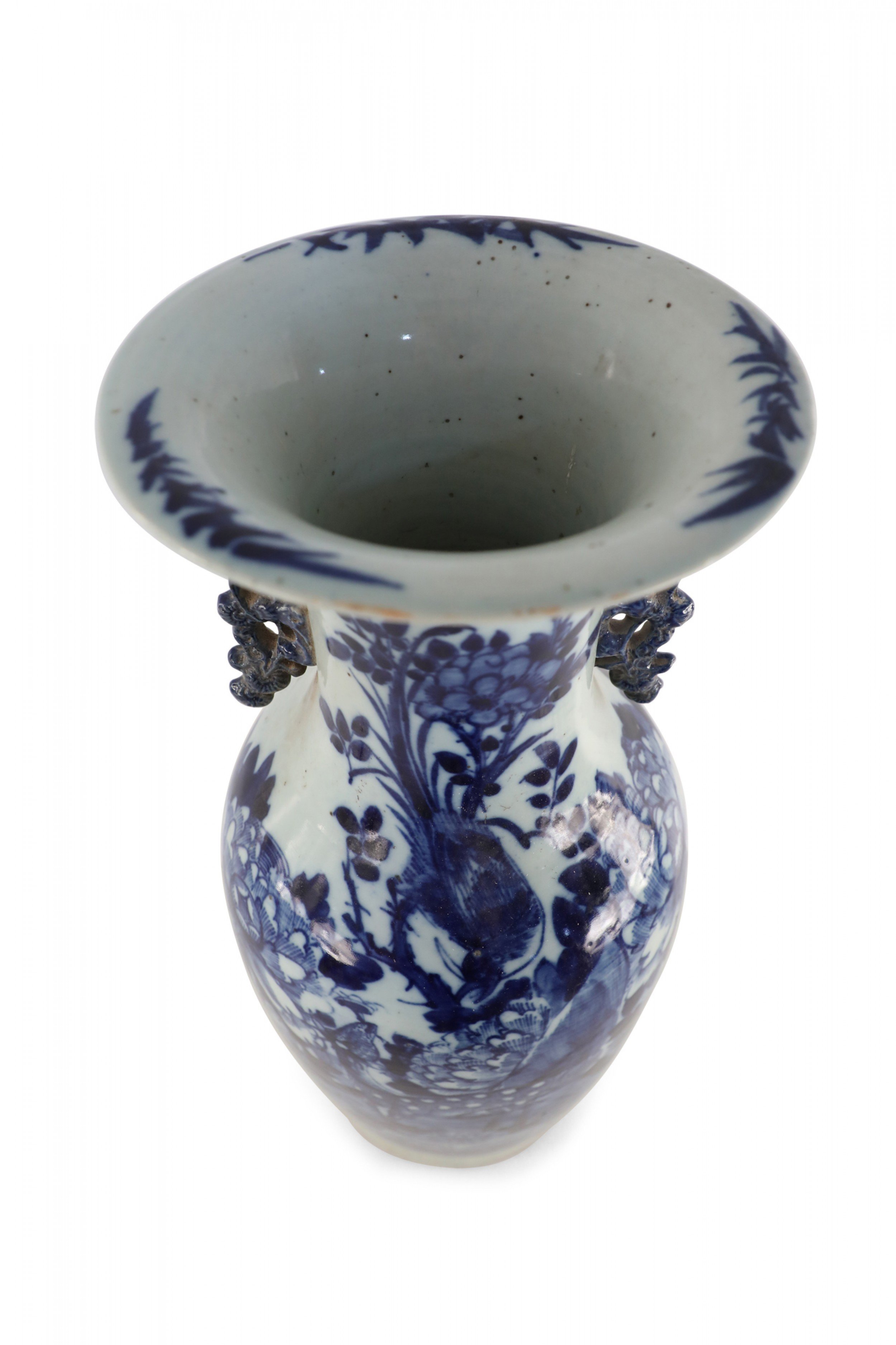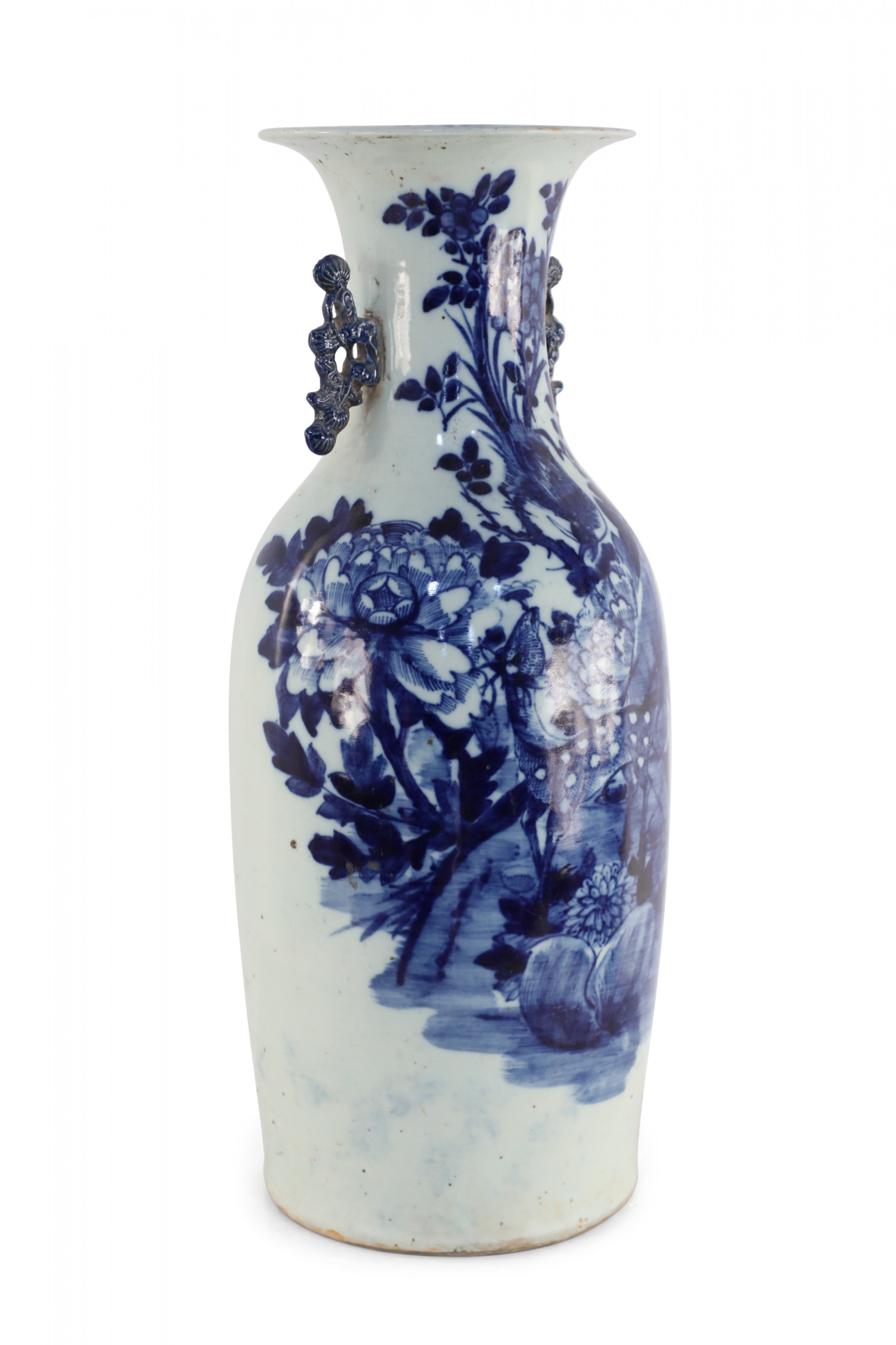 Antique Chinese (Late 19th Century) large porcelain urn with blue spotted deer amid florals on an off-white background and two navy scrolled handles along the neck..