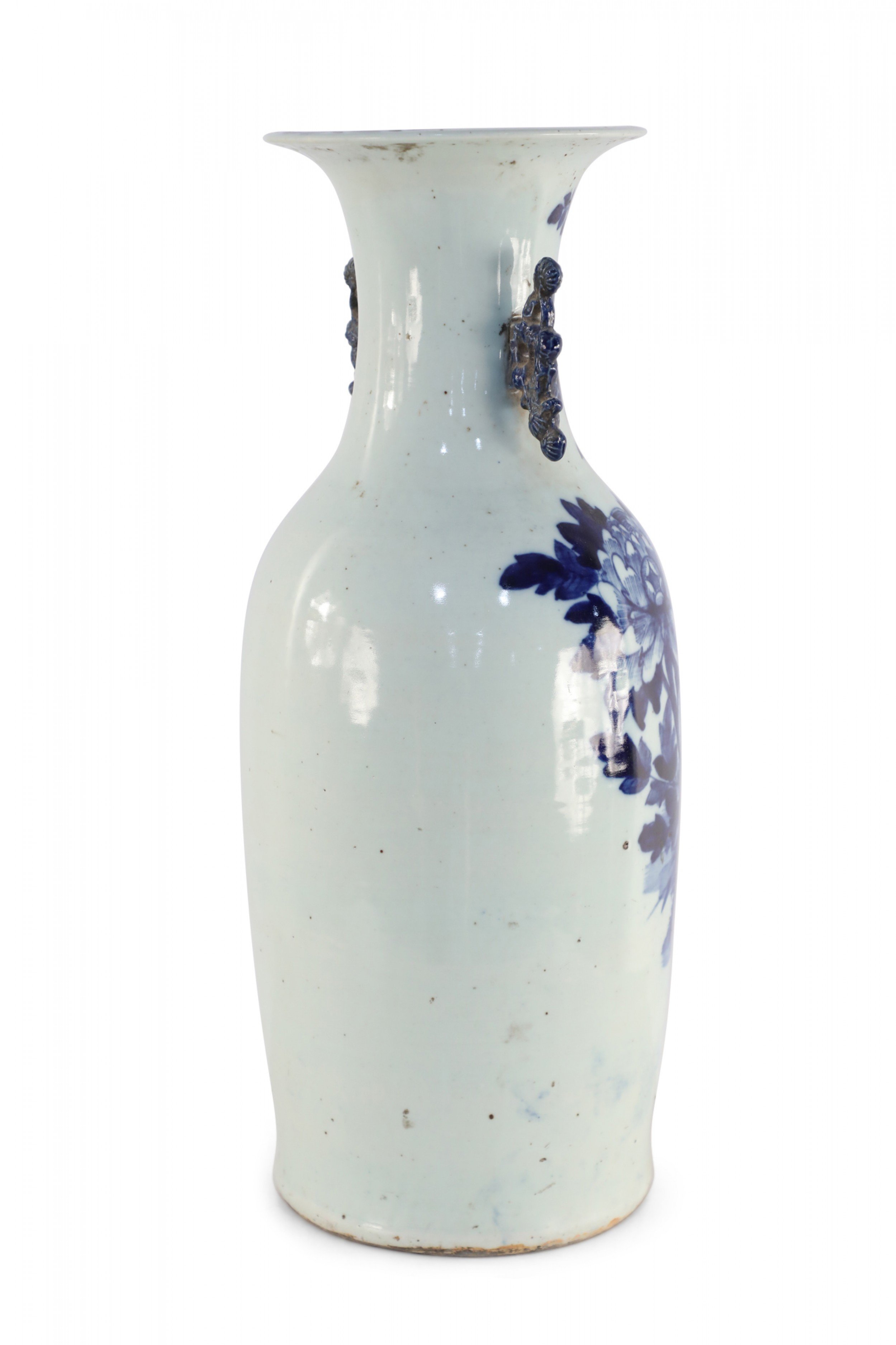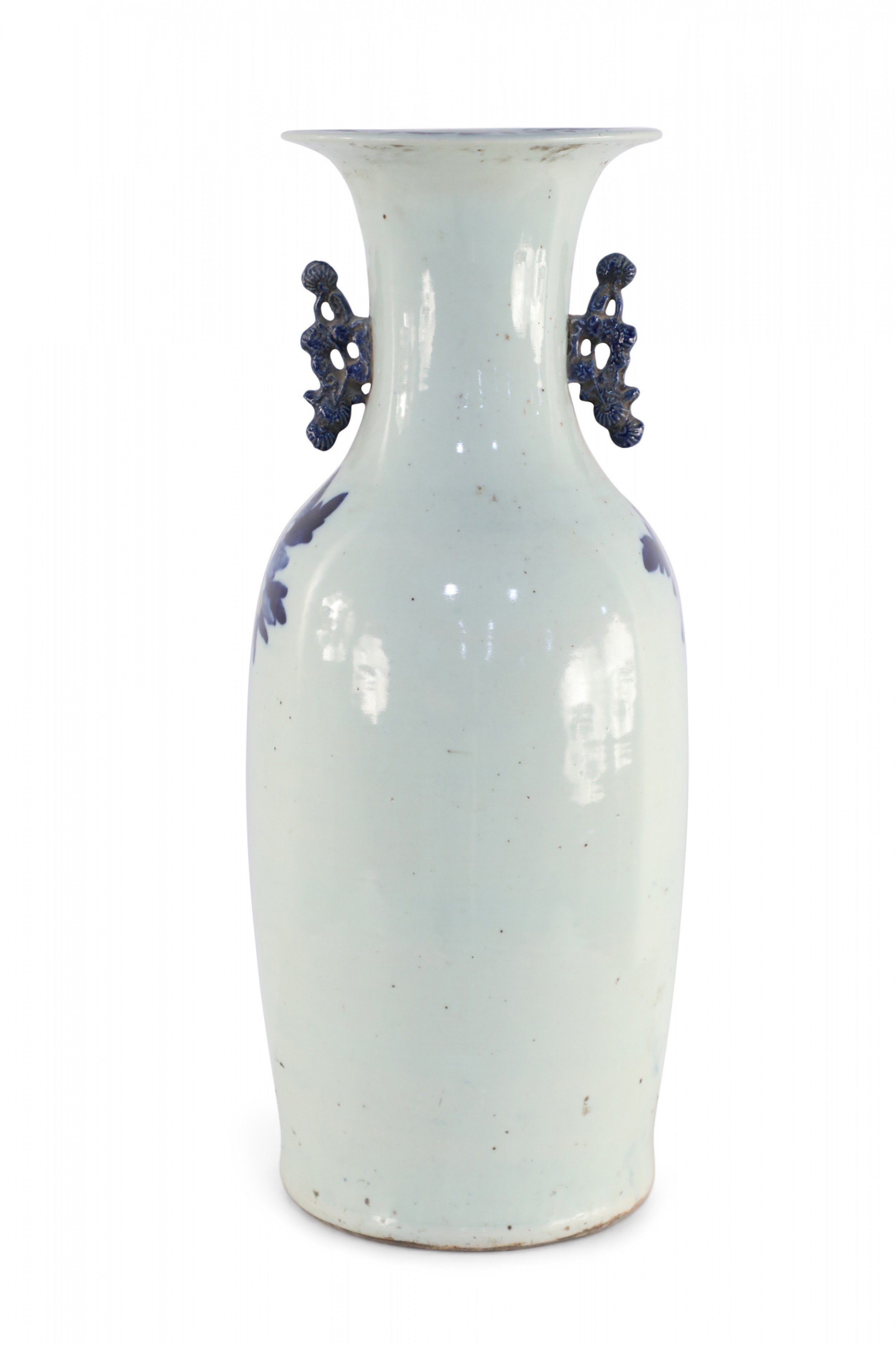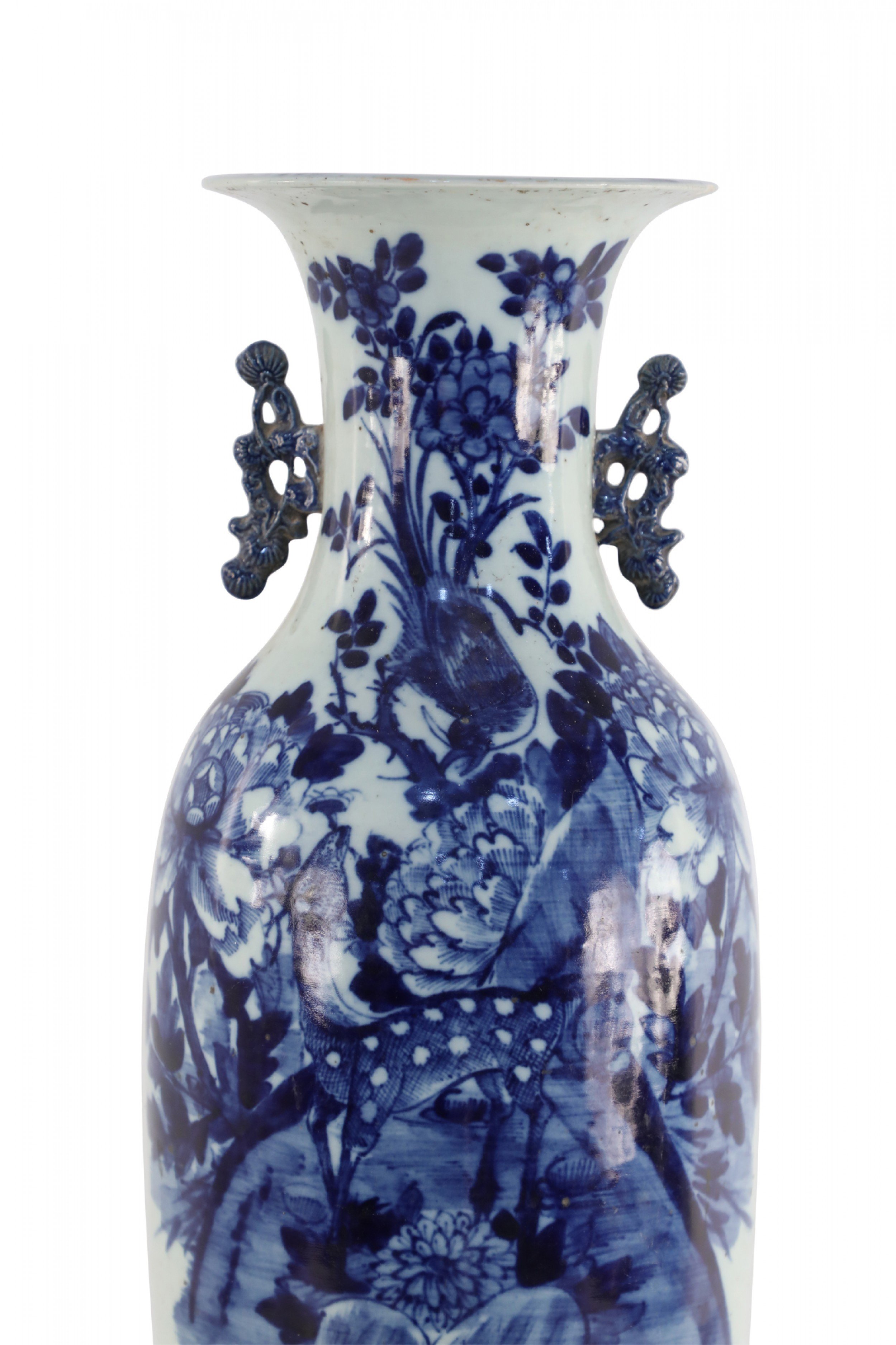 Antique Chinese (Late 19th Century) large porcelain urn with blue spotted deer amid florals on an off-white background and two navy scrolled handles along the neck.