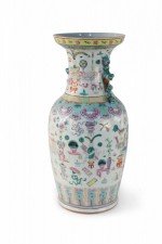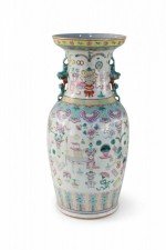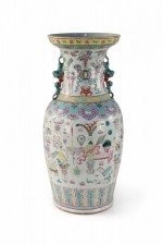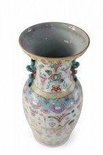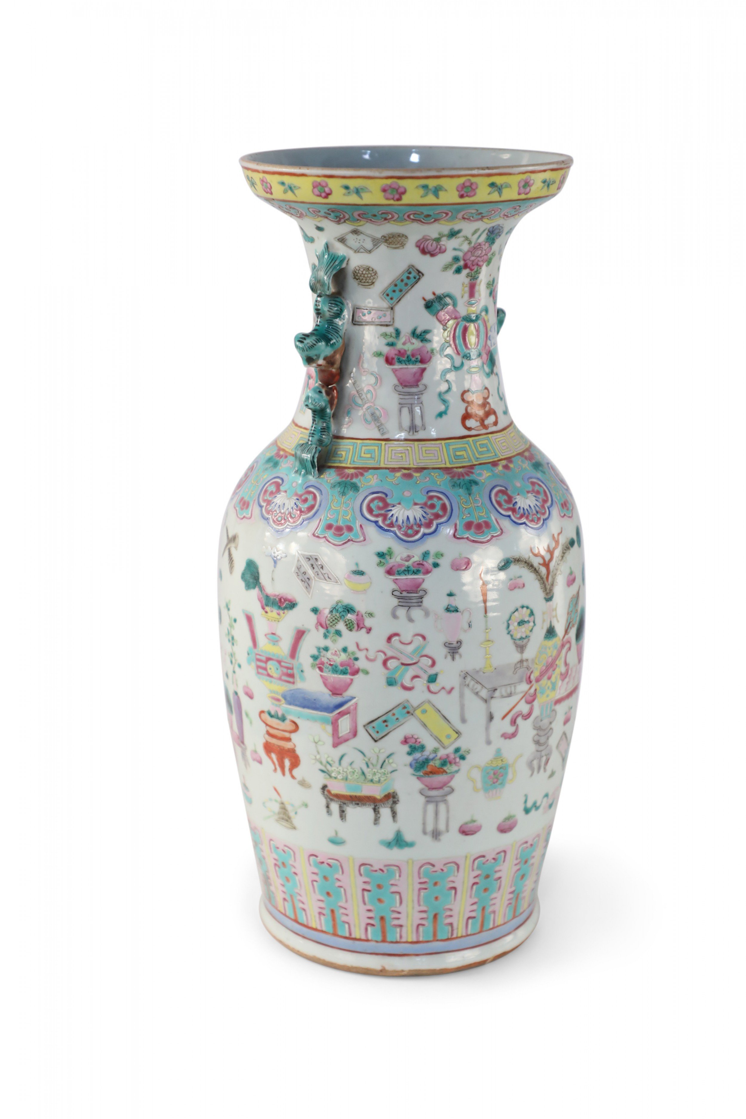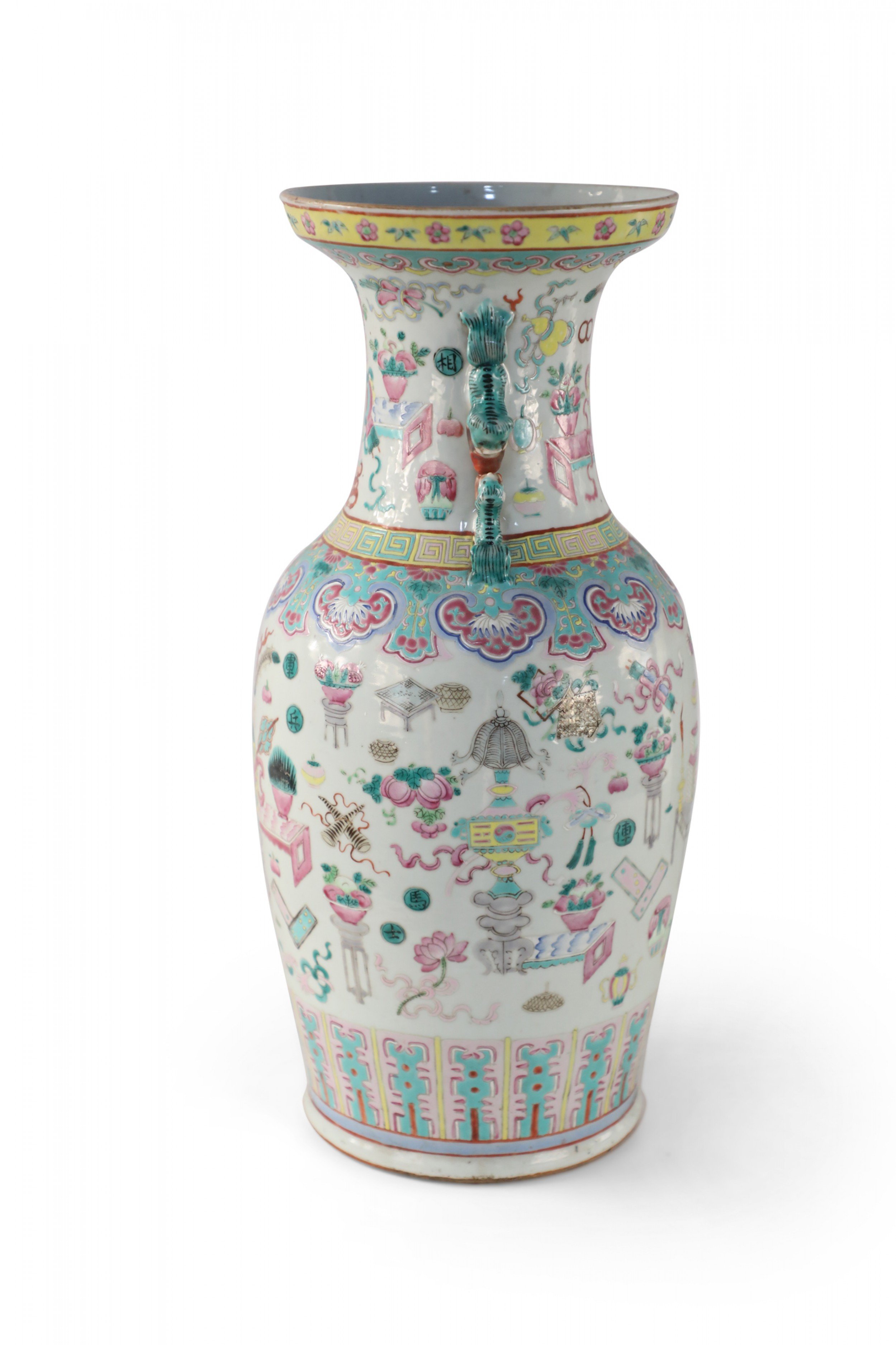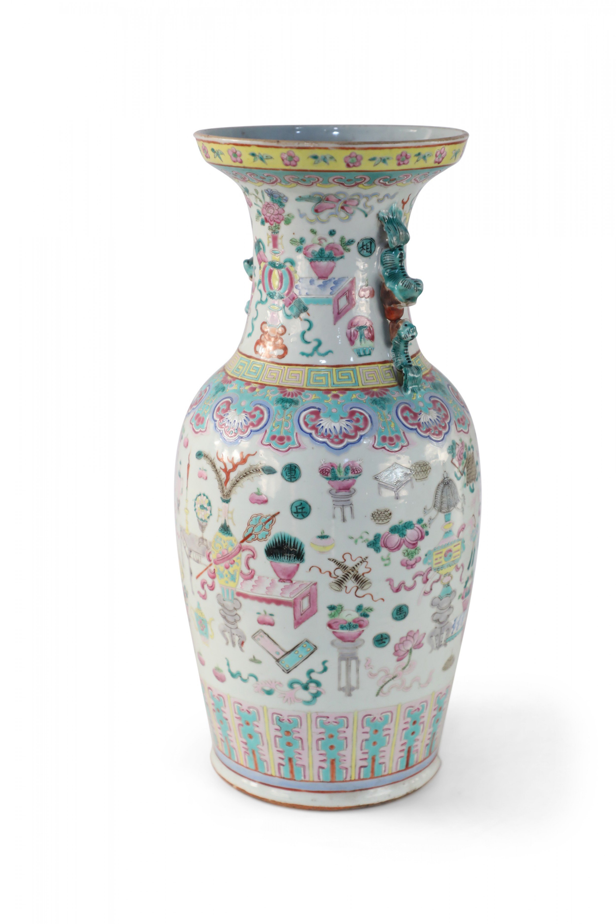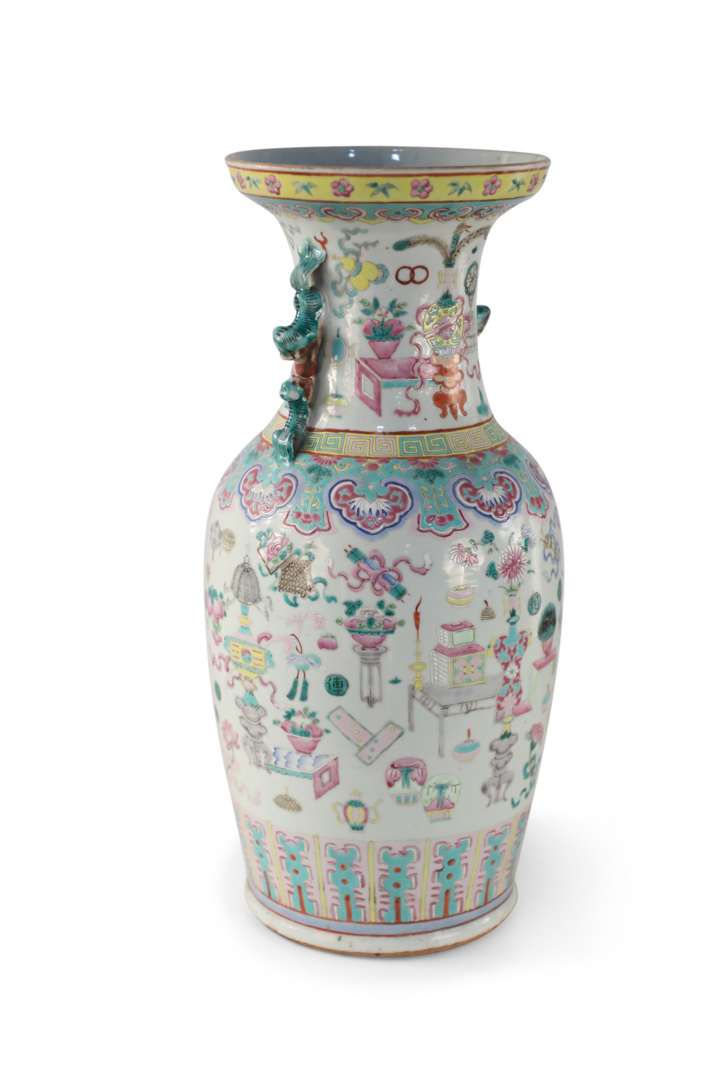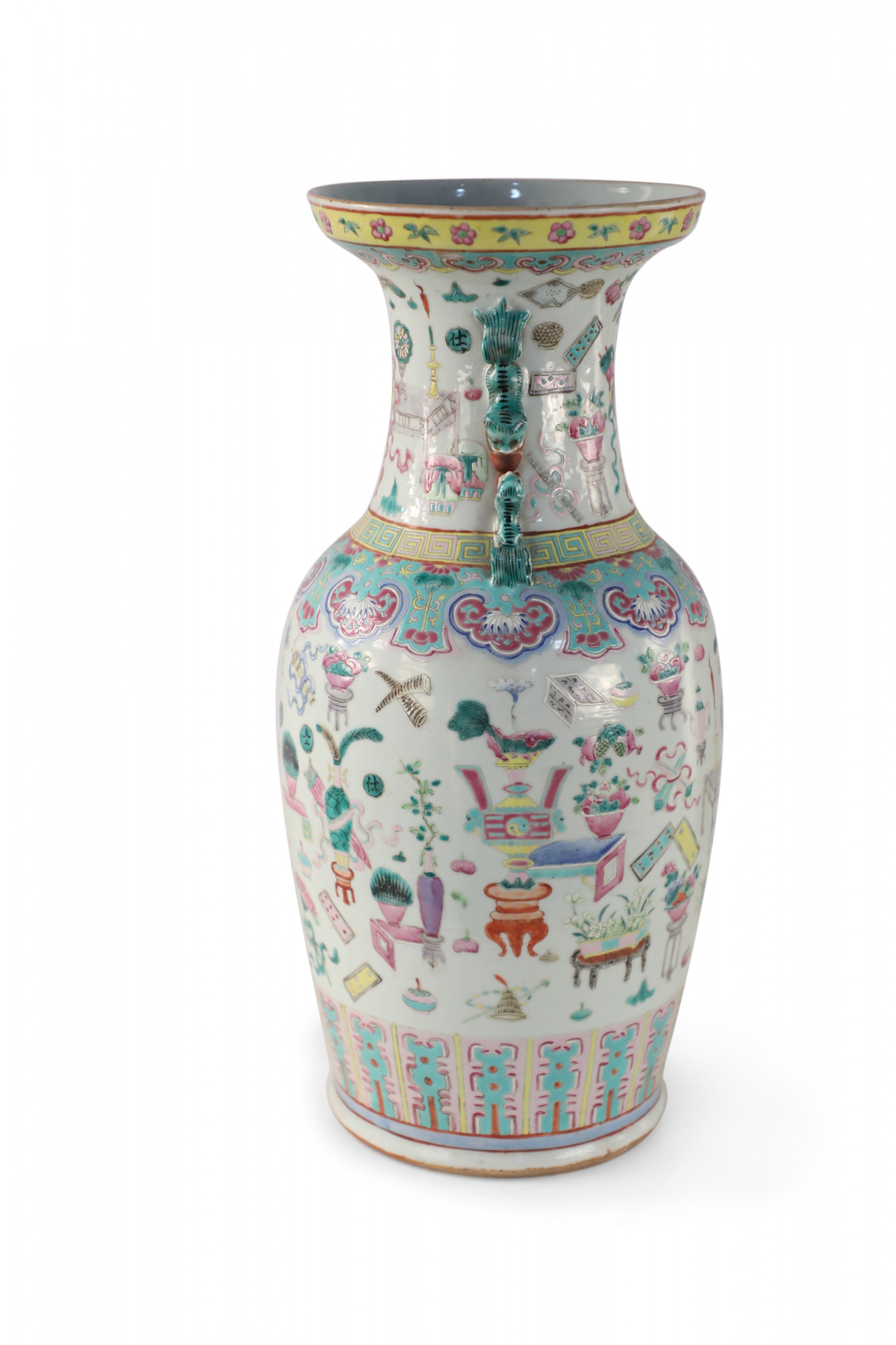 Antique Chinese (Late 19th Century) white porcelain vase painted with a pink and green bogu pattern featuring bonsai, art objects, and calligraphy, green tiger ornamentation on each side of the neck and a yellow band around the vase mouth.