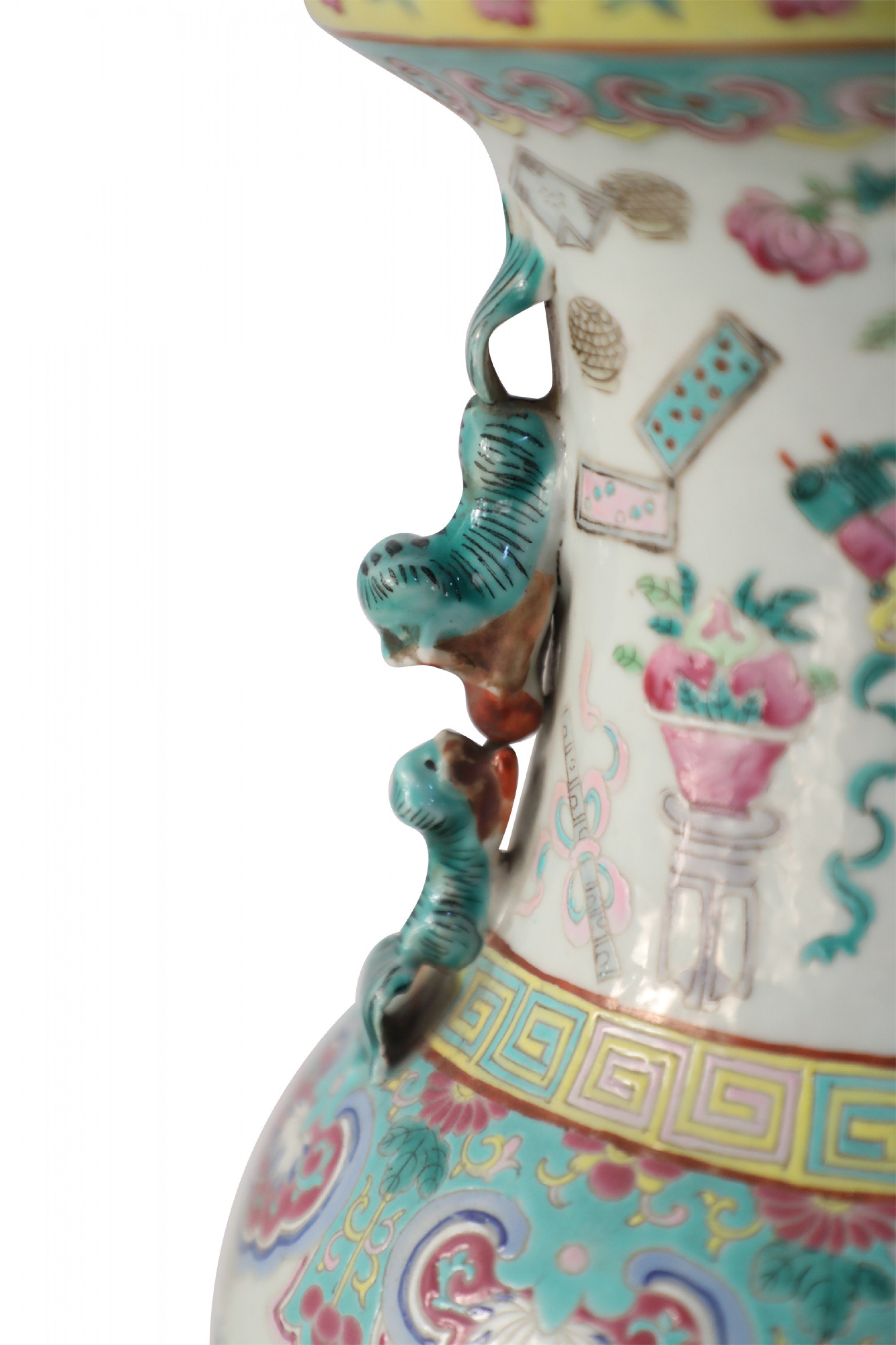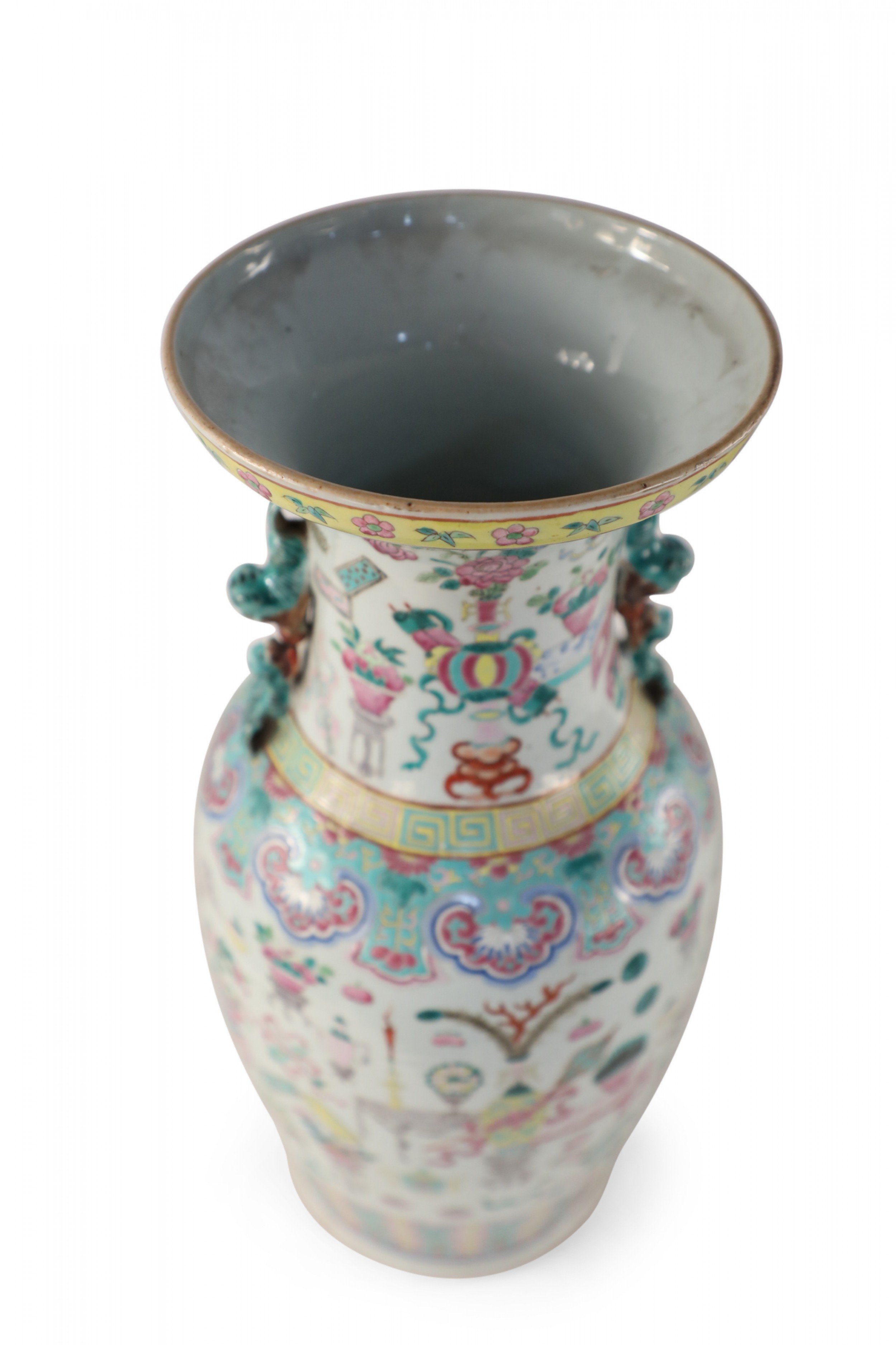 Antique Chinese (Late 19th Century) white porcelain vase painted with a pink and green bogu pattern featuring bonsai, art objects, and calligraphy, green tiger ornamentation on each side of the neck and a yellow band around the vase mouth..