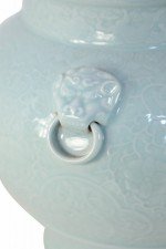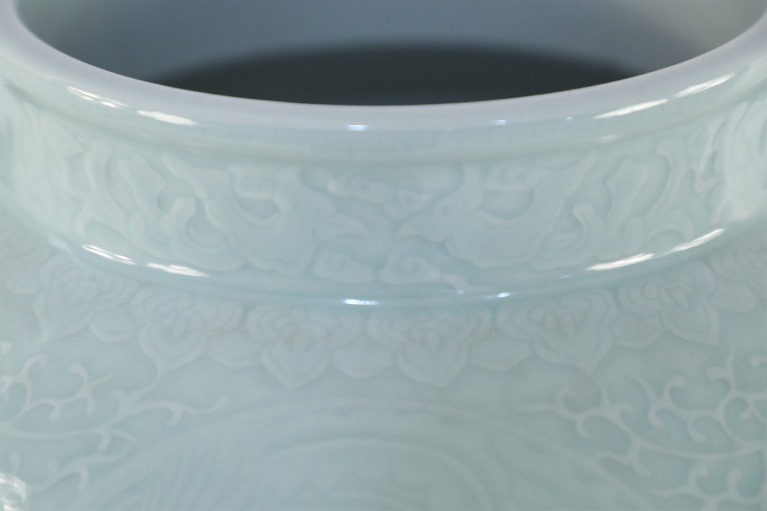 Chinese celadon, porcelain pot decorated with a raised, tonal botanical and dragon design wrapping the entirety of its bulbous form and accented with foo dog door knocker ornamentation along the sides..