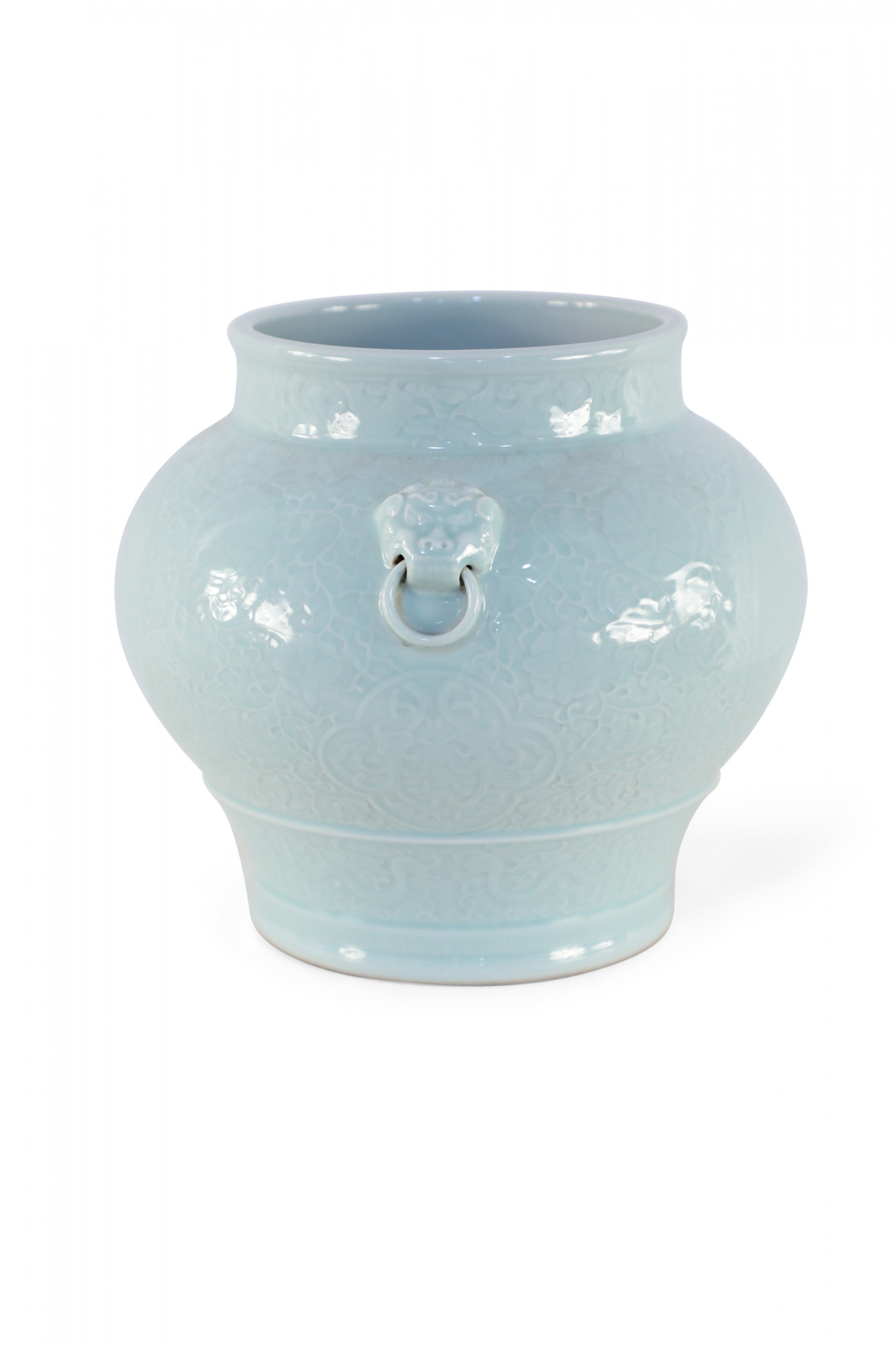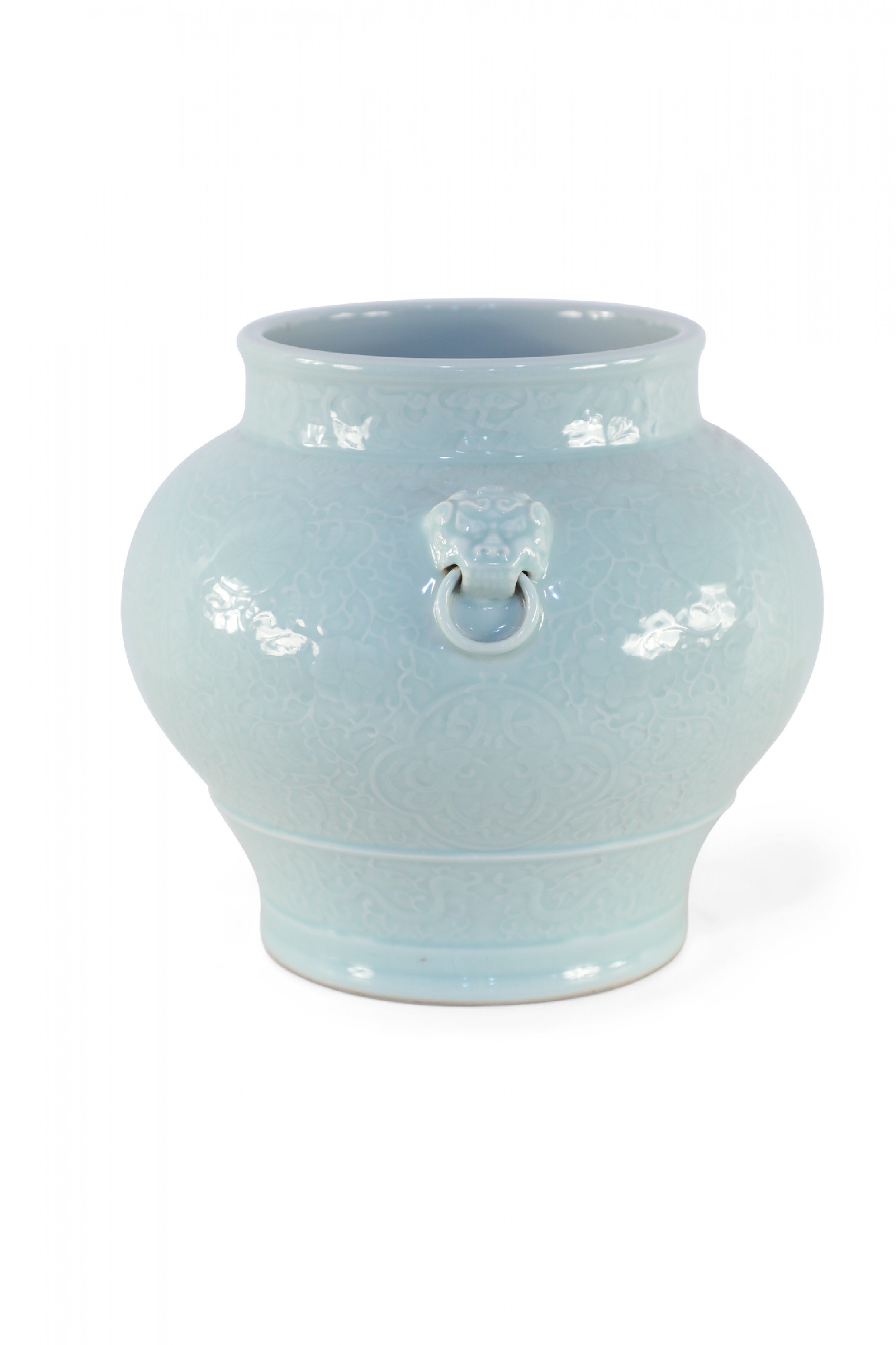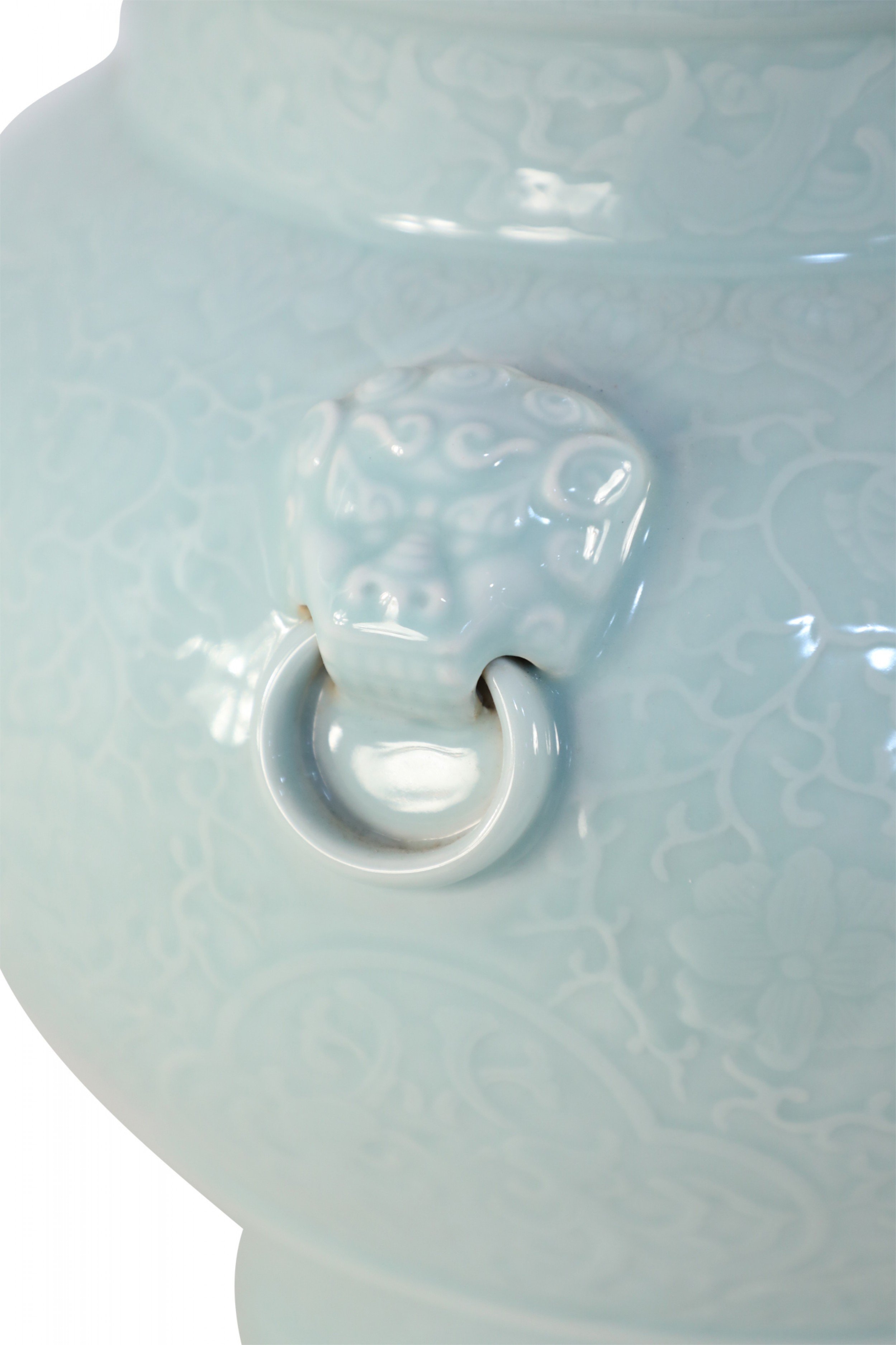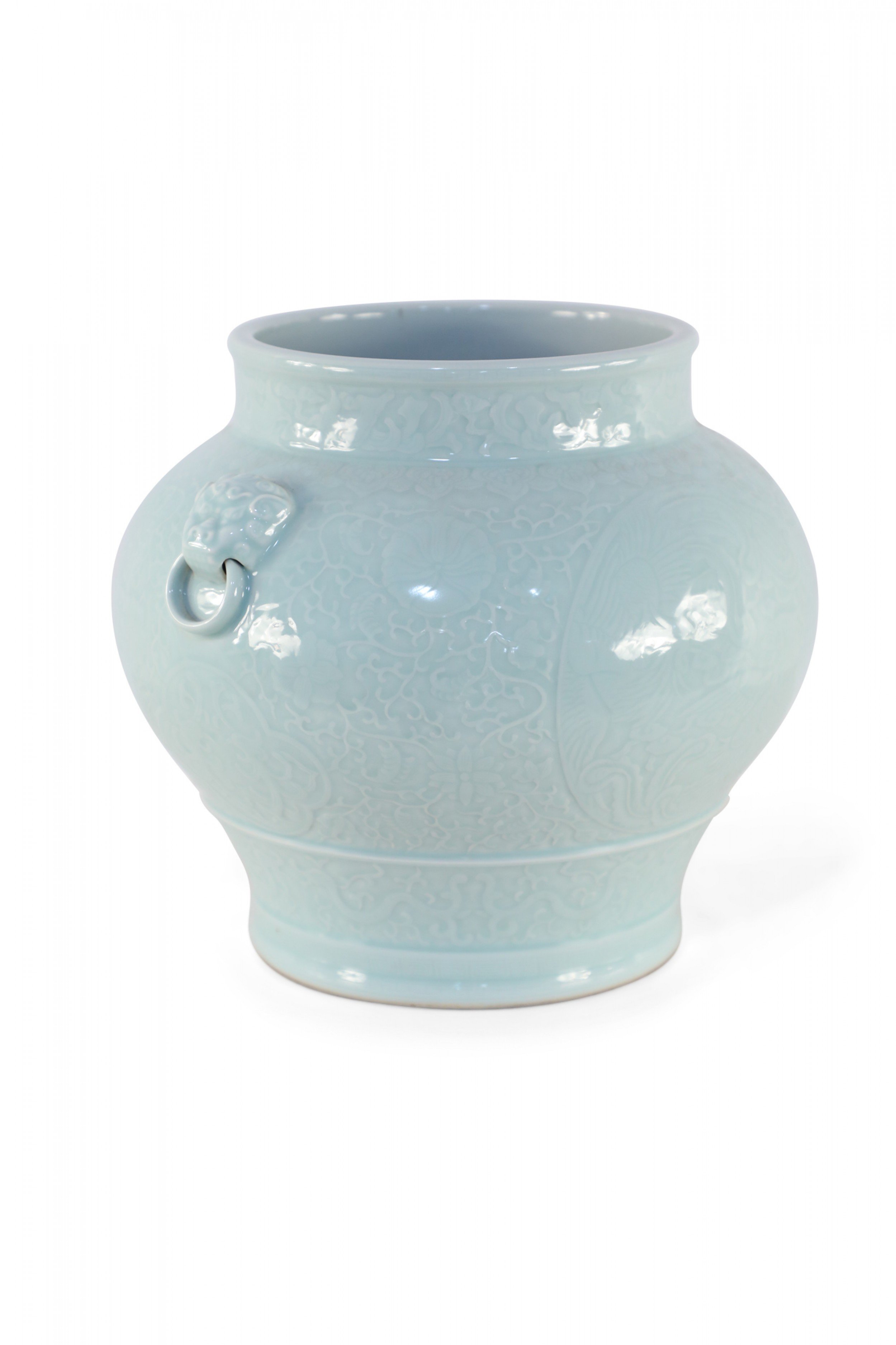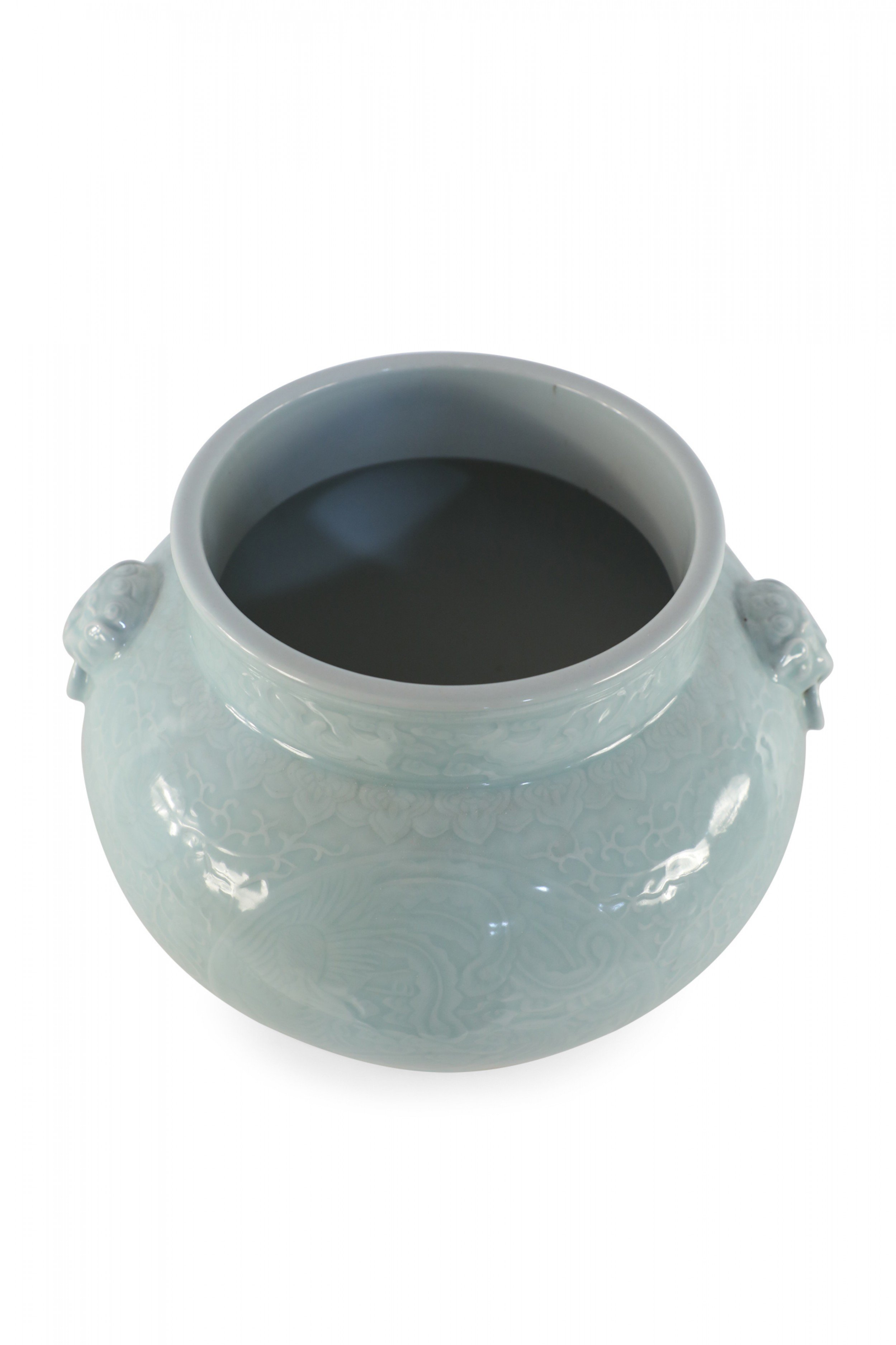 Chinese celadon, porcelain pot decorated with a raised, tonal botanical and dragon design wrapping the entirety of its bulbous form and accented with foo dog door knocker ornamentation along the sides.