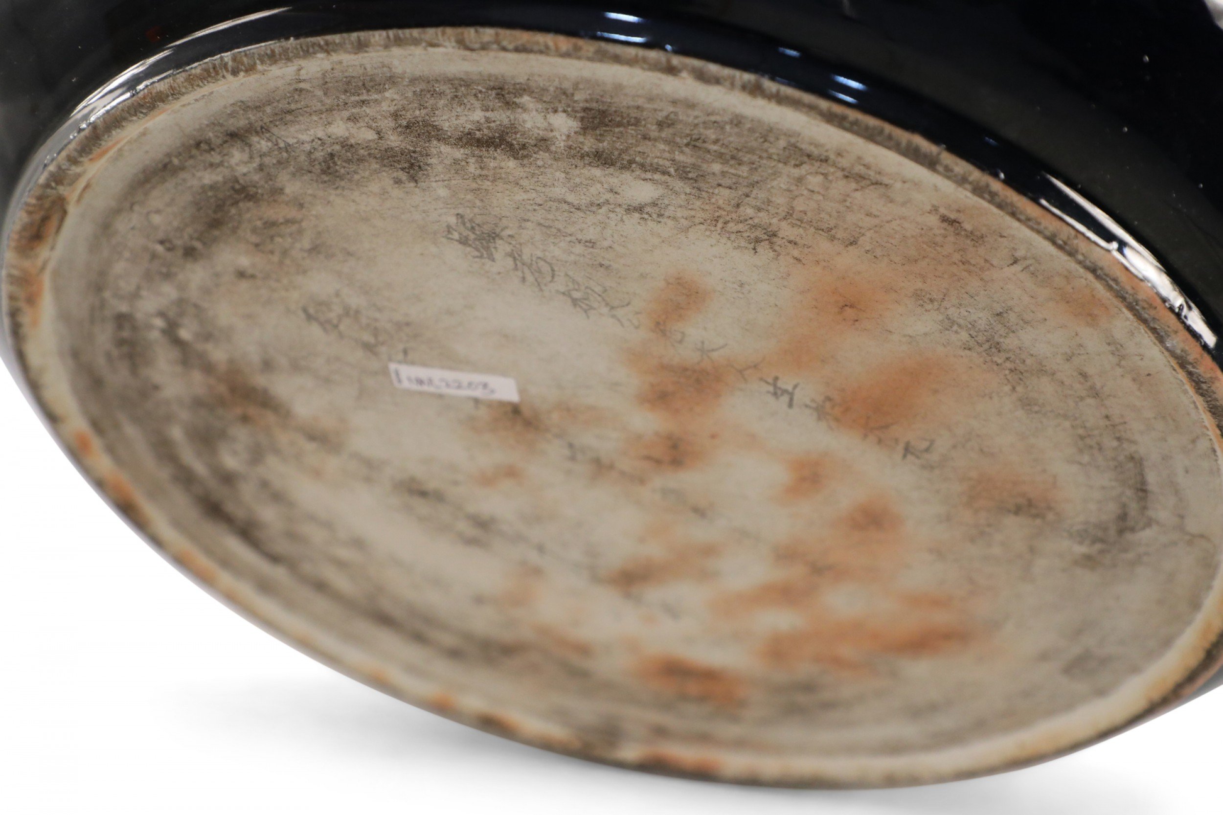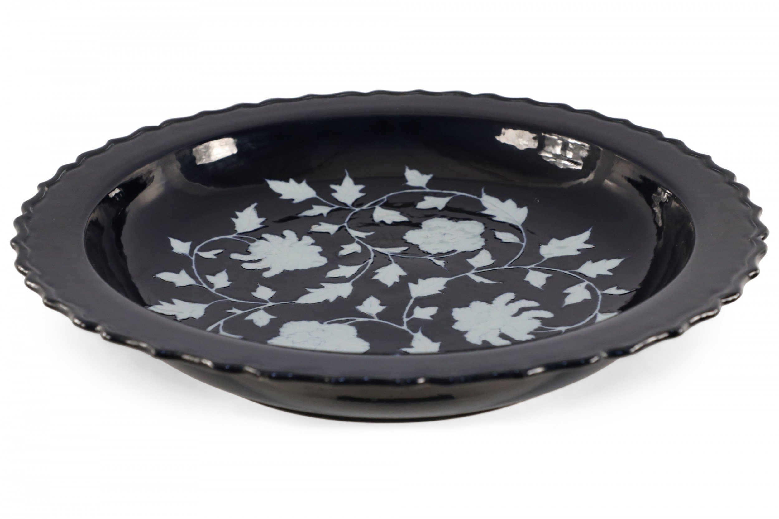 Antique Chinese (13-14th Century-style) dark blue shallow porcelain centerpiece bowl with scalloped edges and a white floral peony motif in the center..