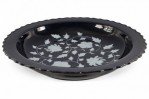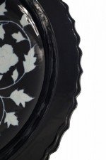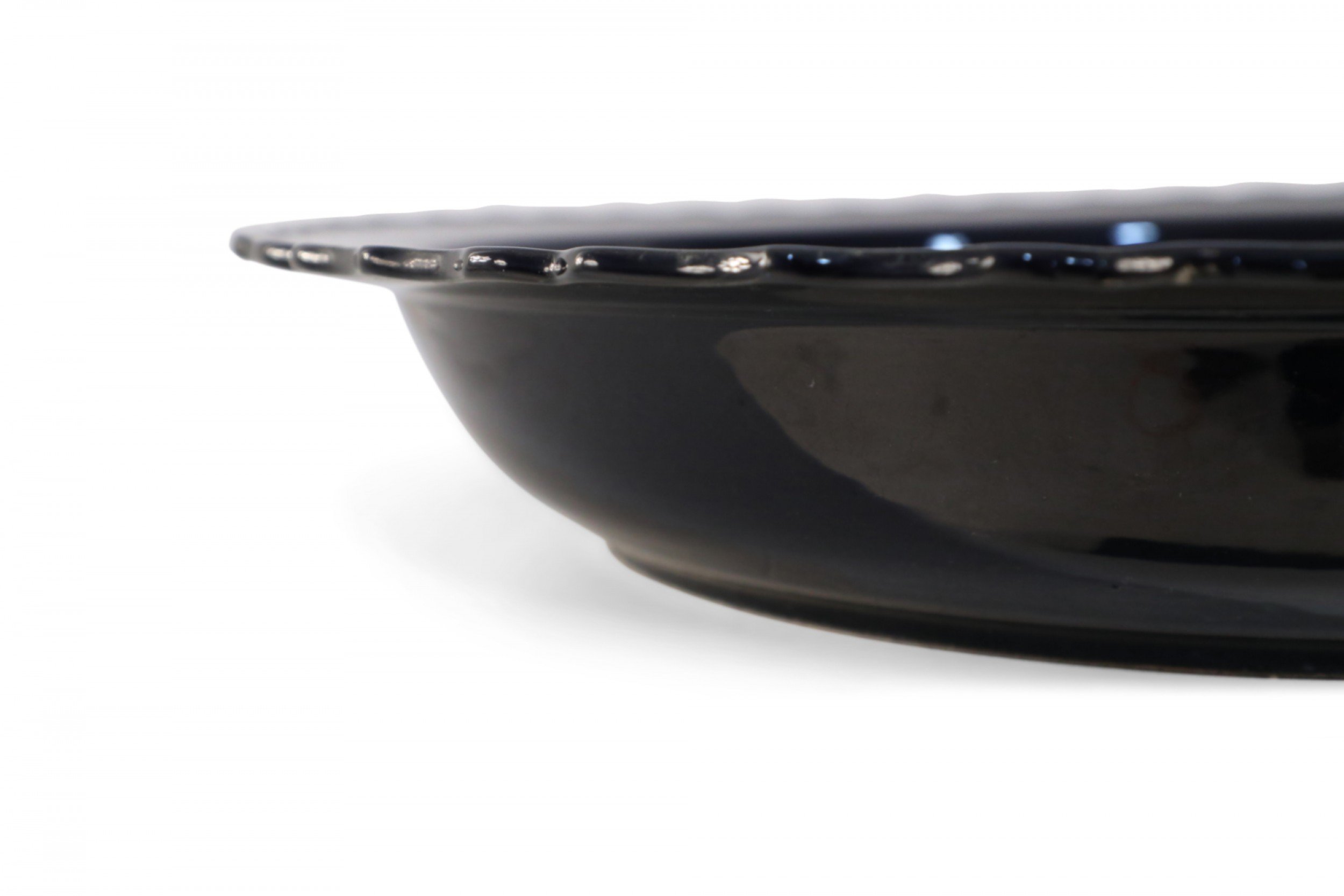 Antique Chinese (13-14th Century-style) dark blue shallow porcelain centerpiece bowl with scalloped edges and a white floral peony motif in the center.