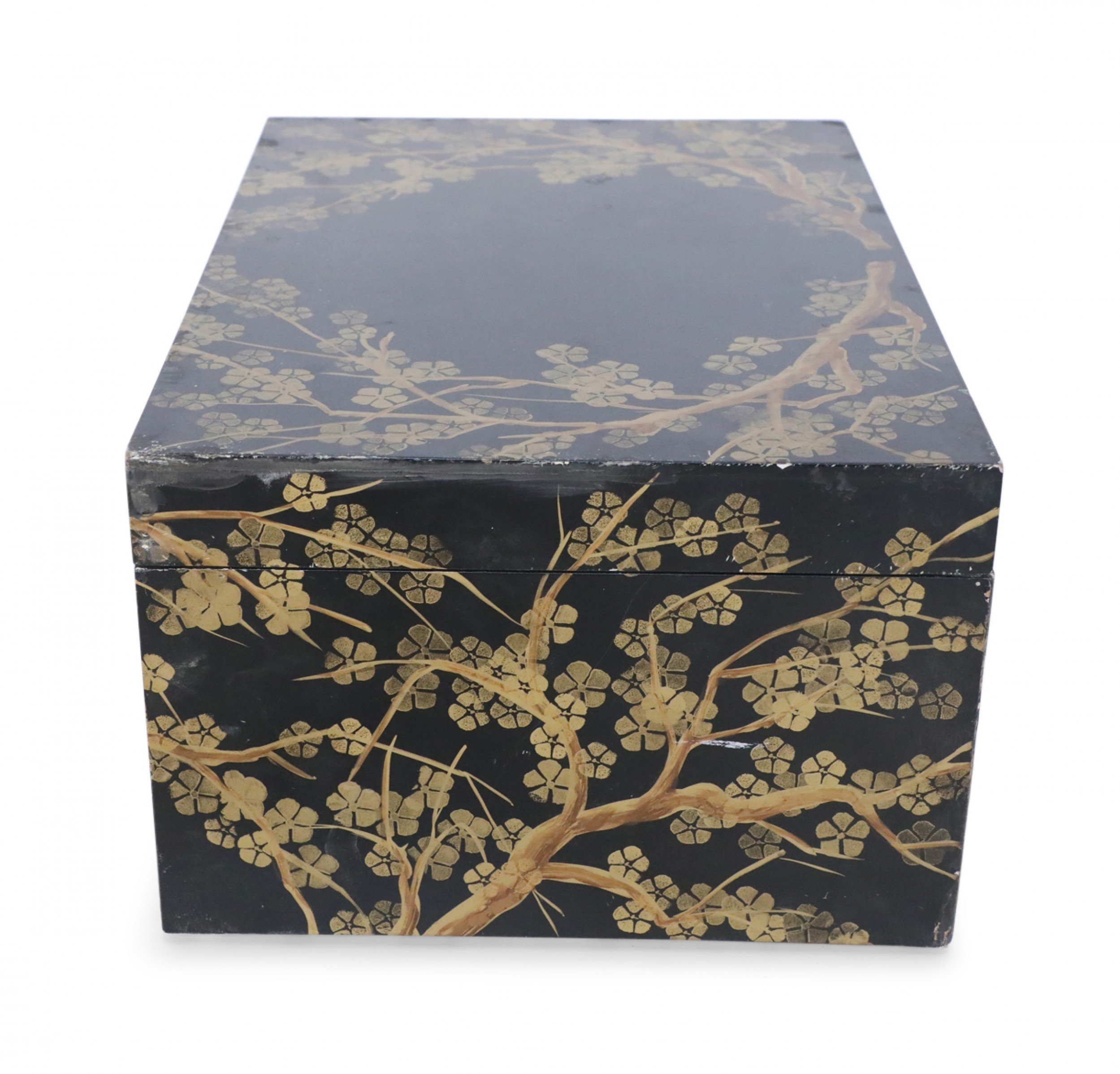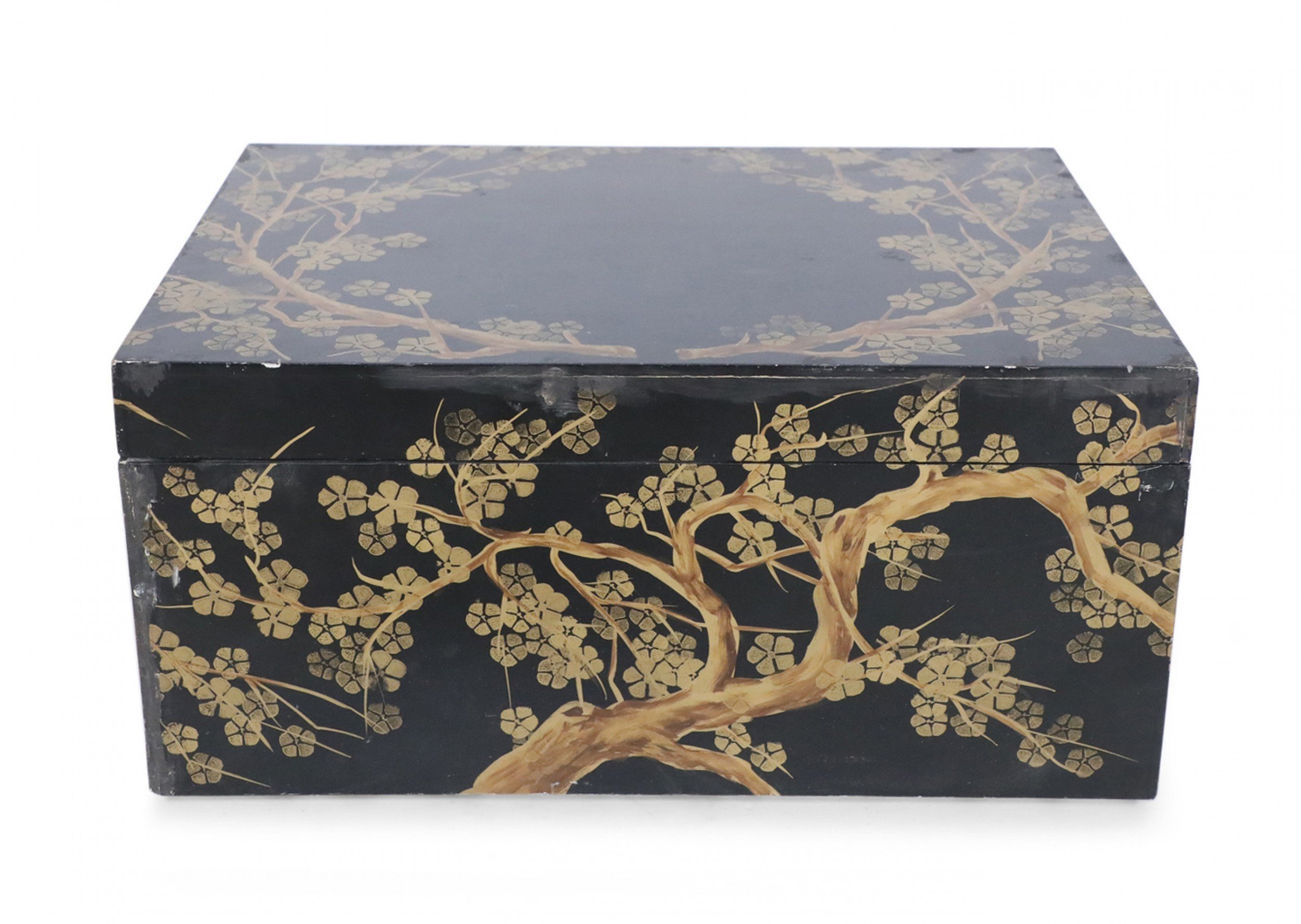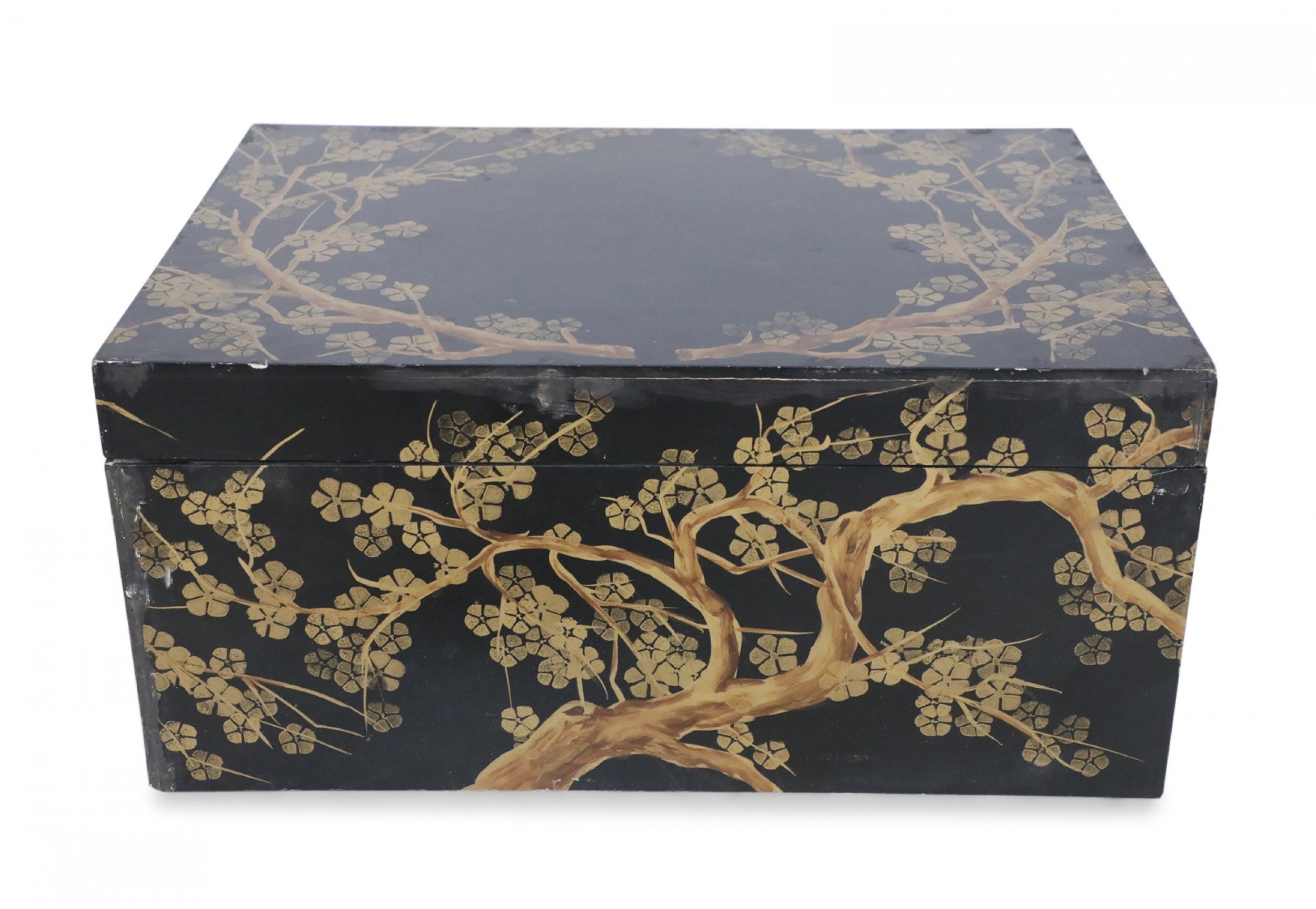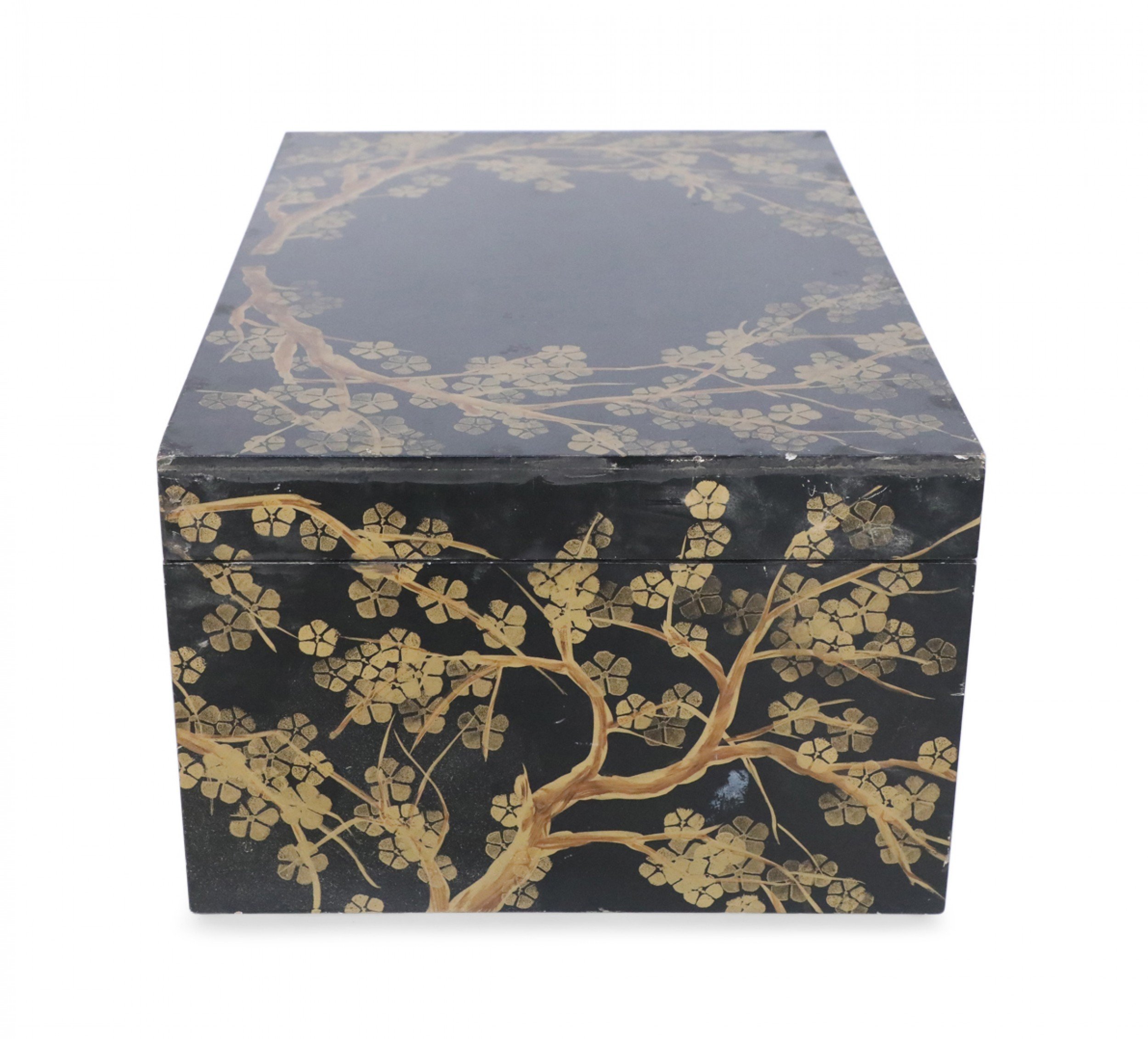 Chinese large decorative black lacquered box with gold cherry blossom design on top and sides, with a hinged lid, and small hidden feet.