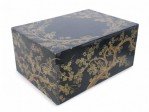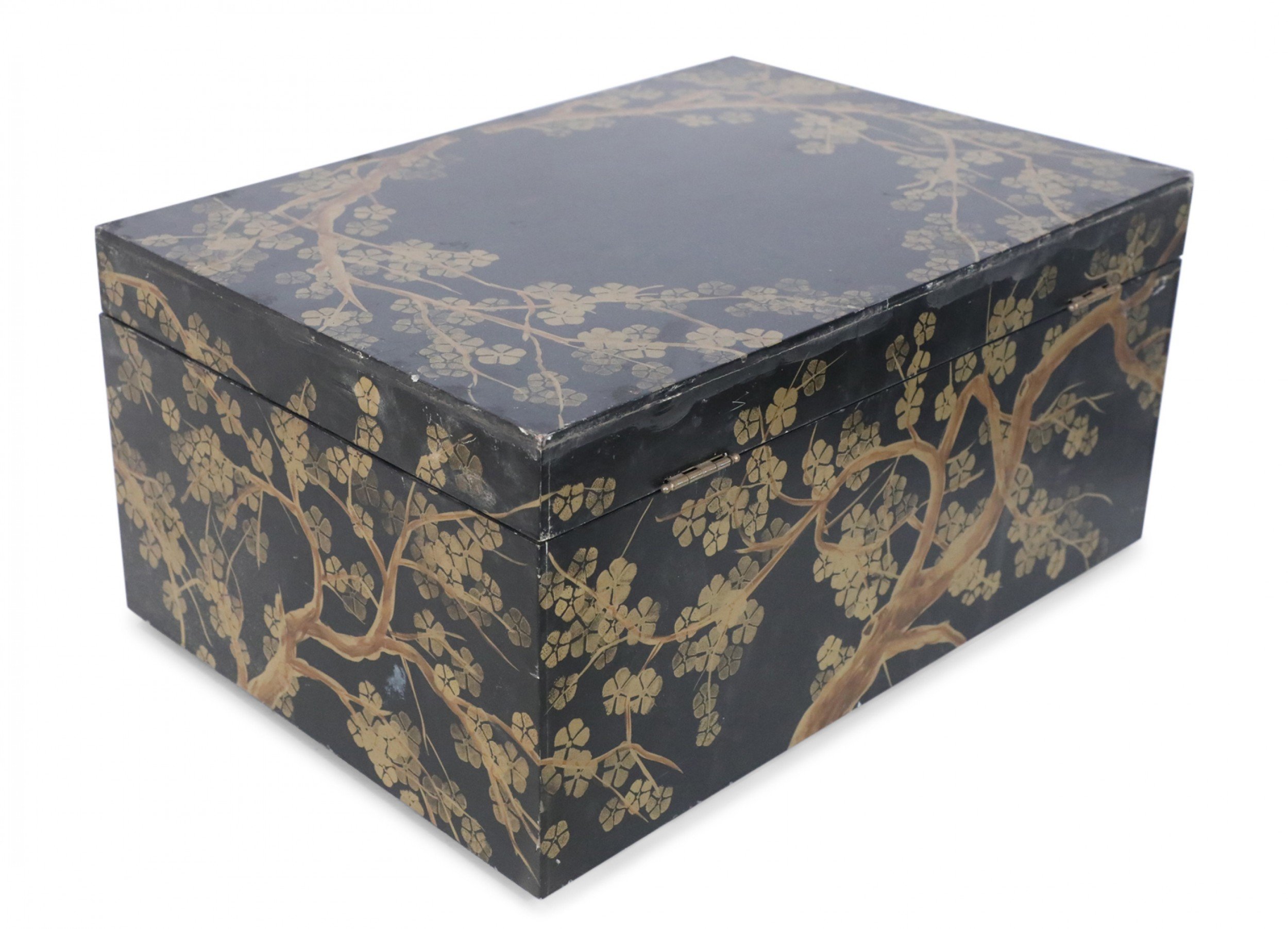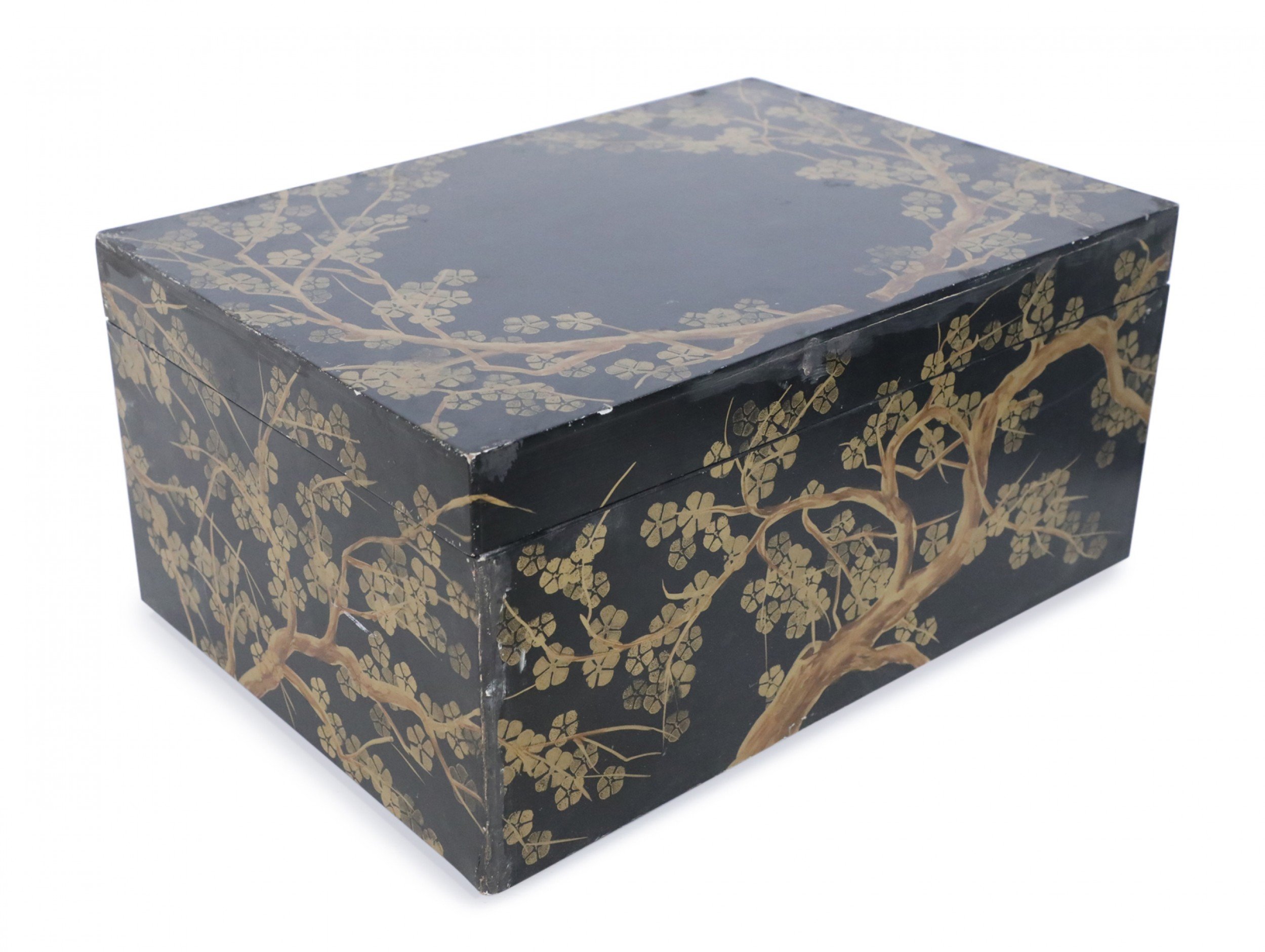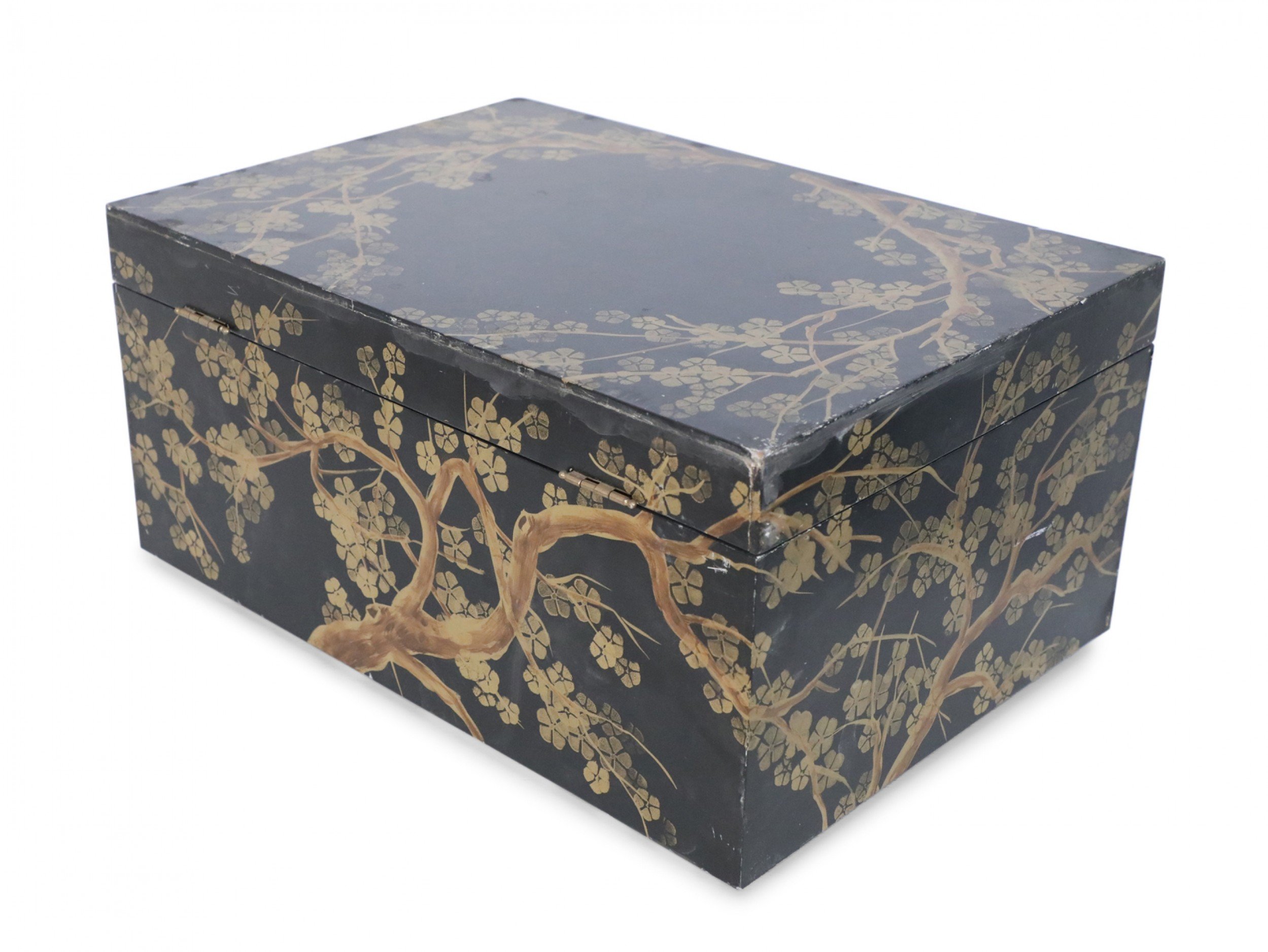 Chinese large decorative black lacquered box with gold cherry blossom design on top and sides, with a hinged lid, and small hidden feet.