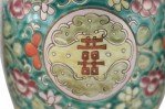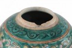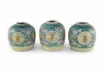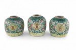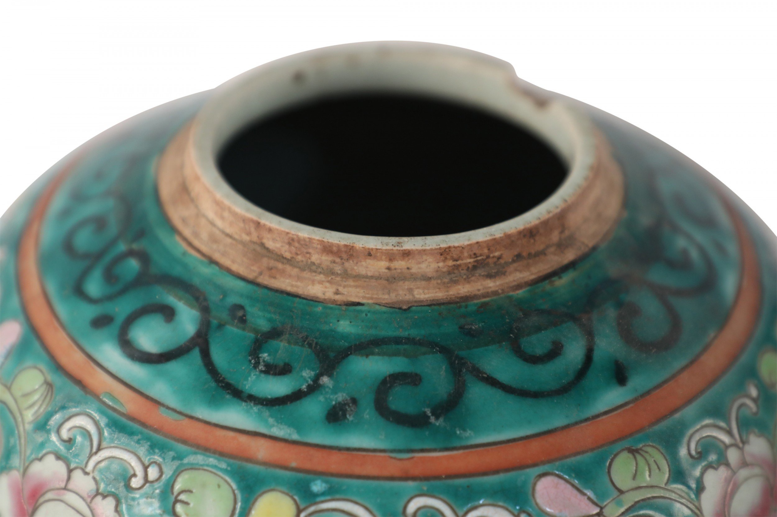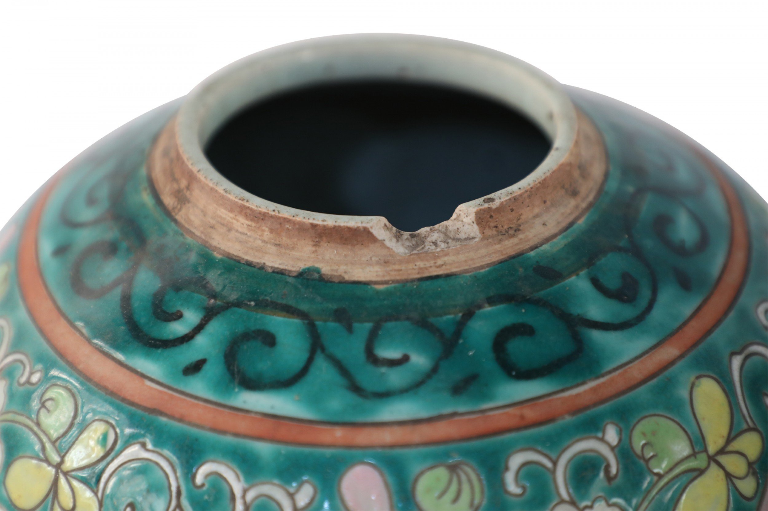 3 Antique Chinese (Early 20th Century) similar green ginger jars with floral scrolling designs surrounding circular, yellow, centered emblems, unglazed openings, and a hole in the bases (jars vary slightly in size, pattern, and color) (PRICED EACH)