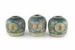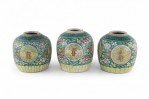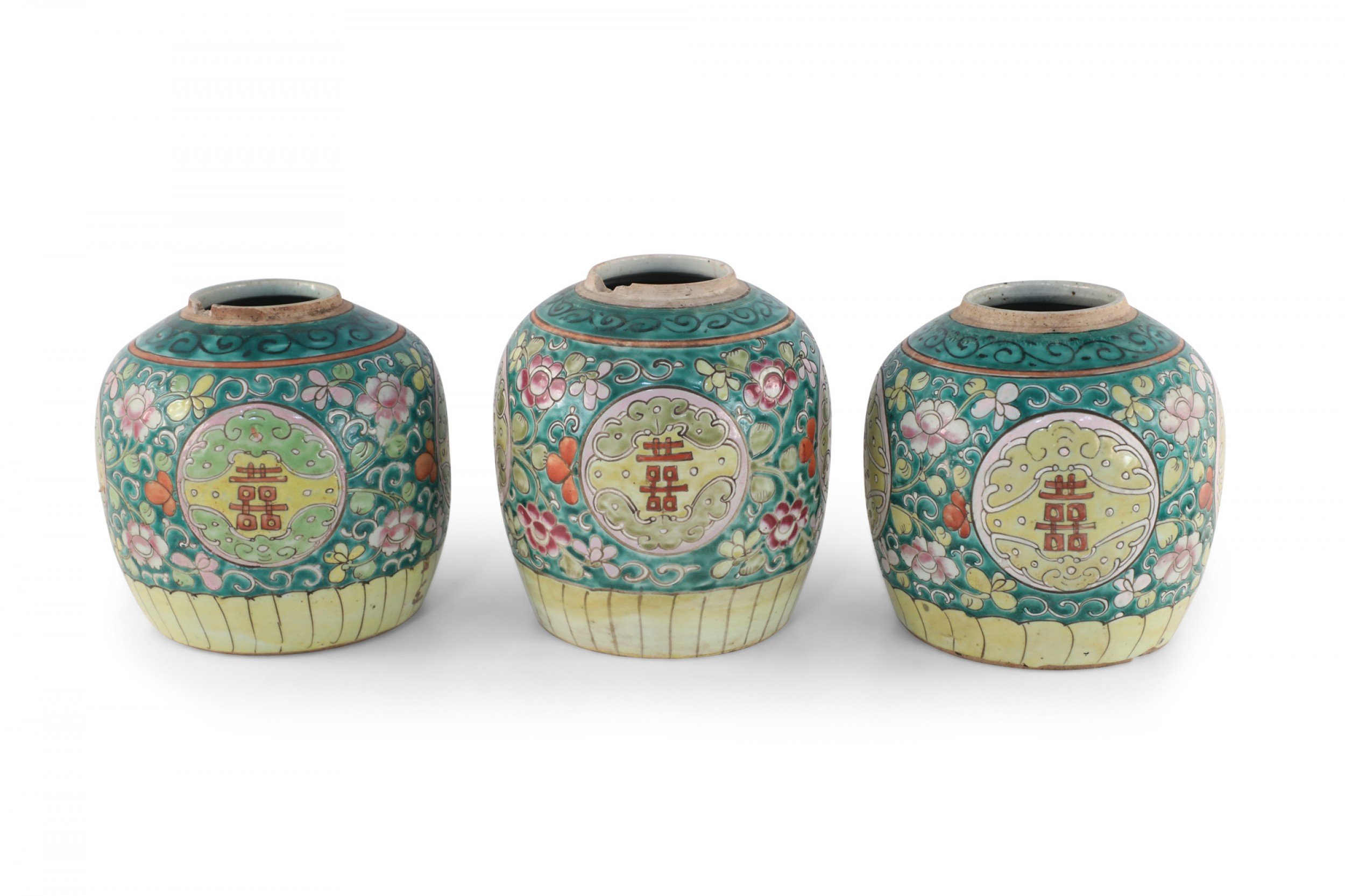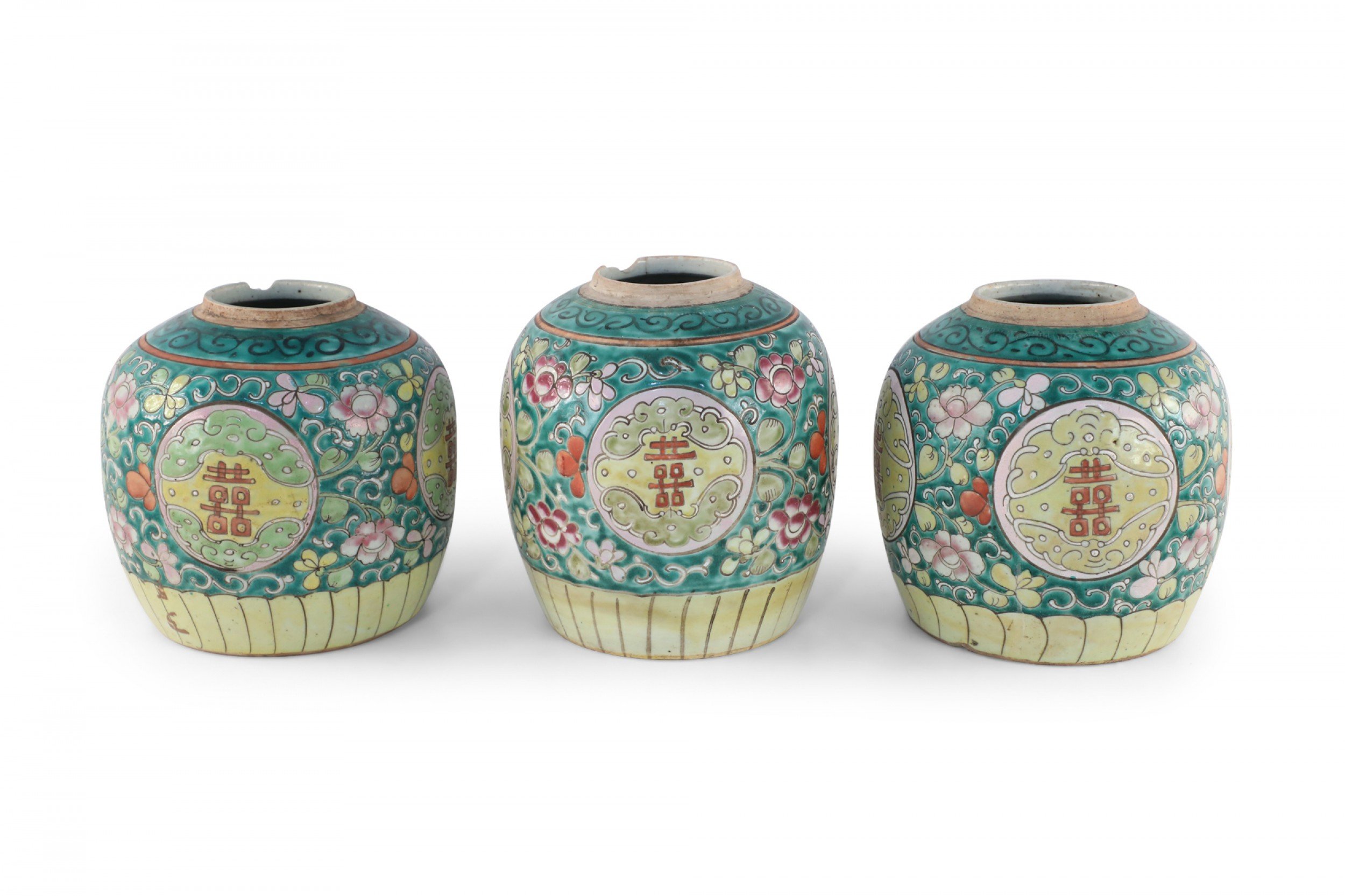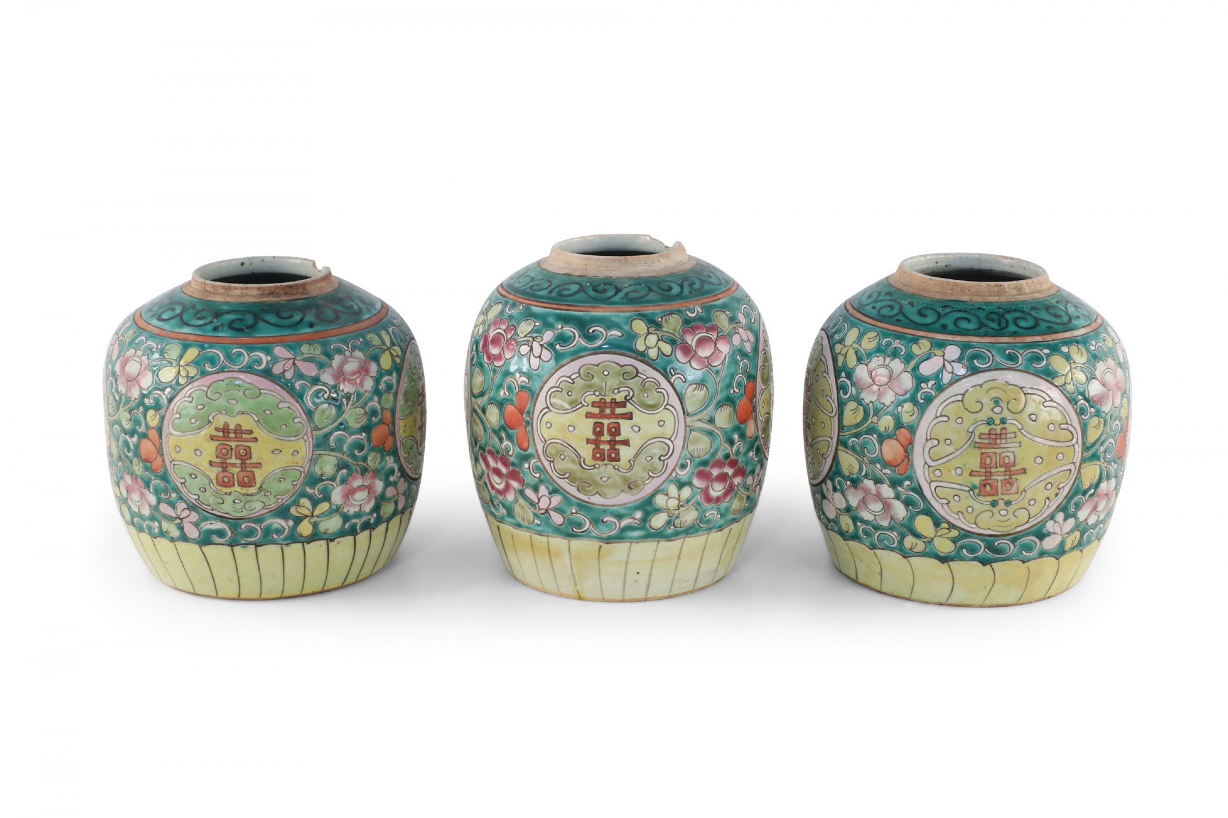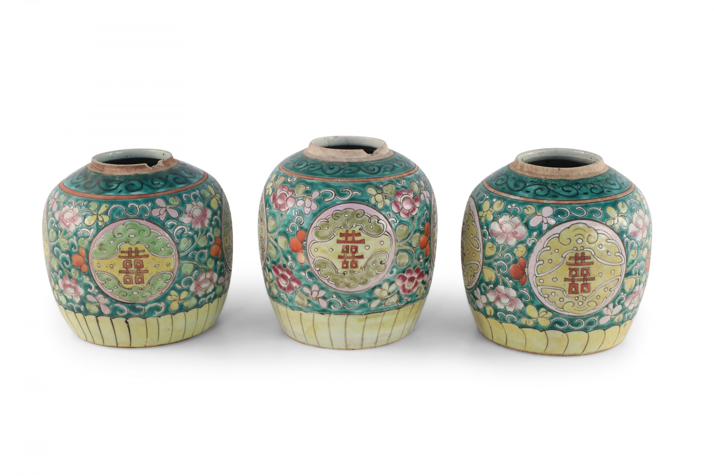 3 Antique Chinese (Early 20th Century) similar green ginger jars with floral scrolling designs surrounding circular, yellow, centered emblems, unglazed openings, and a hole in the bases (jars vary slightly in size, pattern, and color) (PRICED EACH).