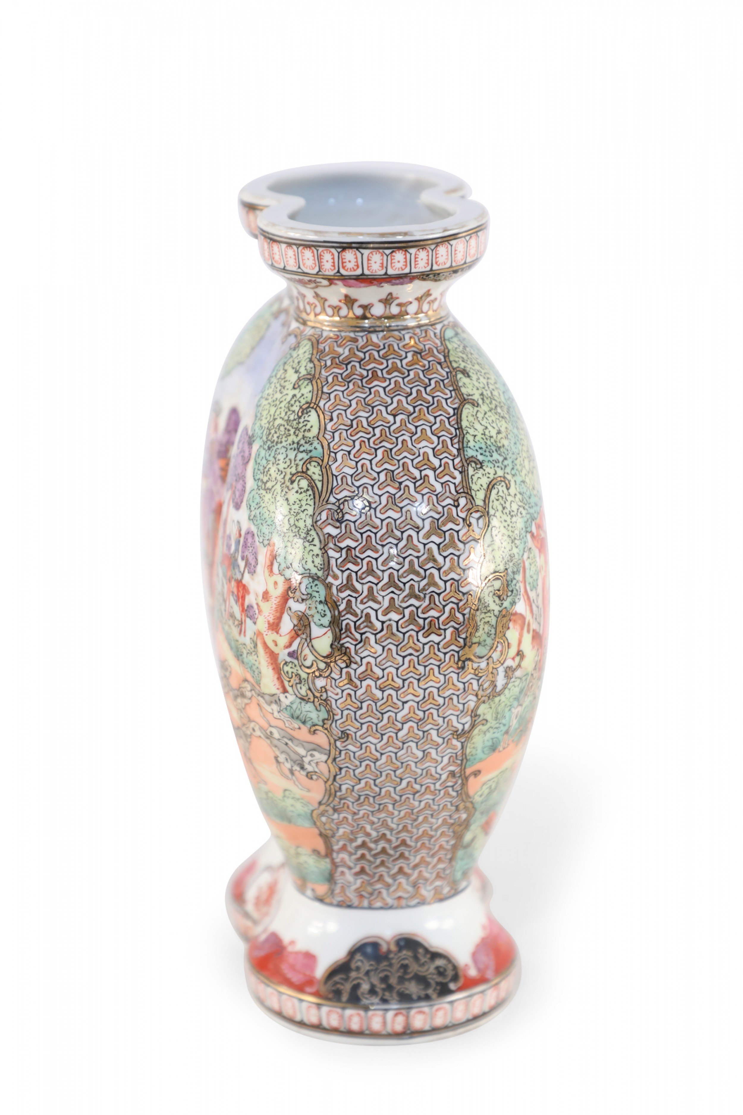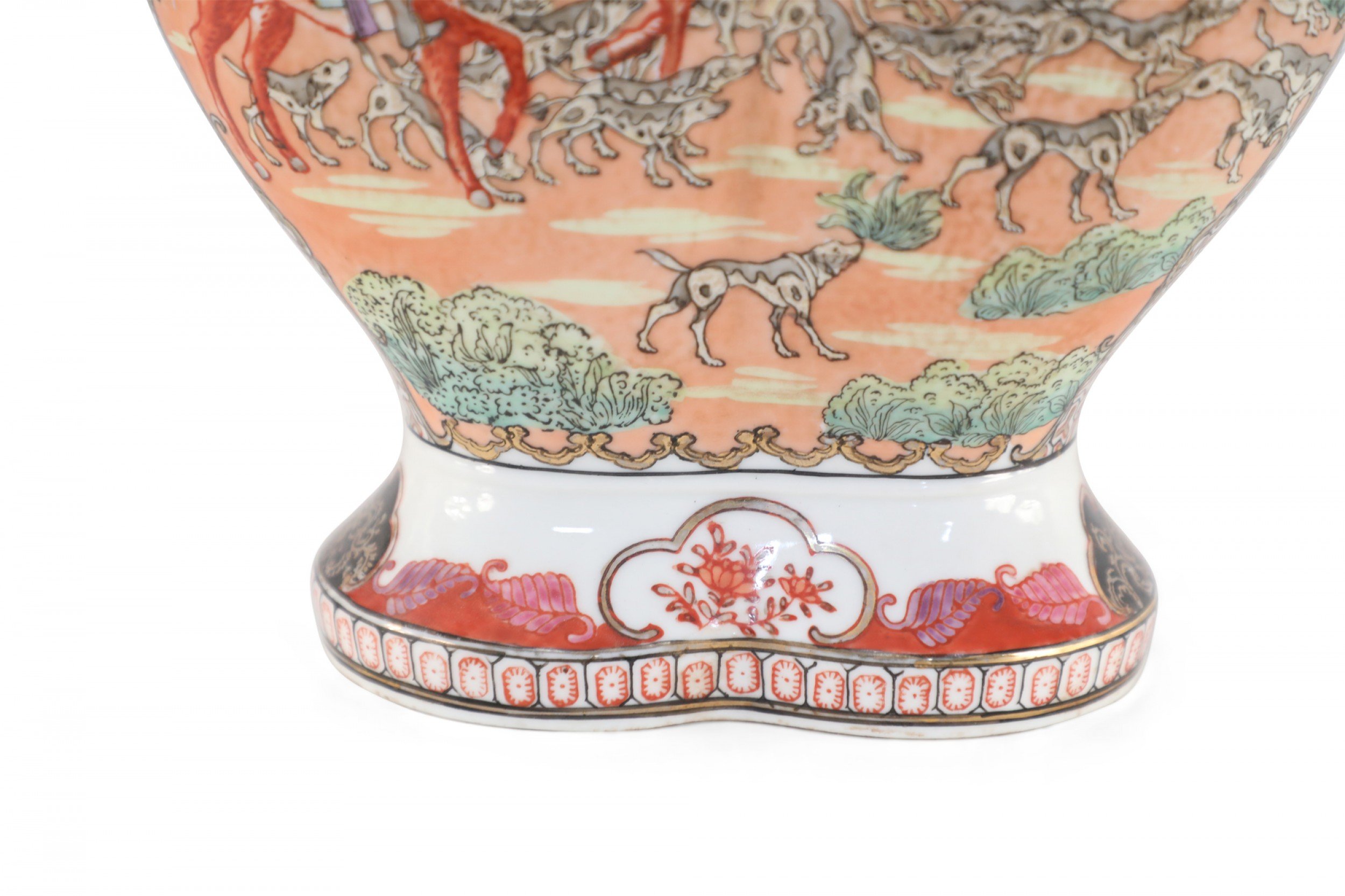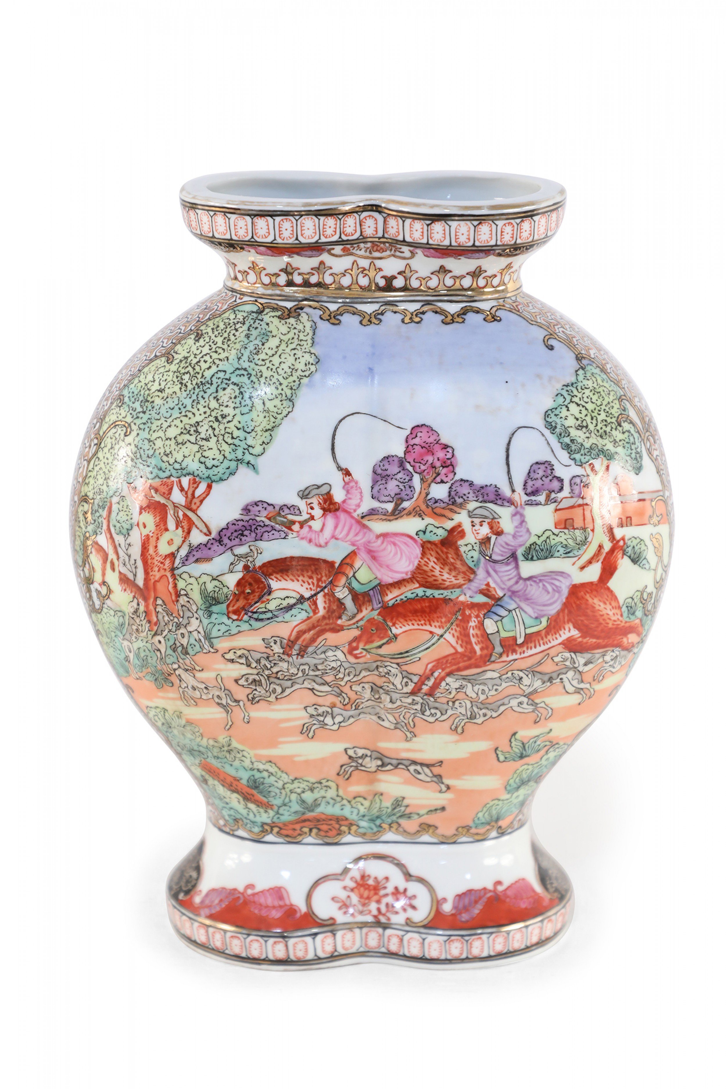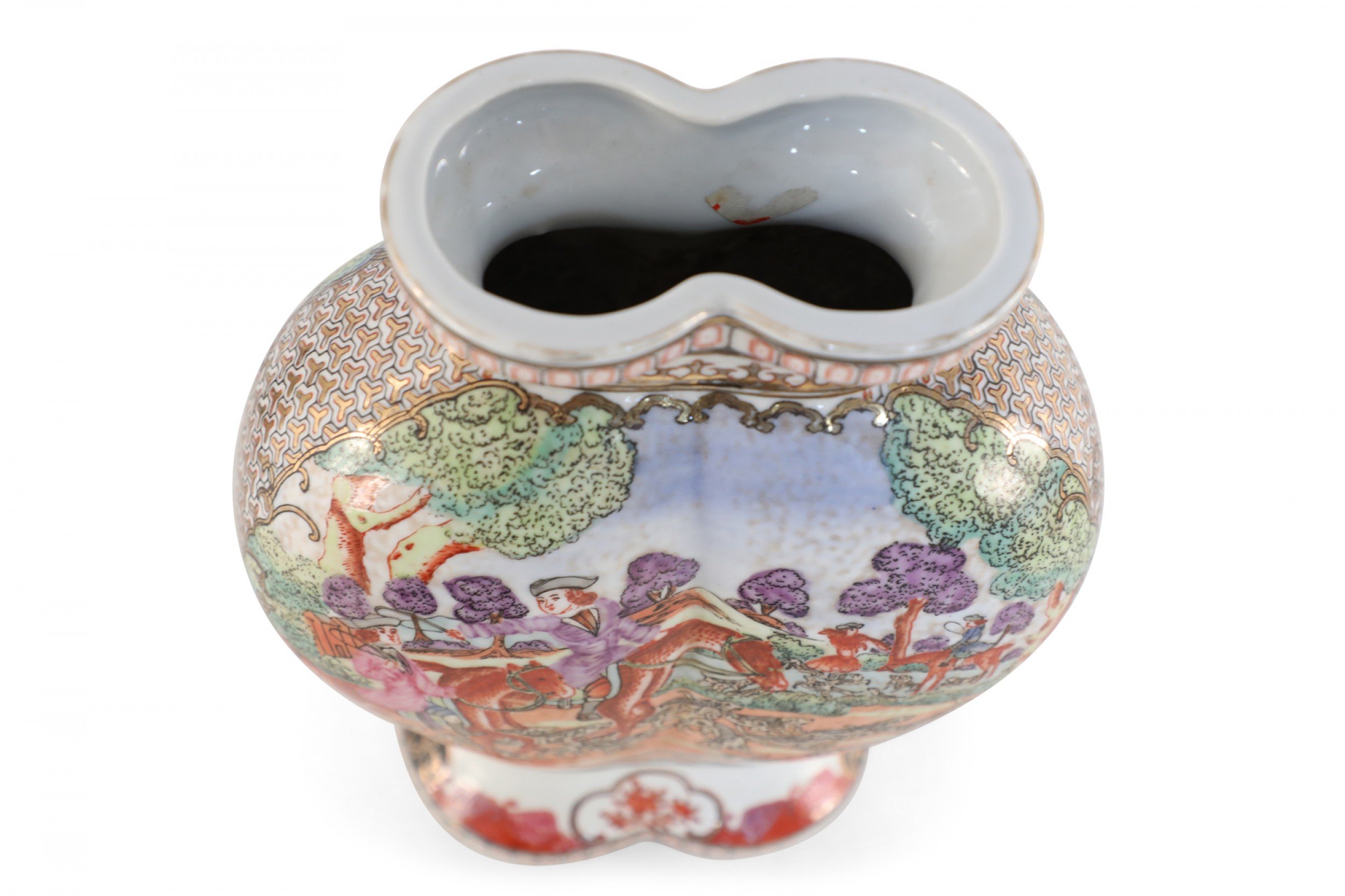 Antique Chinese (Early 20th Century) Guangzhou painted export porcelain vase with a conjoined form depicting a richly colored dog hunt scene between gold-patterned bands. (Companion pieces: NWL2151).