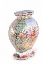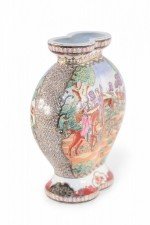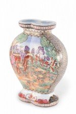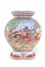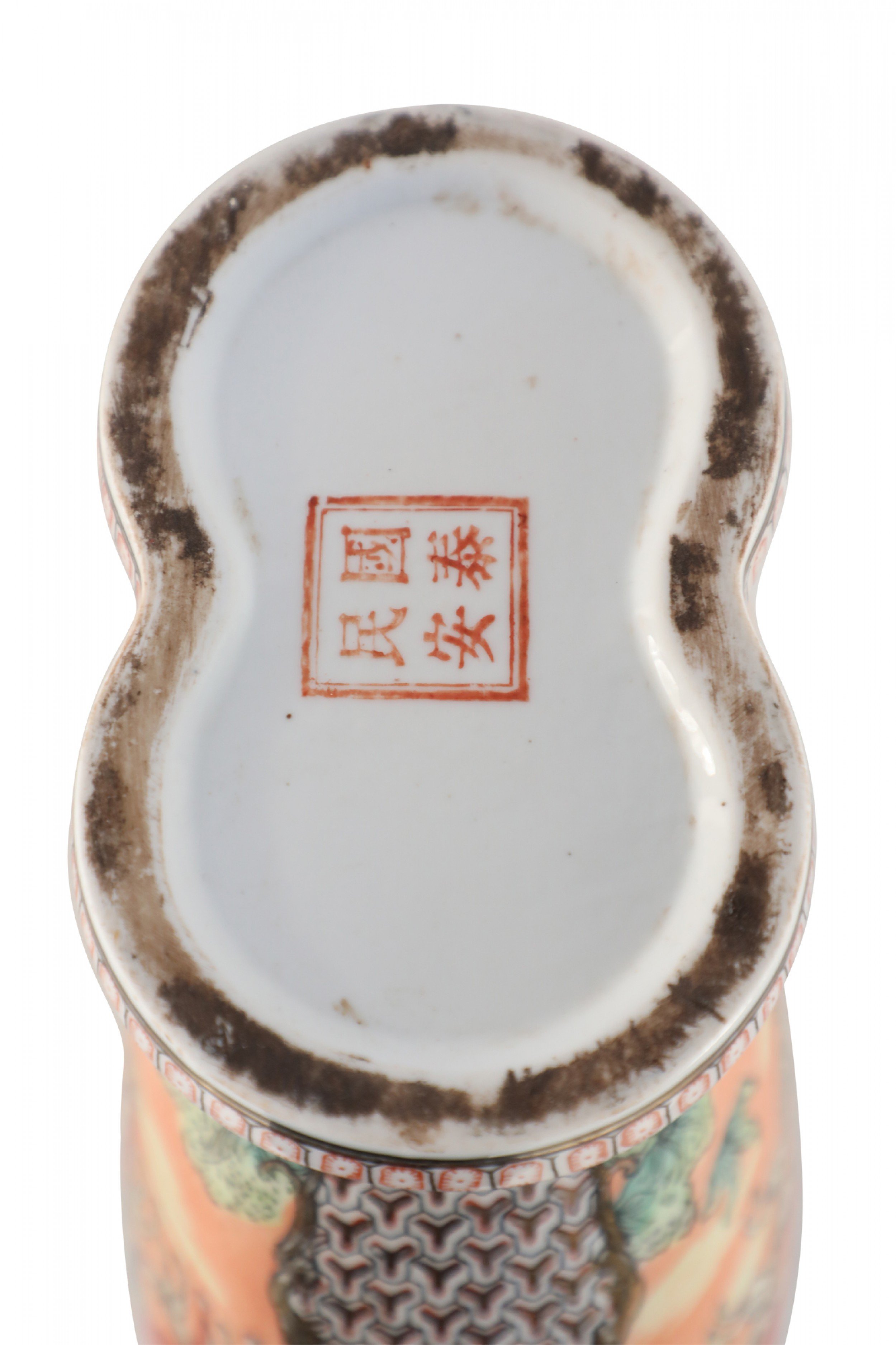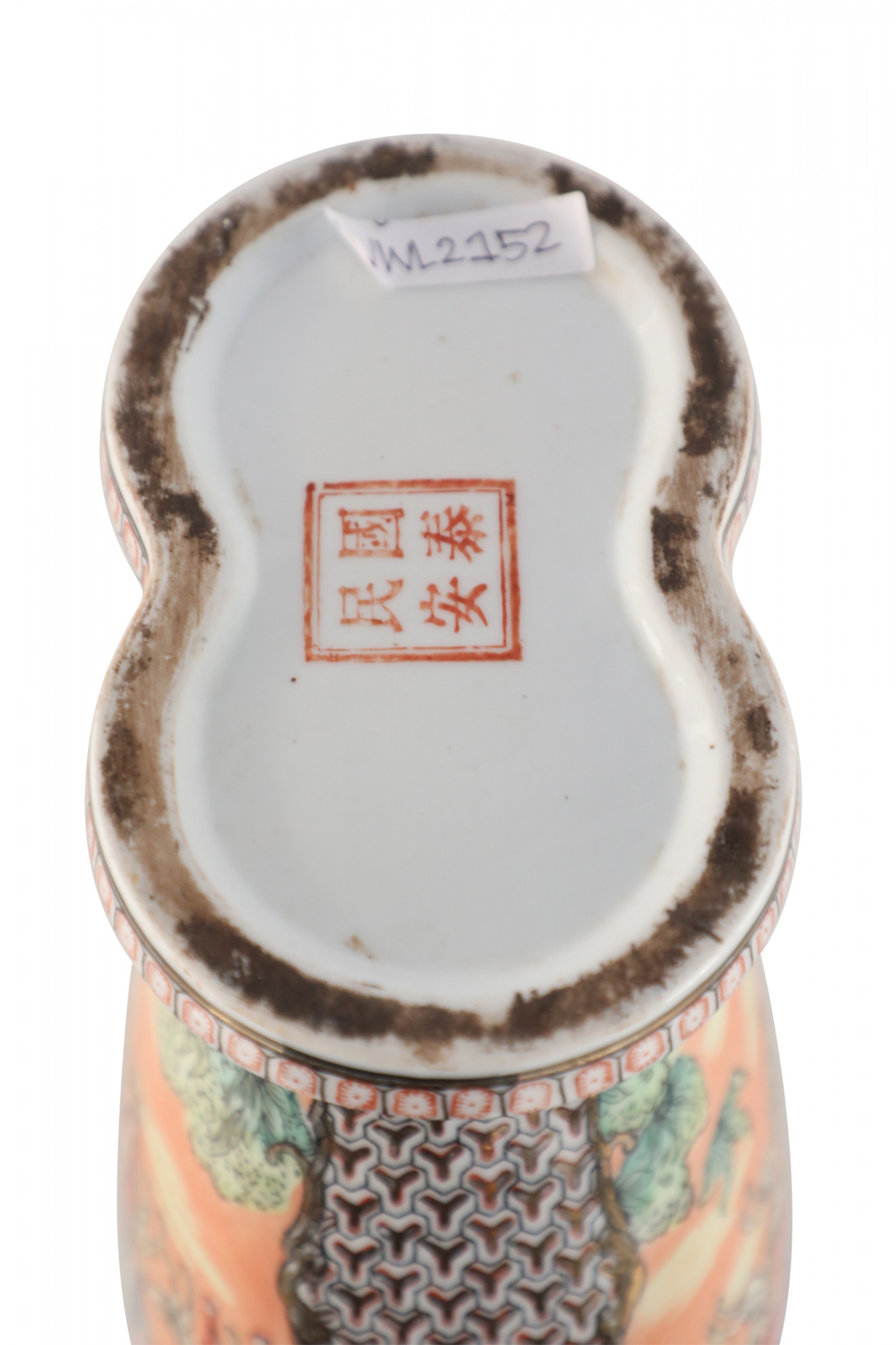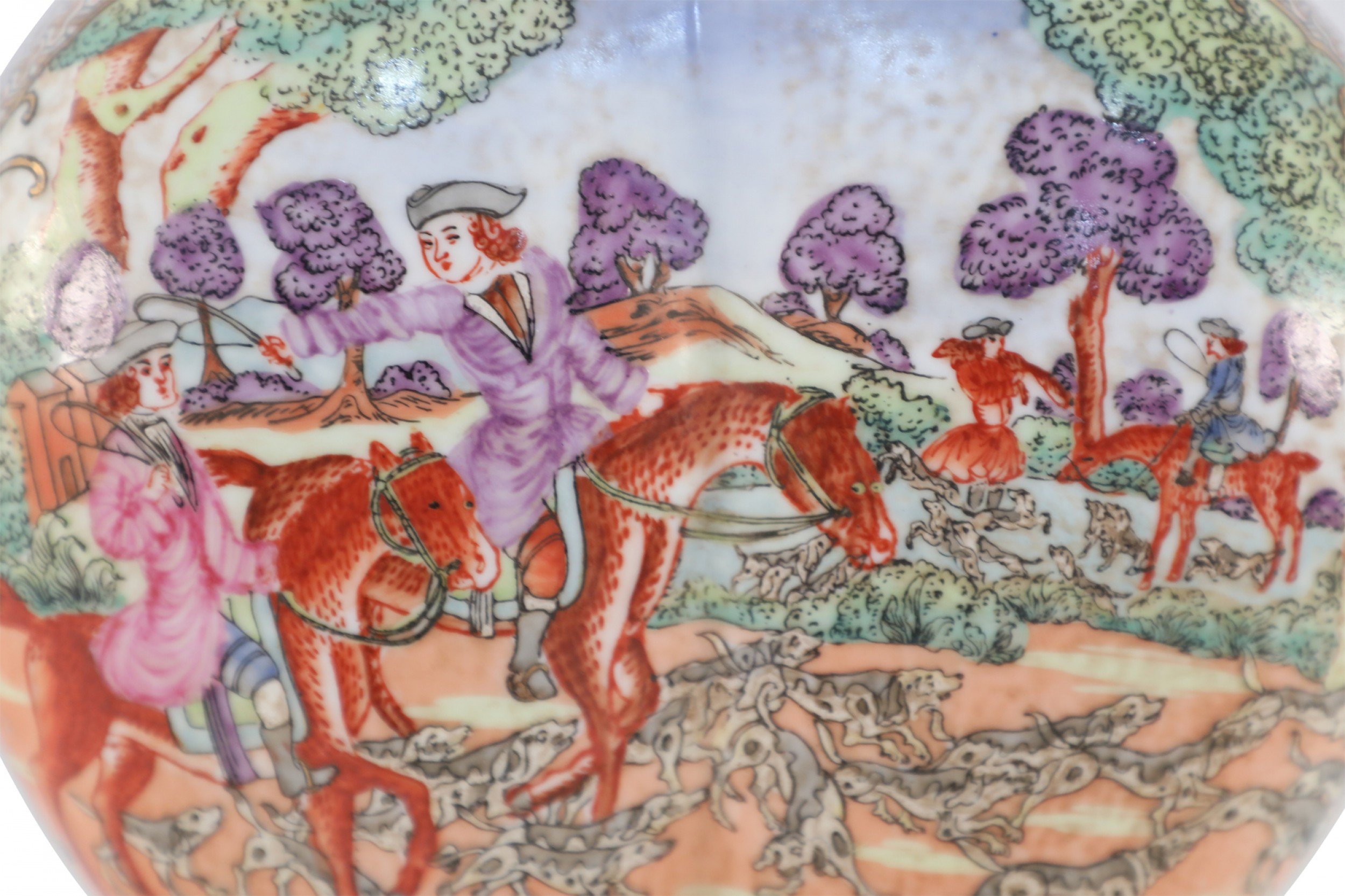 Antique Chinese (Early 20th Century) Guangzhou painted export porcelain vase with a conjoined form depicting a richly colored dog hunt scene between gold-patterned bands. (Companion pieces: NWL2151).