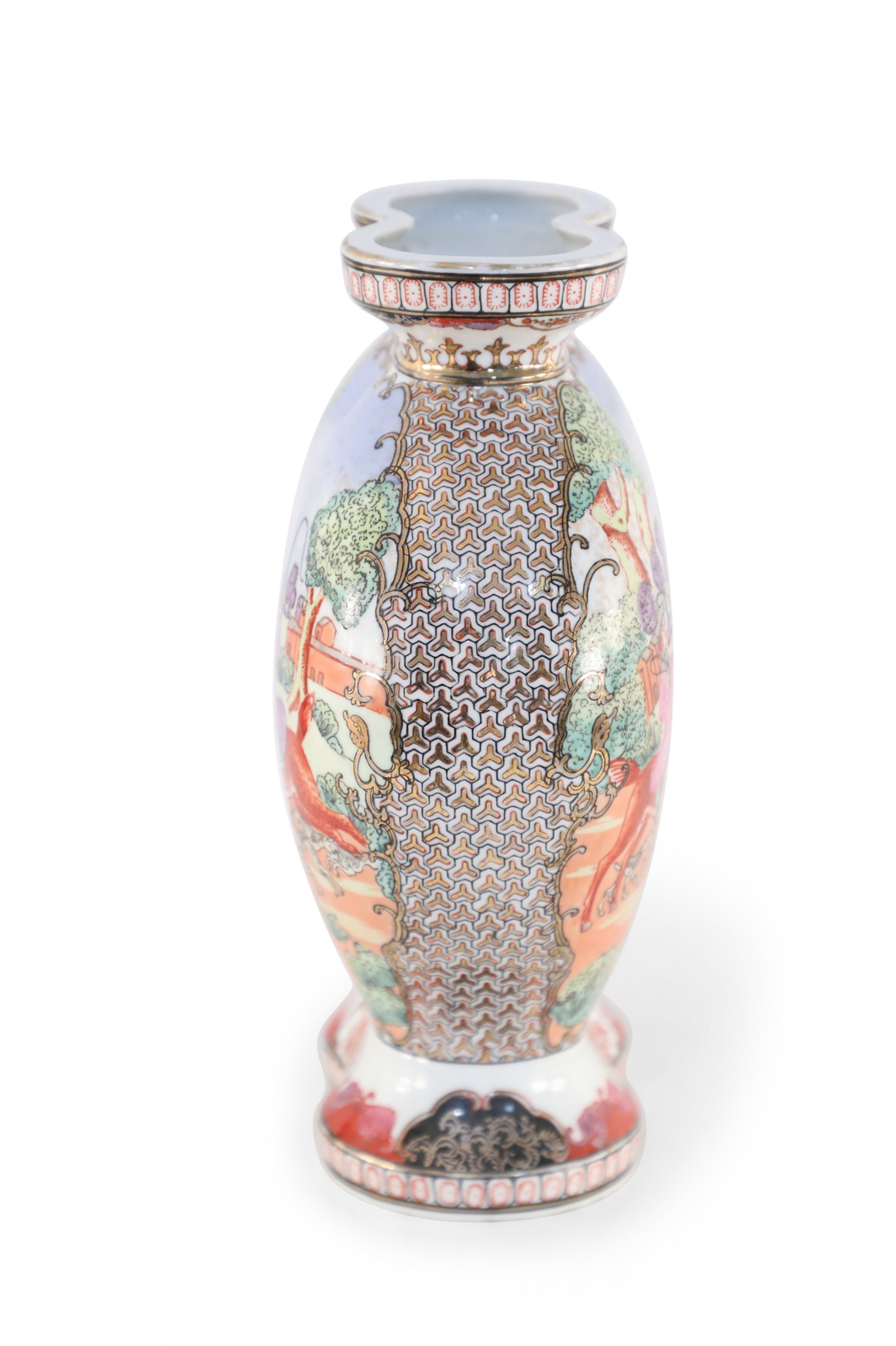 Antique Chinese (Early 20th Century) Guangzhou painted export porcelain vase with a conjoined form depicting a richly colored dog hunt scene between gold-patterned bands. (Companion pieces: NWL2151)