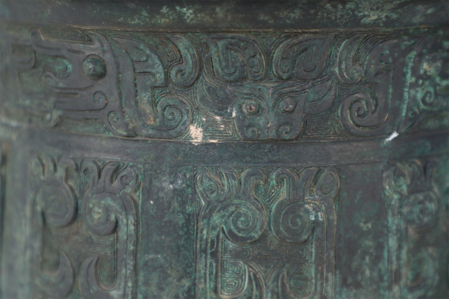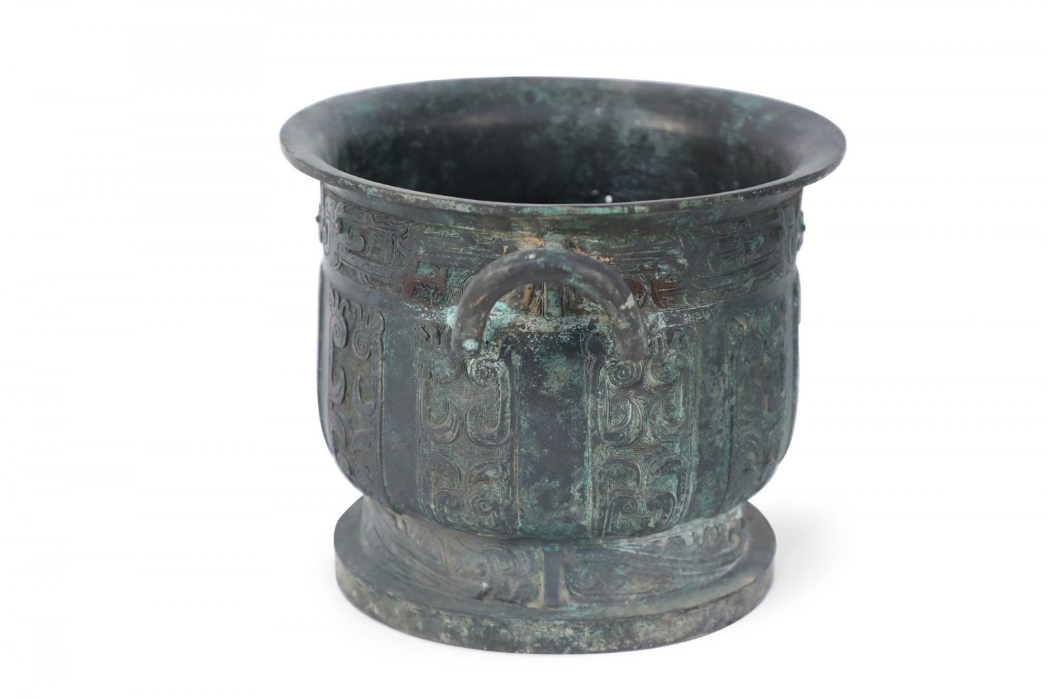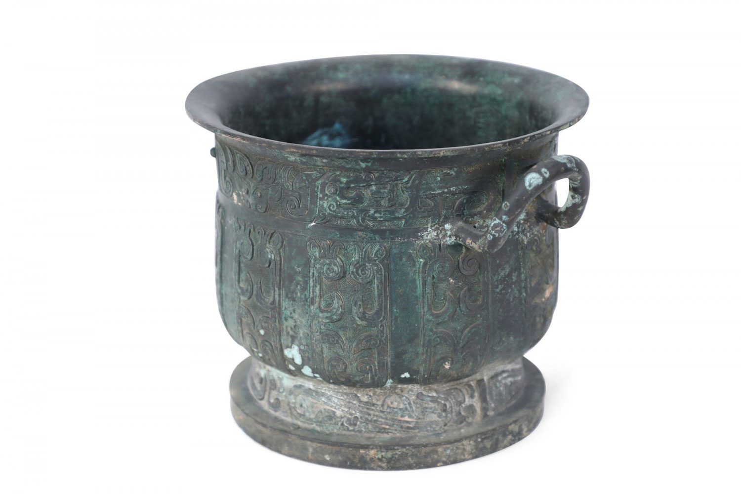 Antique Chinese Han Dynasty-style copy of a patinated bronze urn carved with raised geometric patterned bands wrapping its form, sitting atop a round foot, and fitted with two curved, upright handles.
