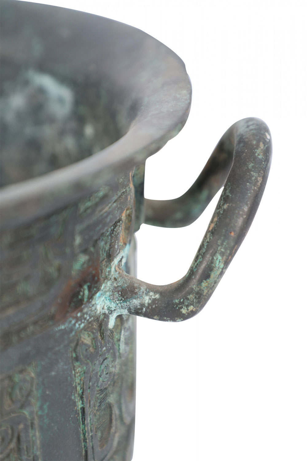 Antique Chinese Han Dynasty-style copy of a patinated bronze urn carved with raised geometric patterned bands wrapping its form, sitting atop a round foot, and fitted with two curved, upright handles..