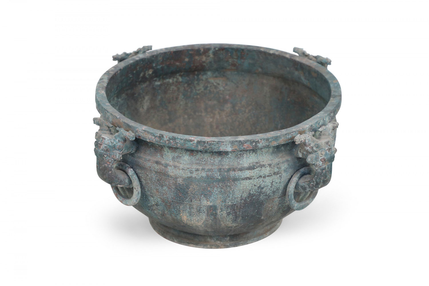 Antique Chinese Han Dynasty-style copy of a patinated bronze pot carved with geometric patterns wrapping its form and adorned with decorative door knocker ornamentation..