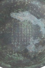 Antique Chinese Han Dynasty-style copy of a patinated bronze shallow bowl carved with raised geometric patterned bands wrapping the exterior, and an inscription on the bottom of the interior..