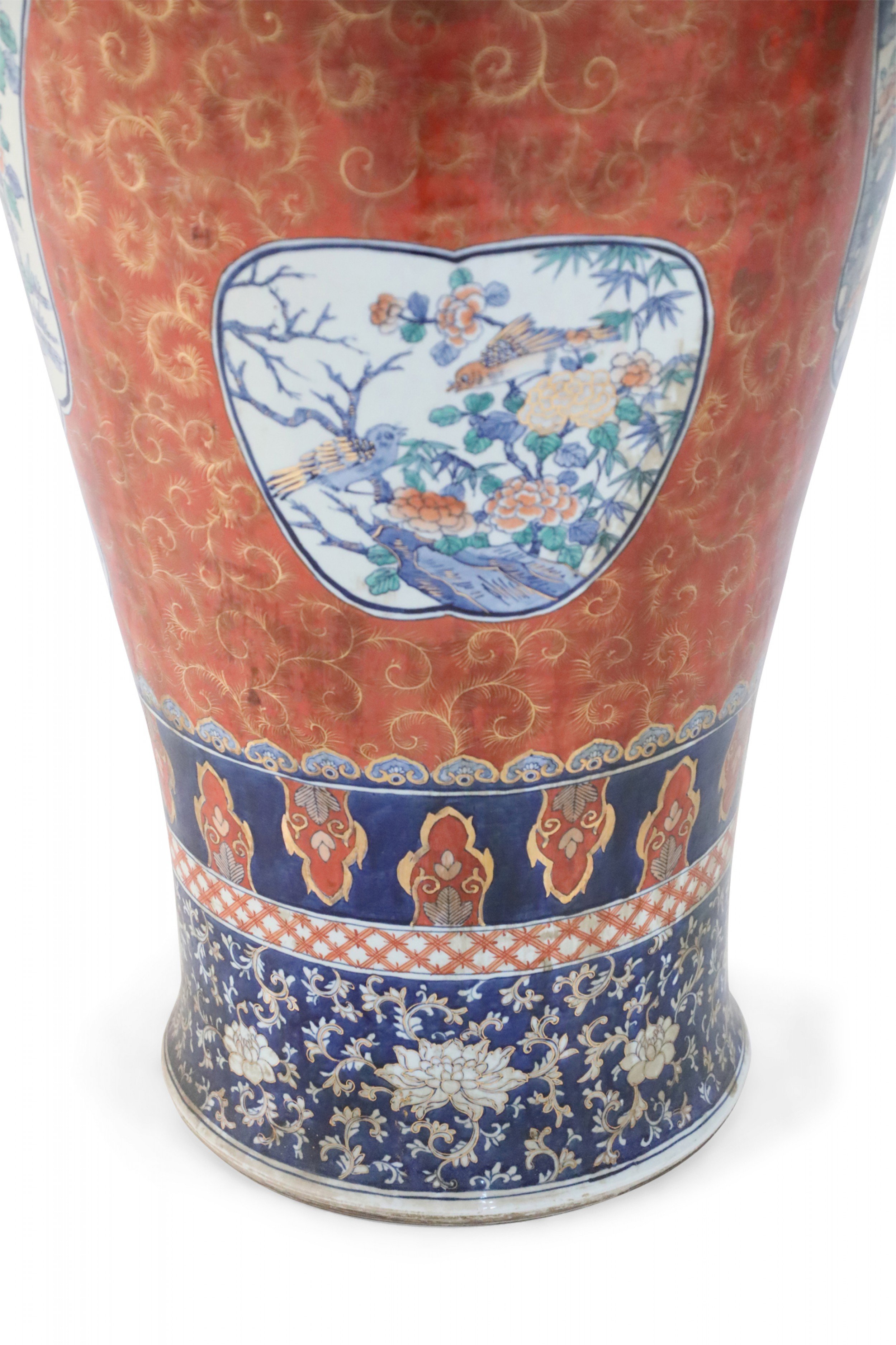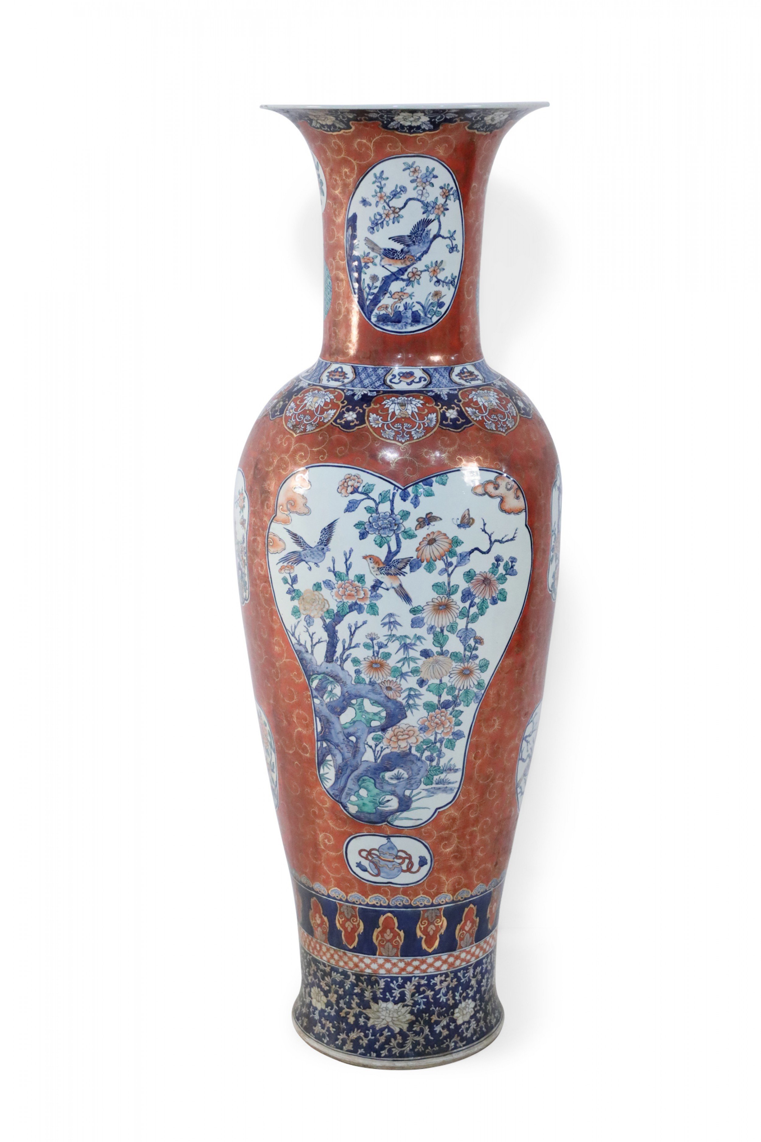Chinese orange, white and blue monumental floor vase celebrating Japanese Imari ware in both palette and design, decorated with medallions of blooming florals and birds.