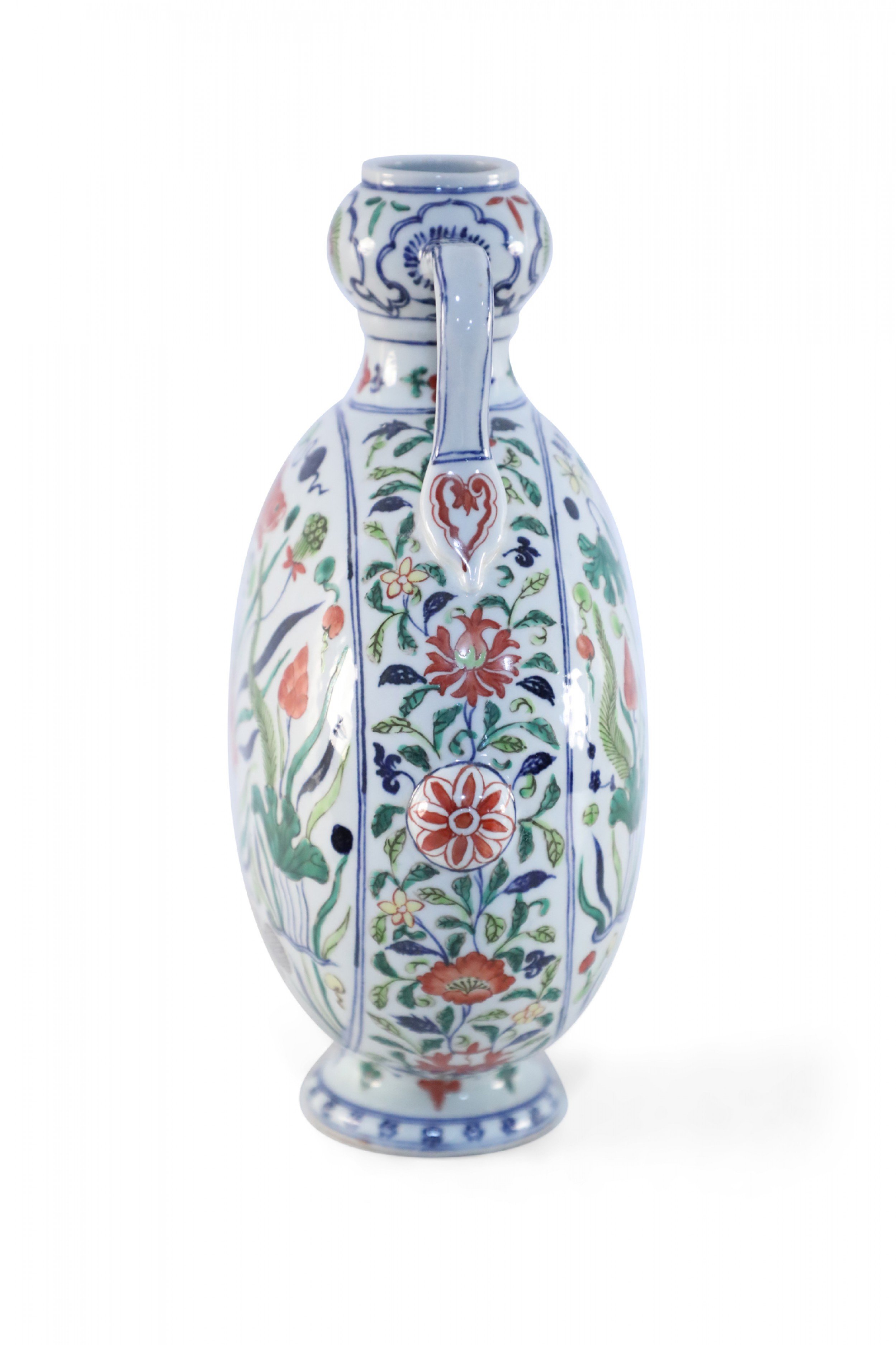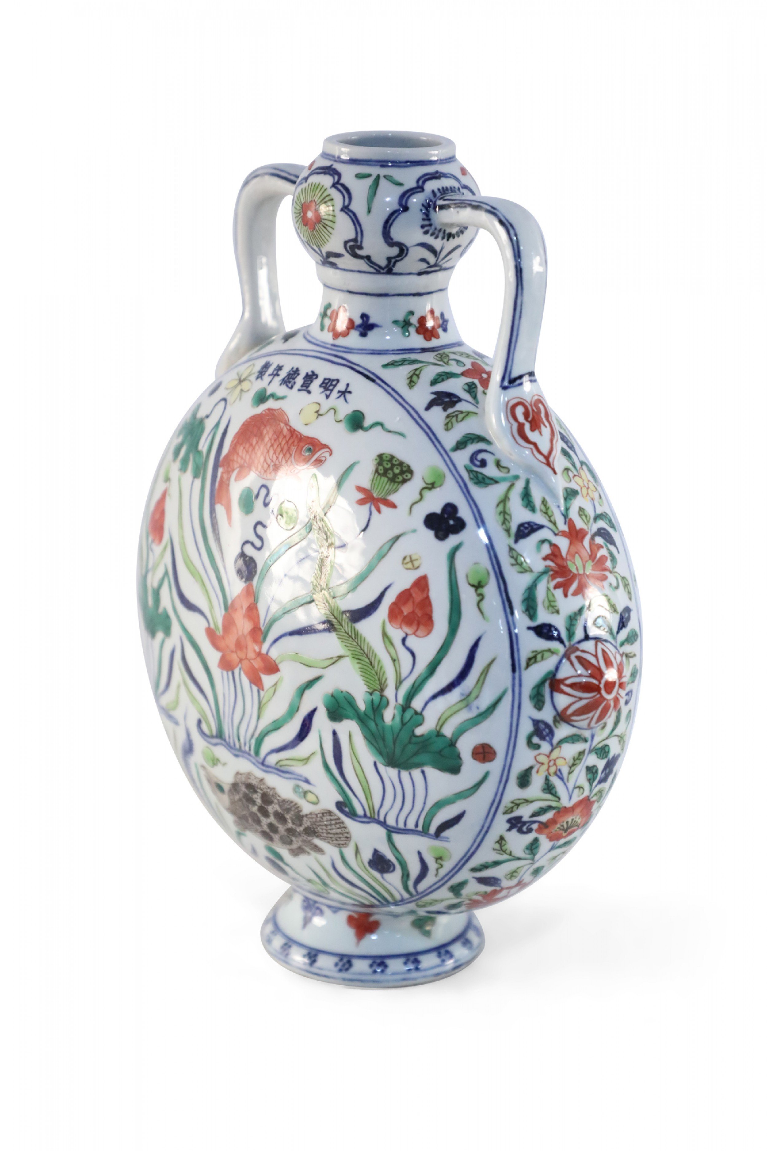 Antique Chinese (early 20th Century) white porcelain moon flask vase decorated with an underwater scene of seaweed, koi and turtles surrounded by flowers and topped with two handles.