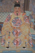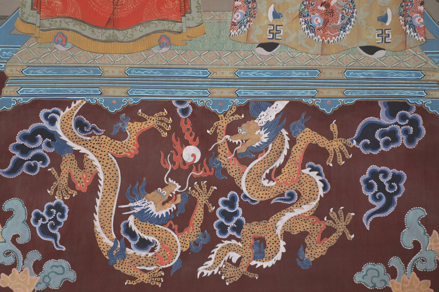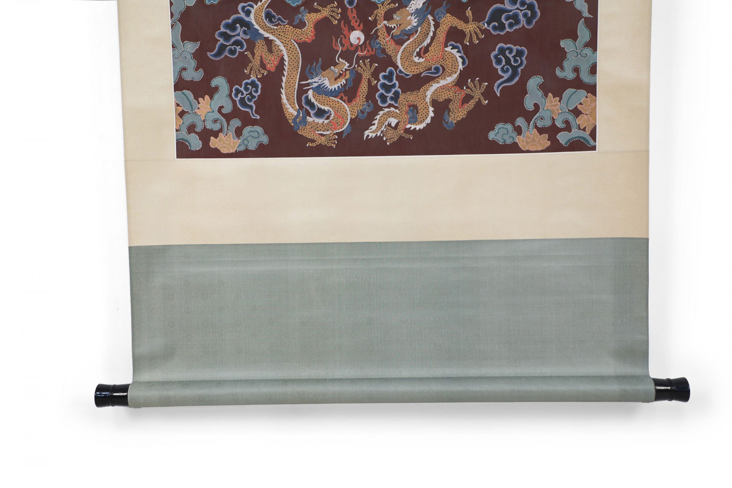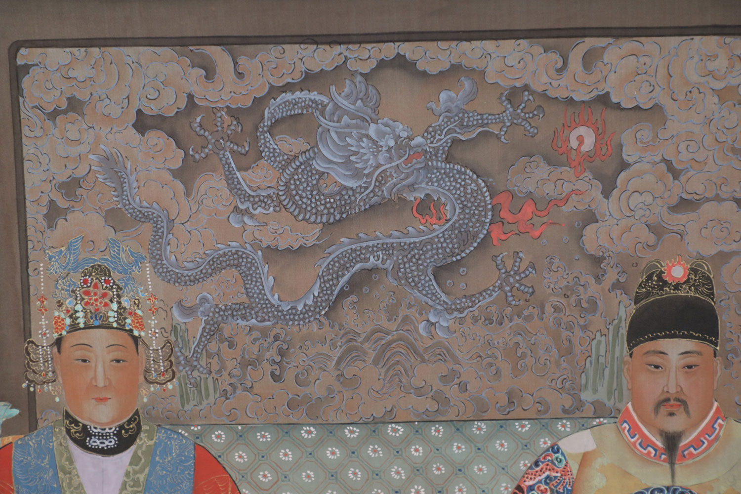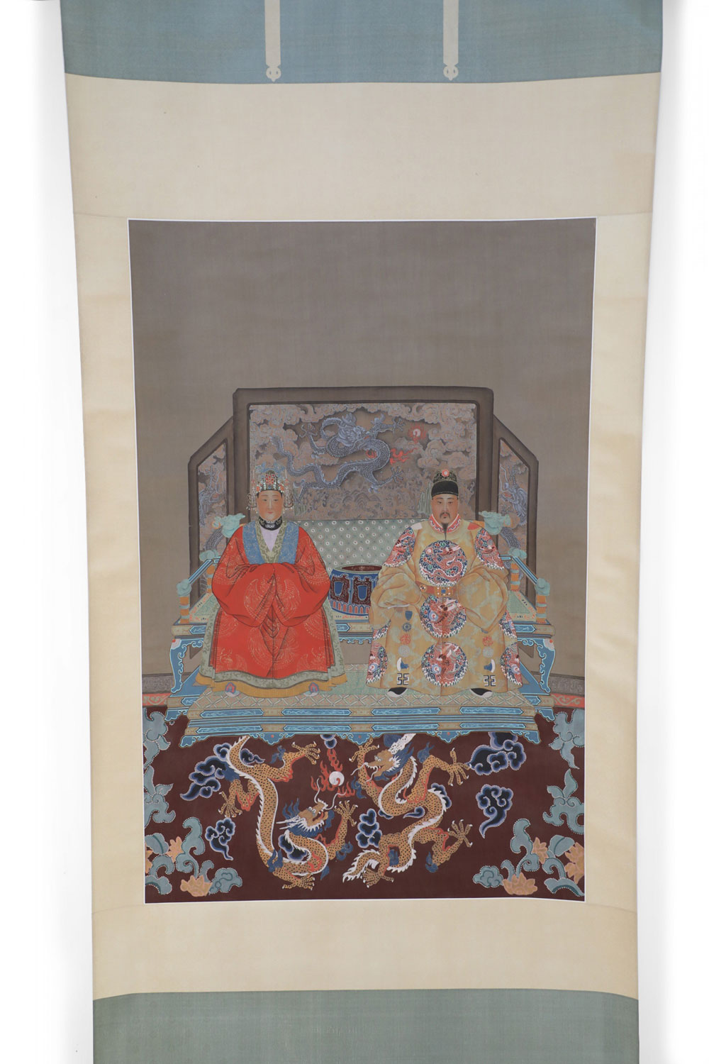 Set of 3 Ming King and Queen scroll wall hangings, shown seated with a paneled wall behind them and a brown rug with dragons underneath against a pale gold silk shantung background with tonal flowers and scroll designs with a sage green top and bottom. (PRICED EACH)
