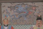Set of 3 Ming King and Queen scroll wall hangings, shown seated with a paneled wall behind them and a brown rug with dragons underneath against a pale gold silk shantung background with tonal flowers and scroll designs with a sage green top and bottom. (PRICED EACH).