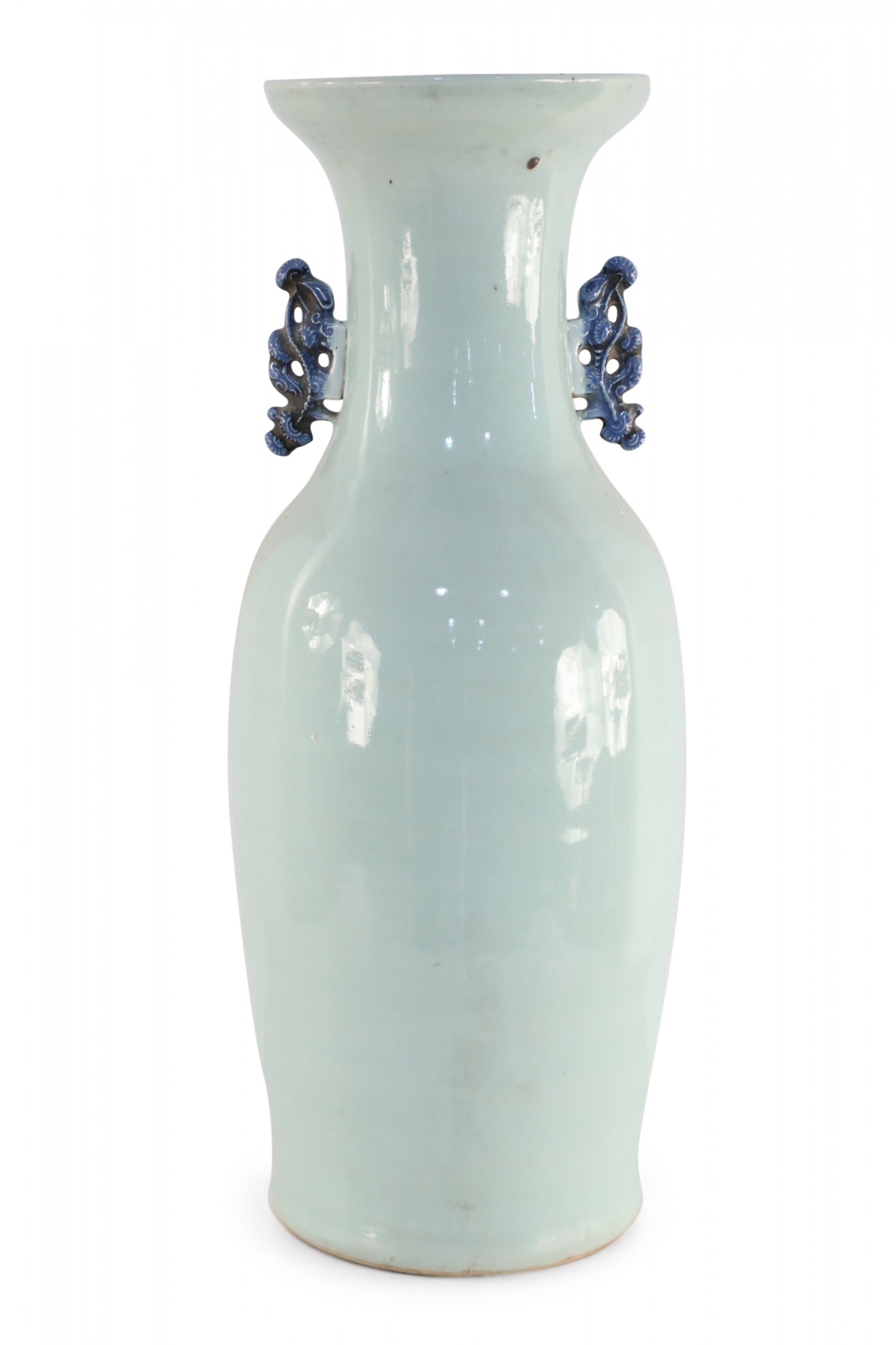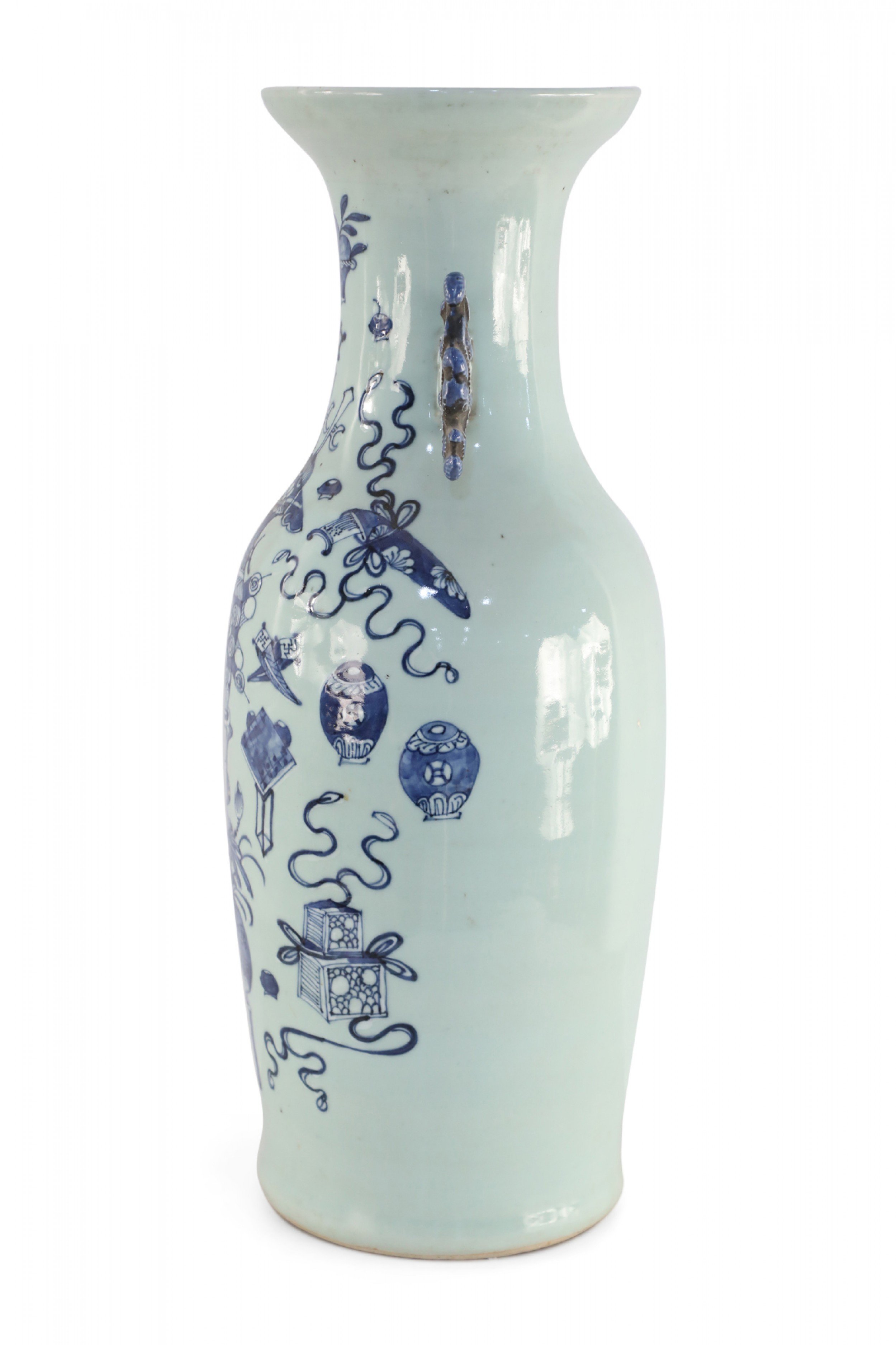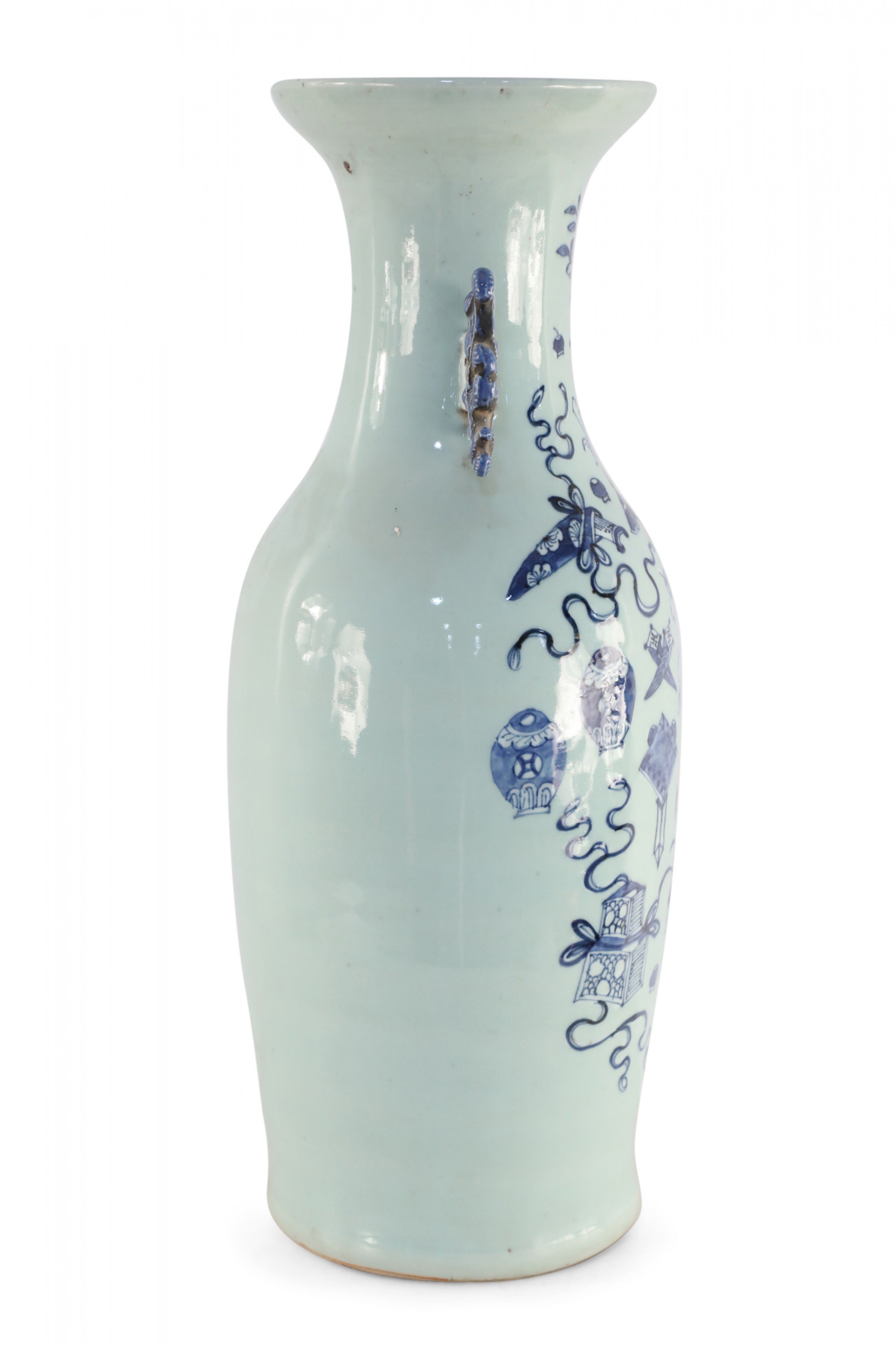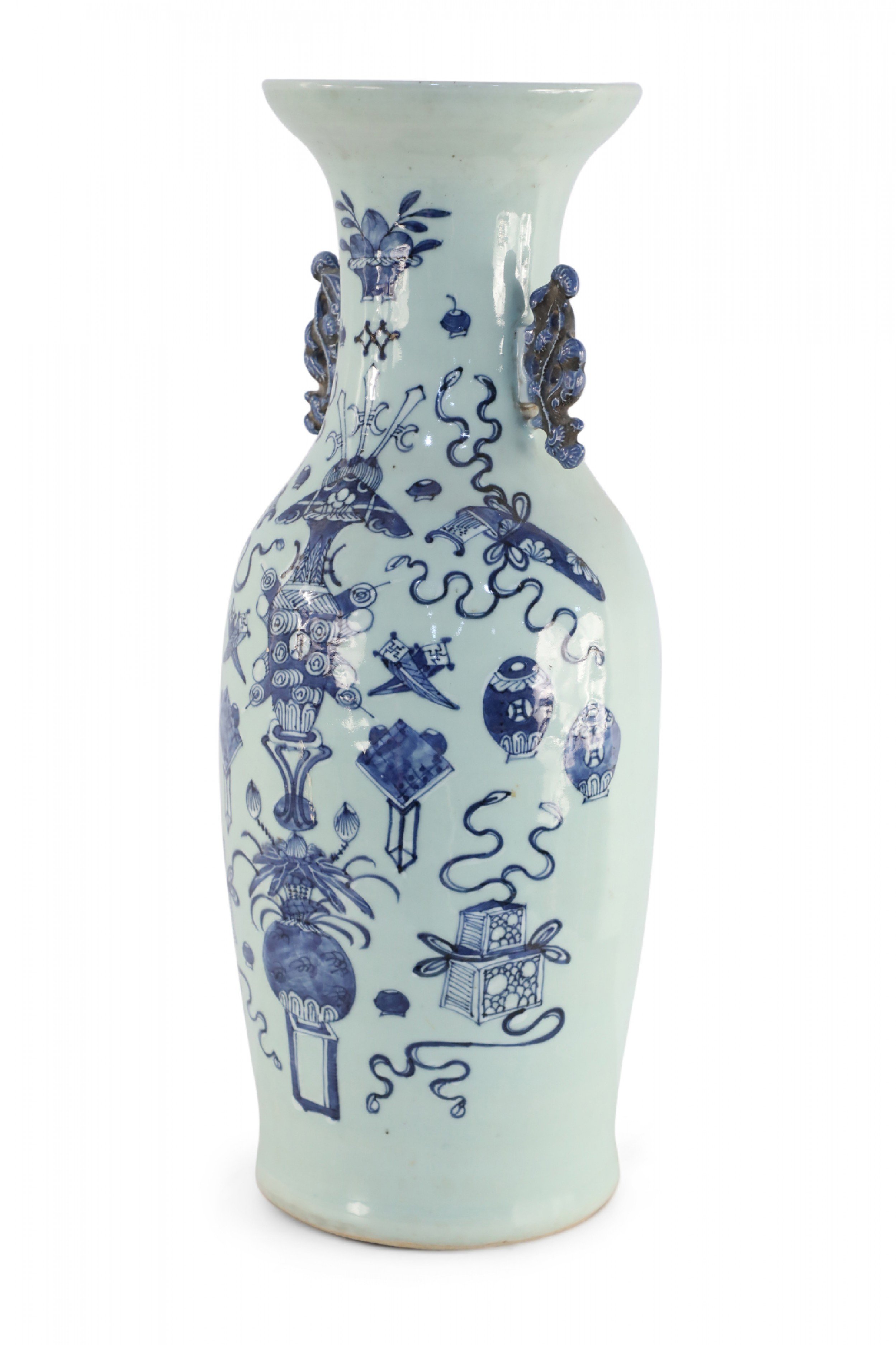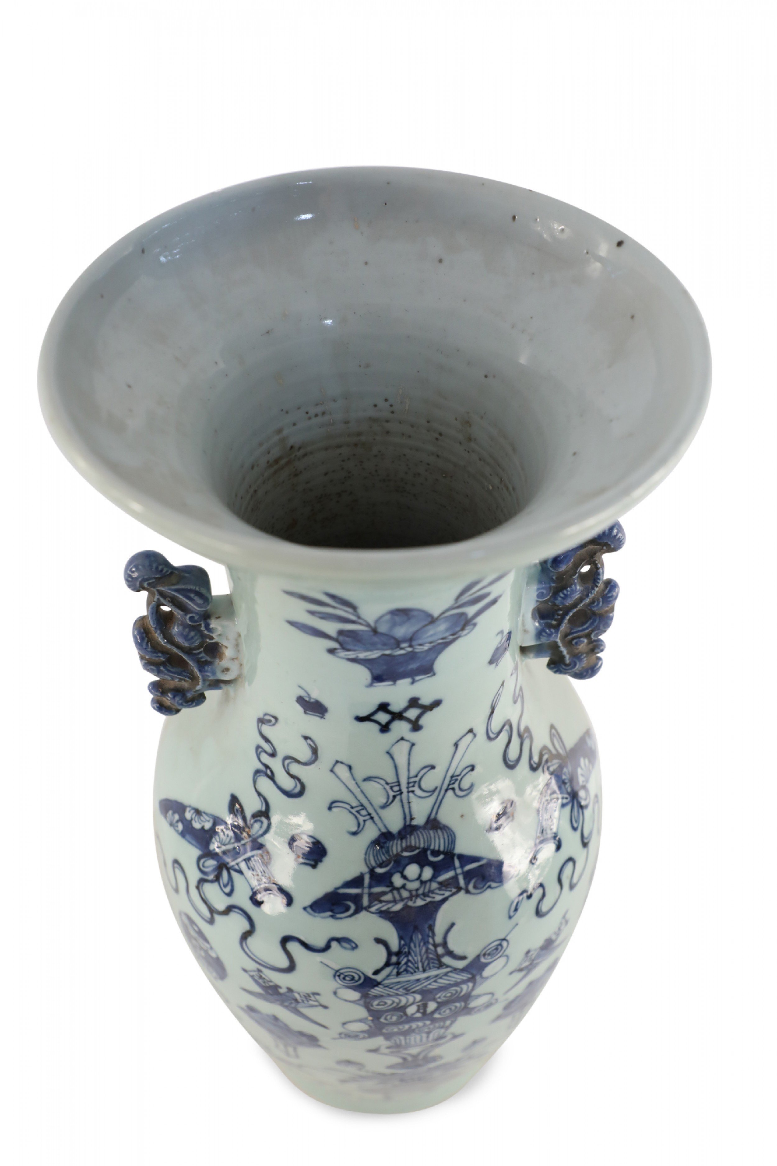 Antique Chinese (Late 19th Century) large, off-white porcelain urn painted with a blue pattern featuring Buddhist symbols and other shapes with accented blue scrolled handles.